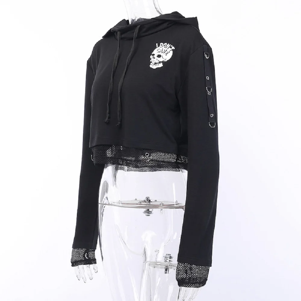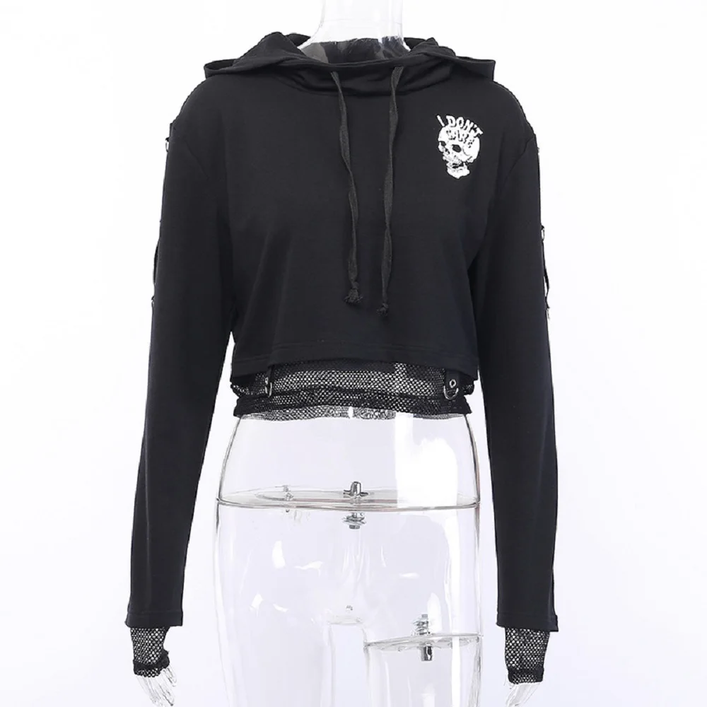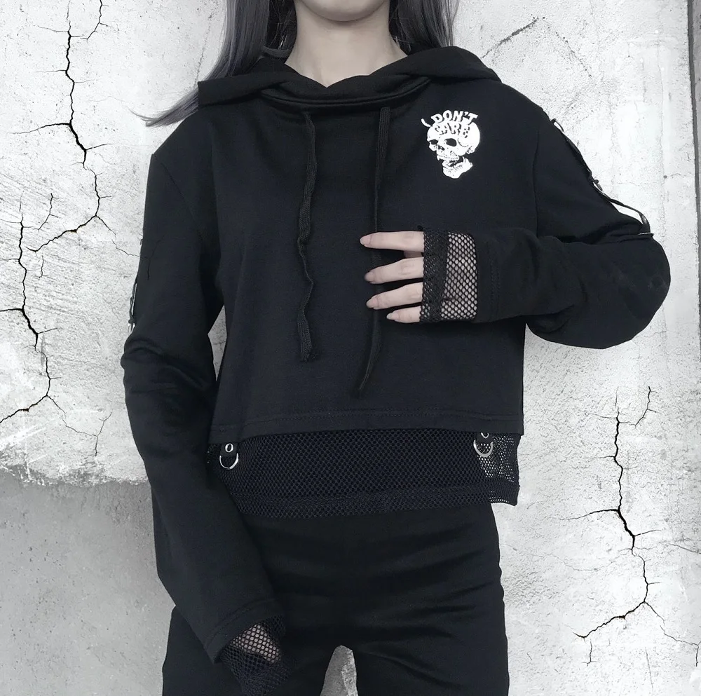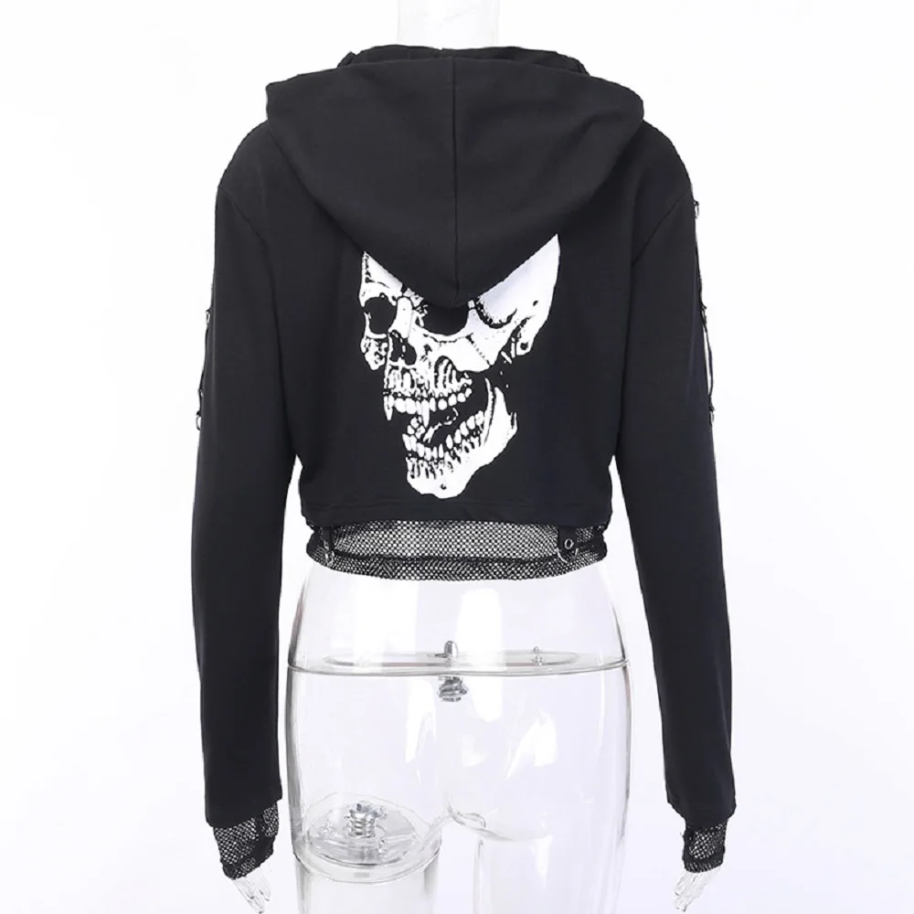 Женская укороченная толстовка с капюшоном, черная винтажная Толстовка в готическом стиле с принтом черепа, черная сетчатая Свободная кофта в стиле пэчворк, 2019