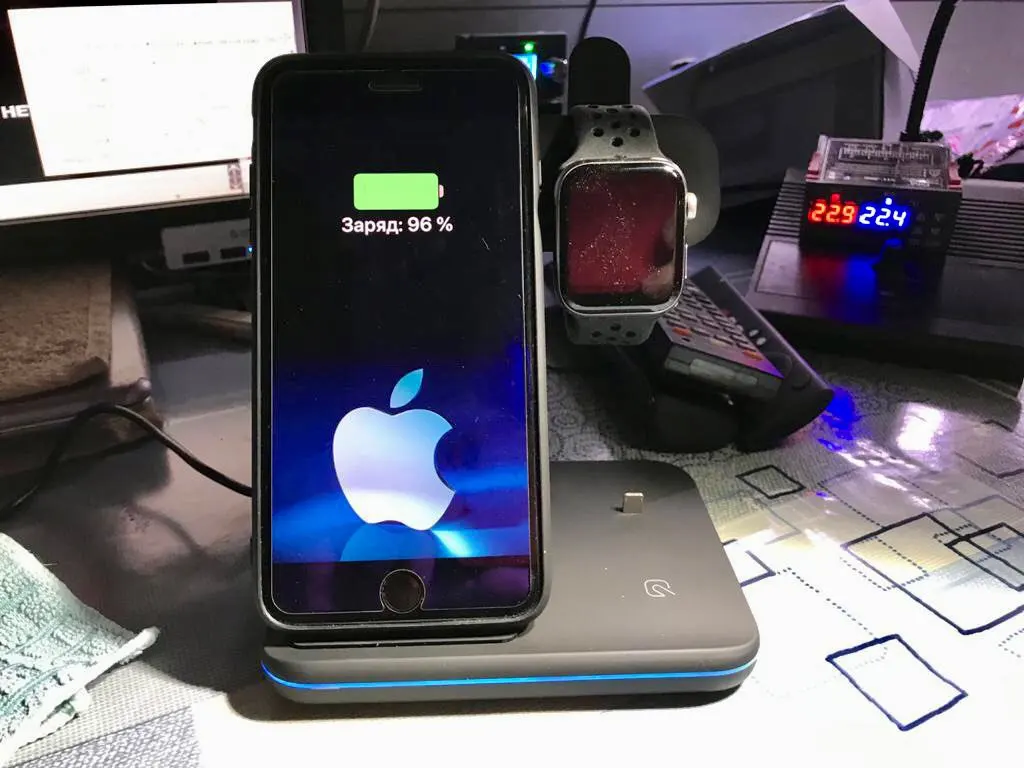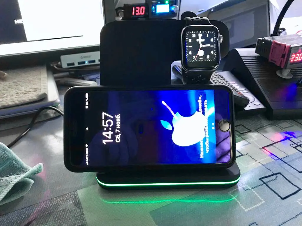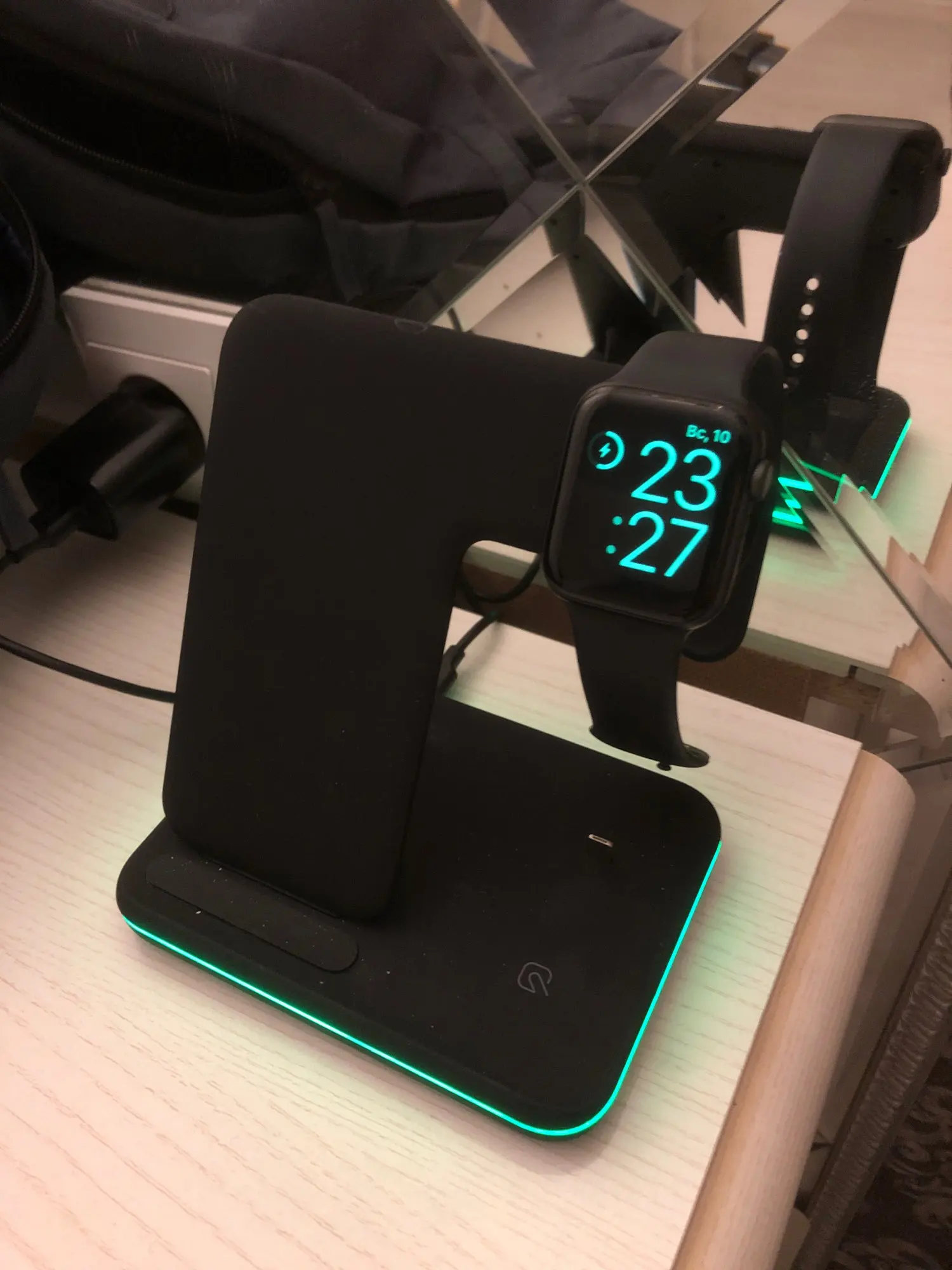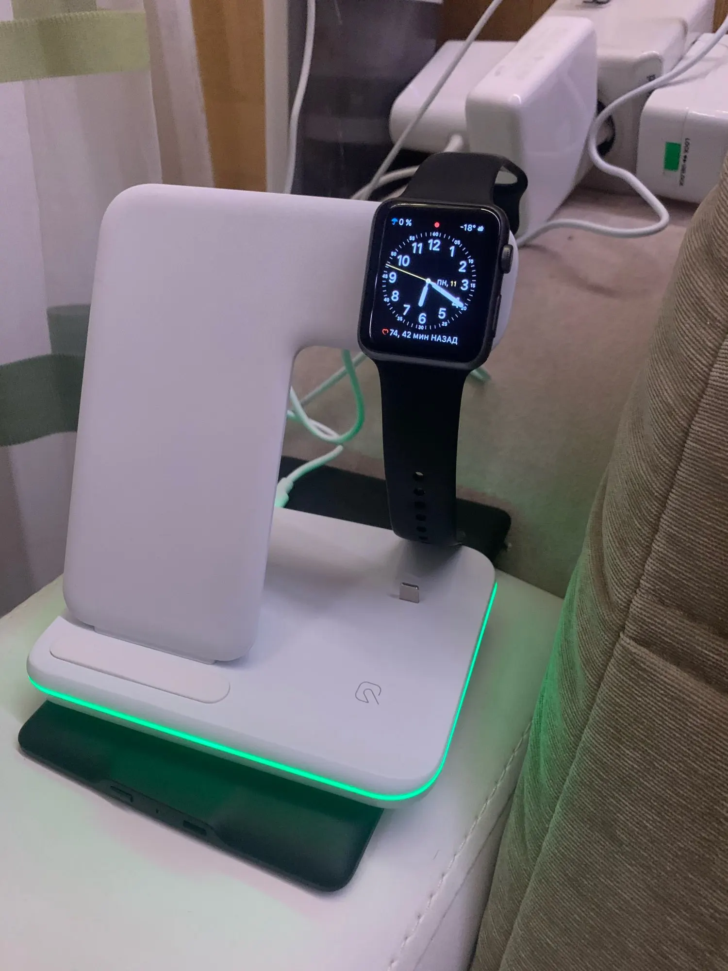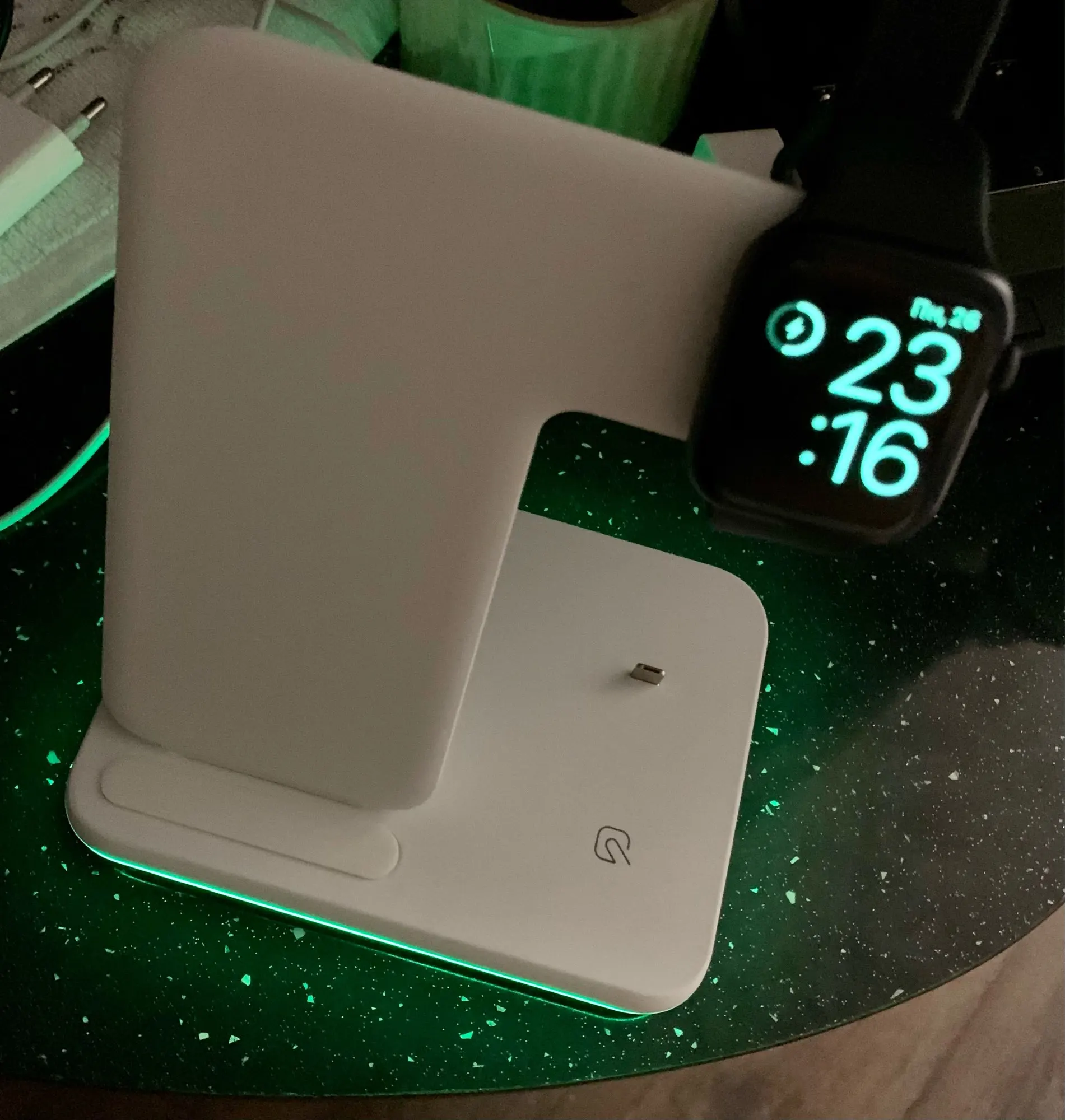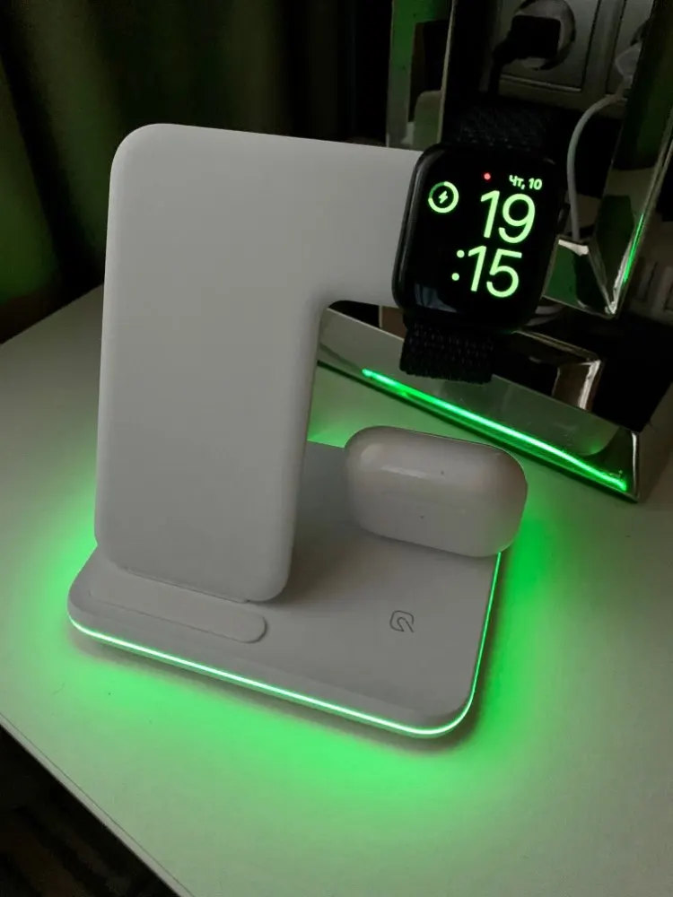 Станцией довольна, телефон заряжает через чехол, наушники и часы тоже. Довольна. Есть зелёная и голубая подсветка.