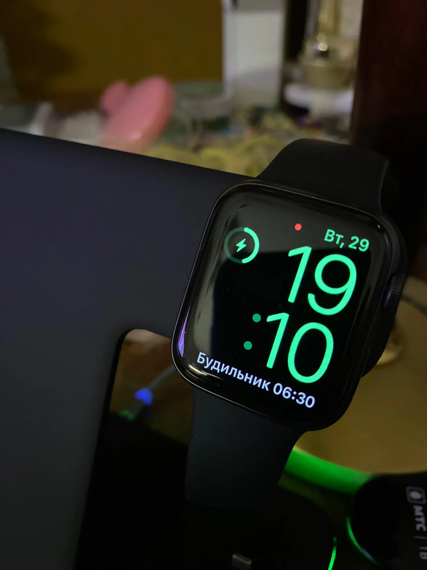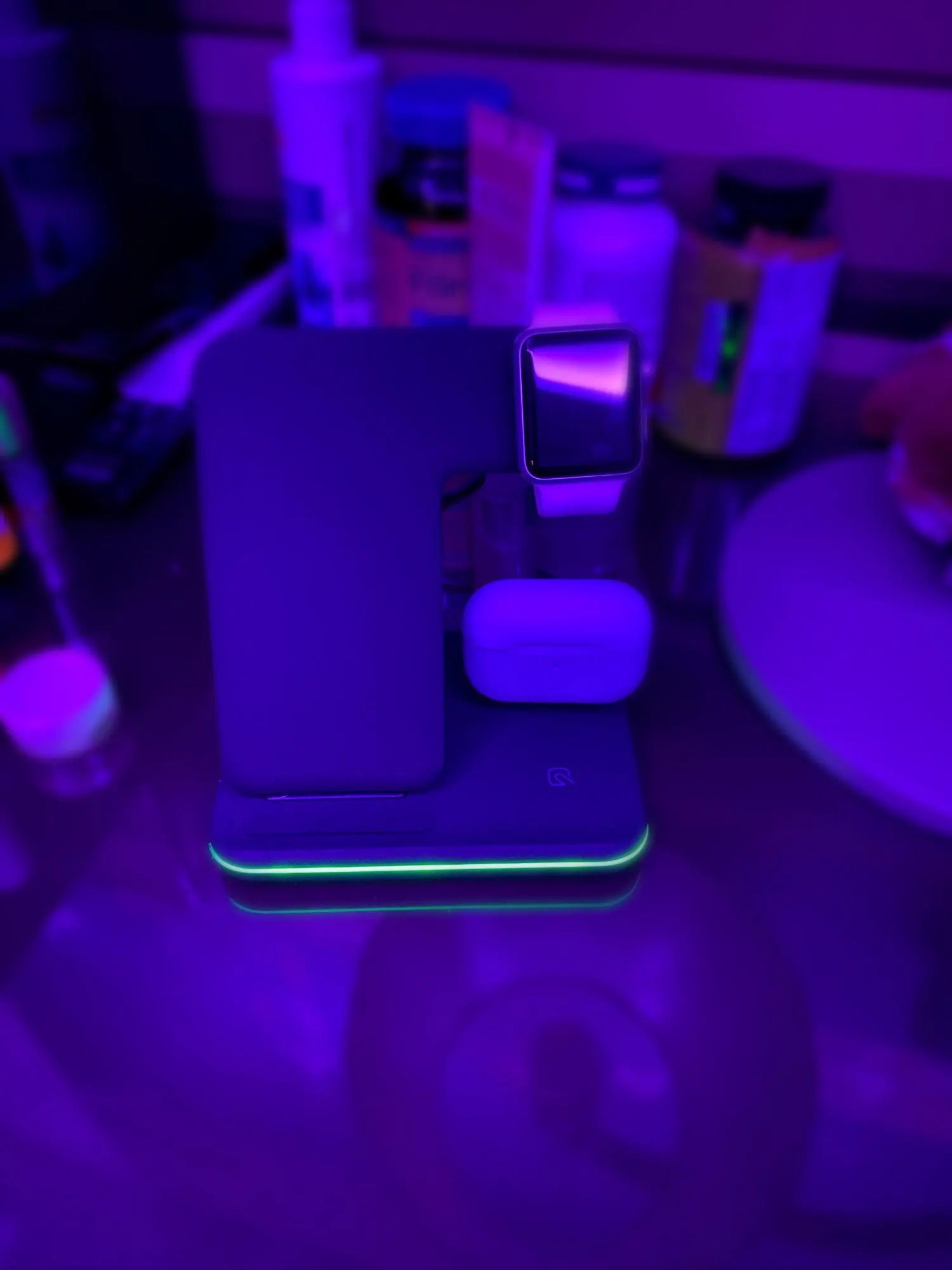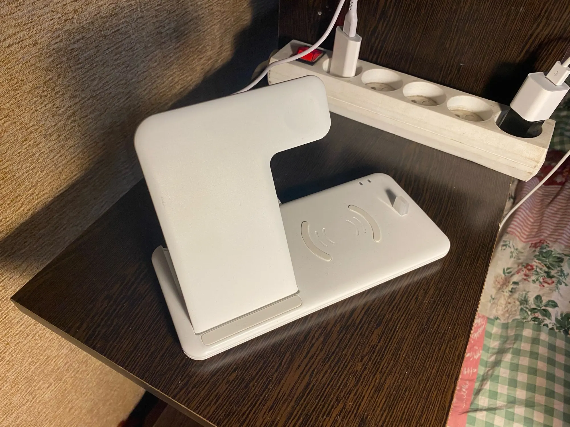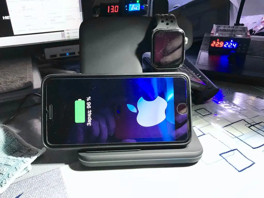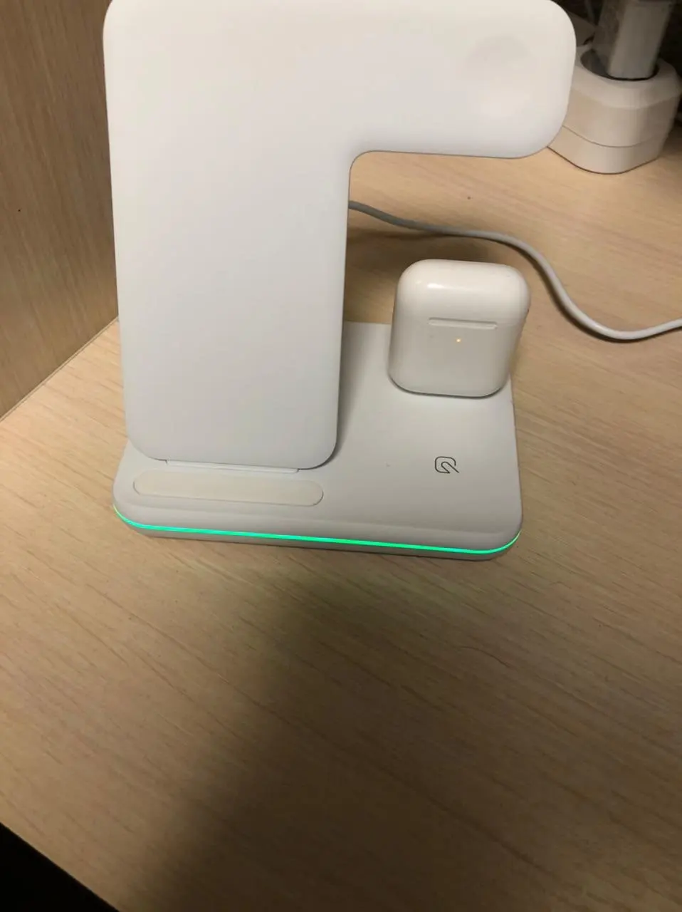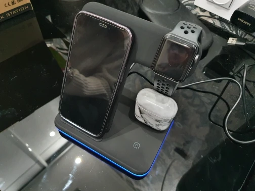 Станцией довольна, телефон заряжает через чехол, наушники и часы тоже. Довольна. Есть зелёная и голубая подсветка.