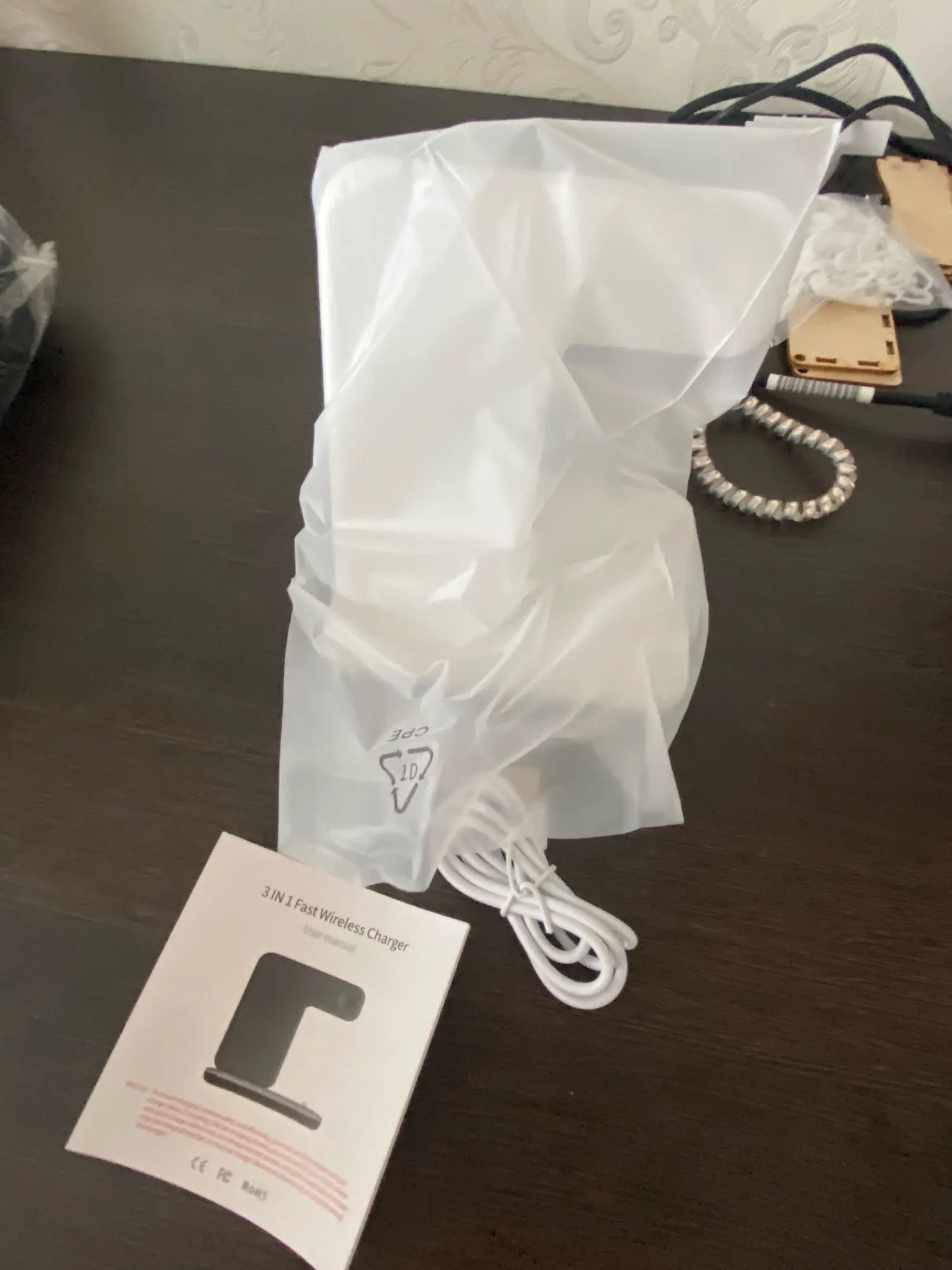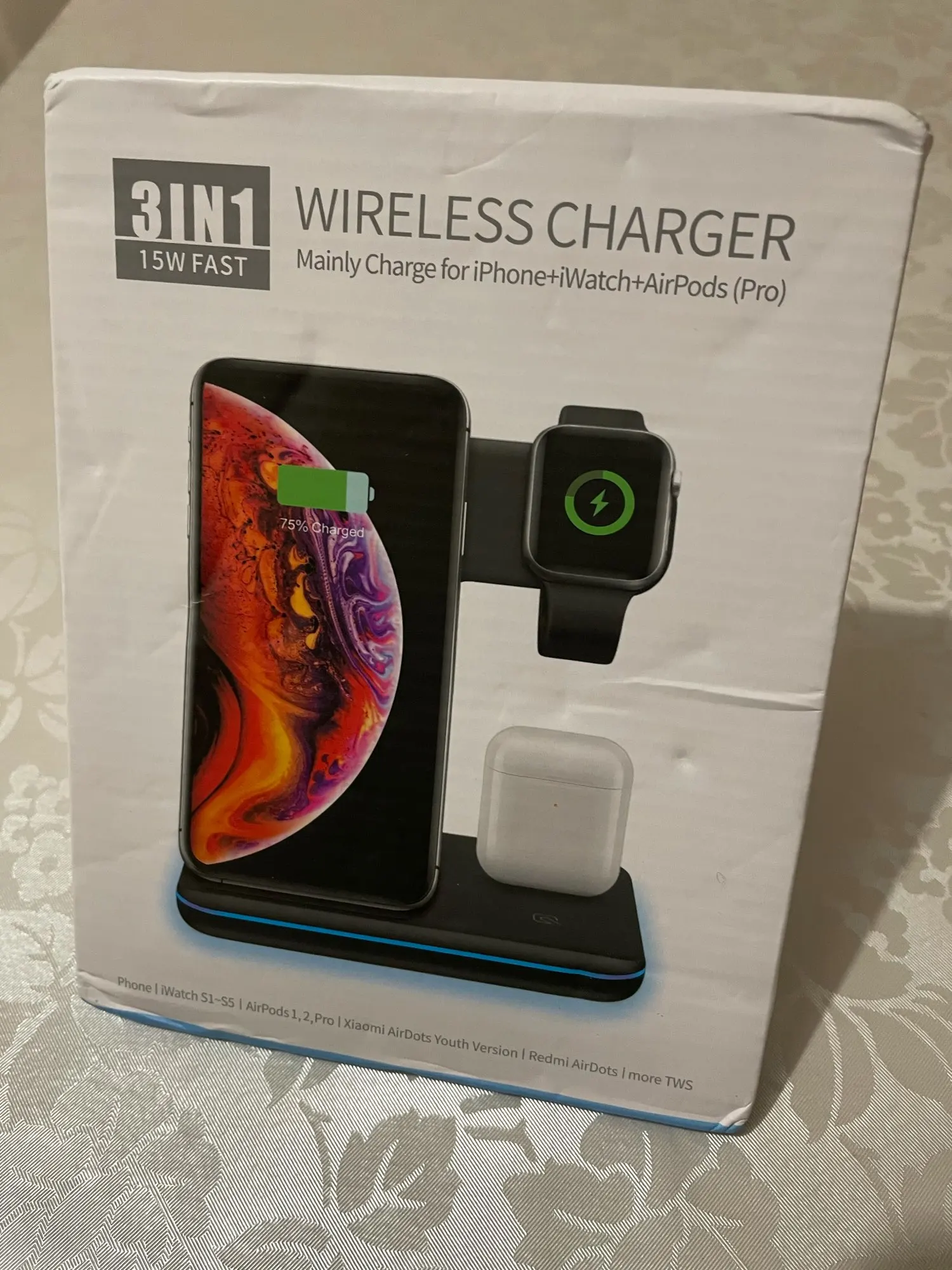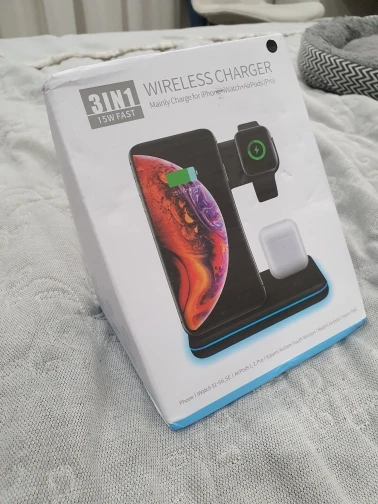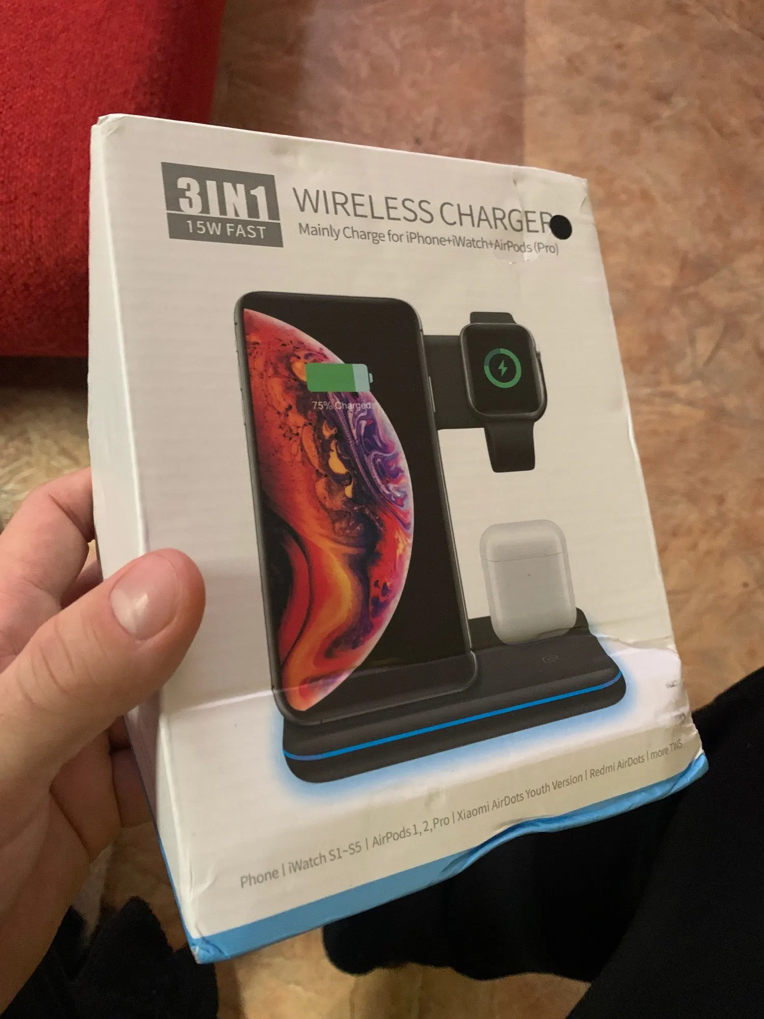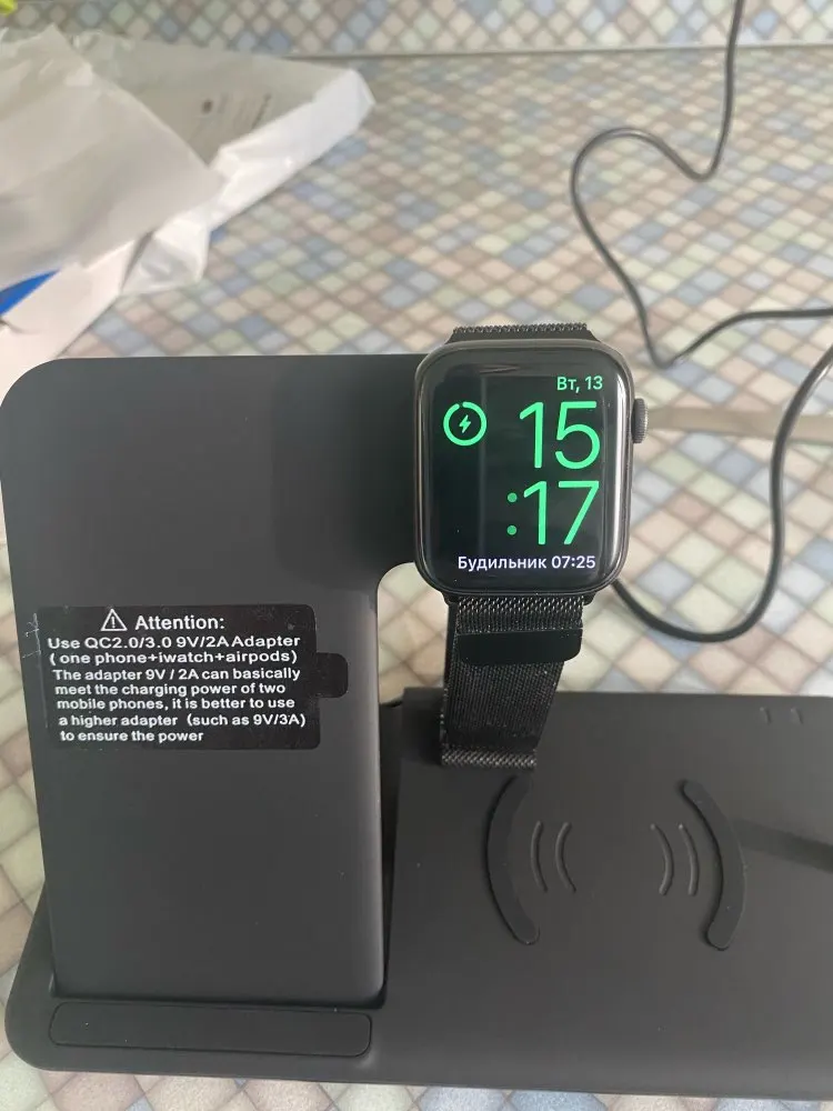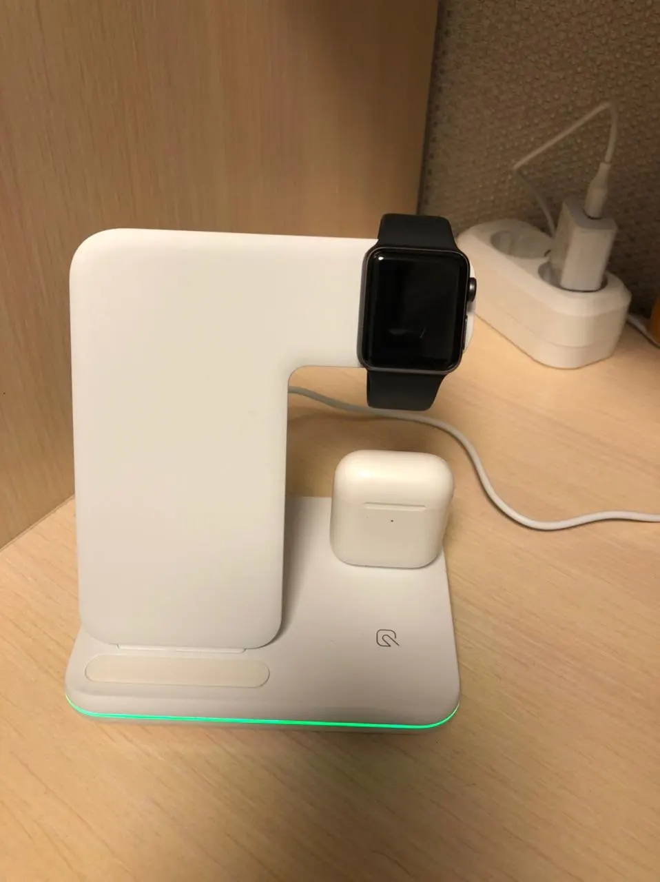 Зарядное устройство 3 в 1 не совсем правильное,так как работает только телефон, но заряд очень долгий и начинает греться,часы и наушники не реагируют на заряд совсем, так что делайте выводы сами при покупки этого товара, на фото есть доказательства того что заряжает только телефон.