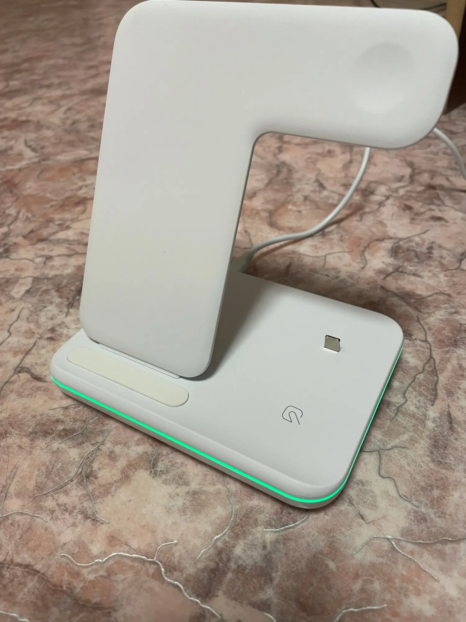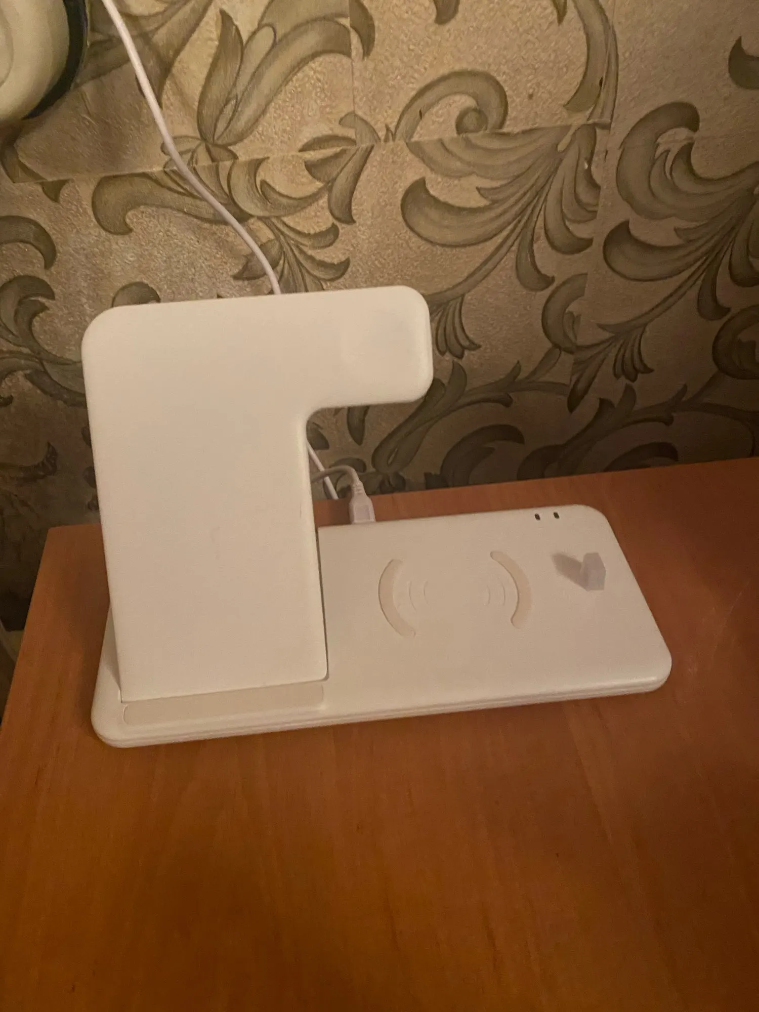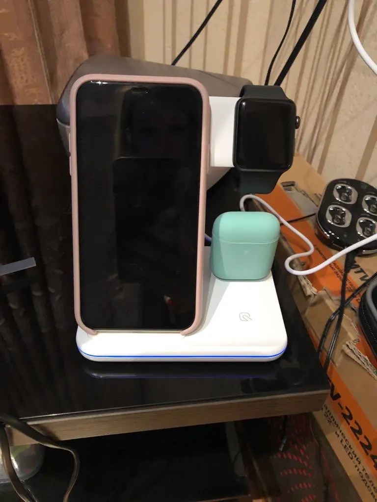 Быстрая доставка, ооооочень довольны заказом!!! Один шнур питания и 3 устройства заряжаются. Выглядит стильно и красиво, понравилась подсветка. Подстанцией можно включить или выключить, синий цвет сообщает о зарядке, зелёный о готовности устройств