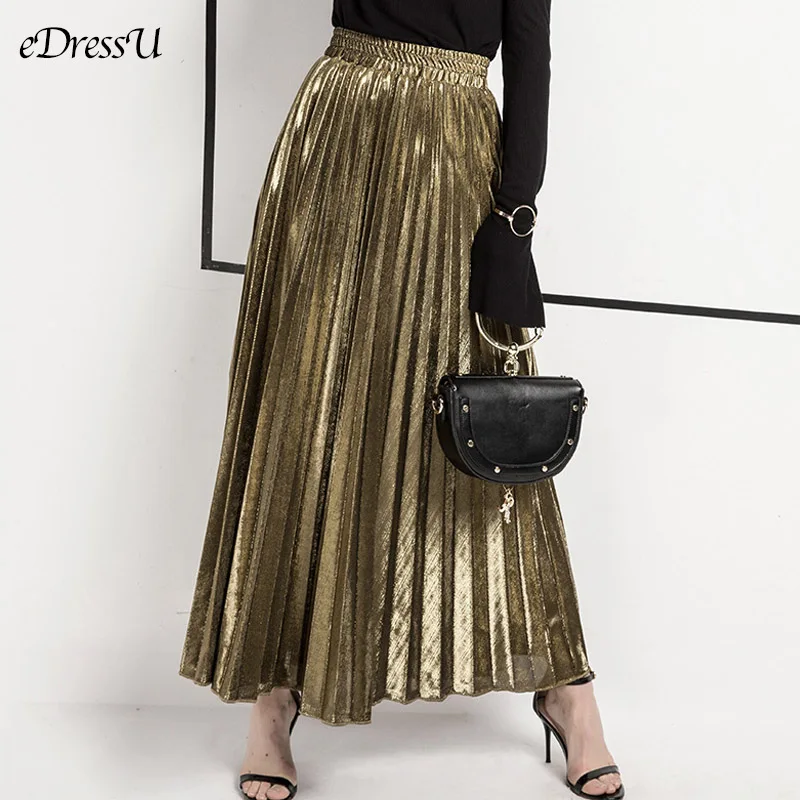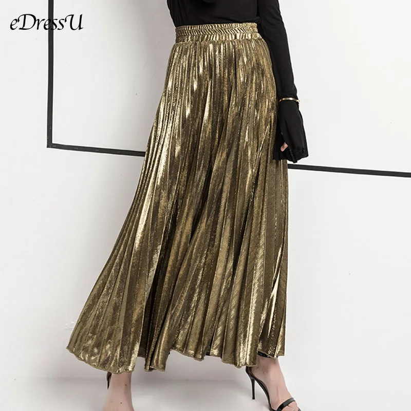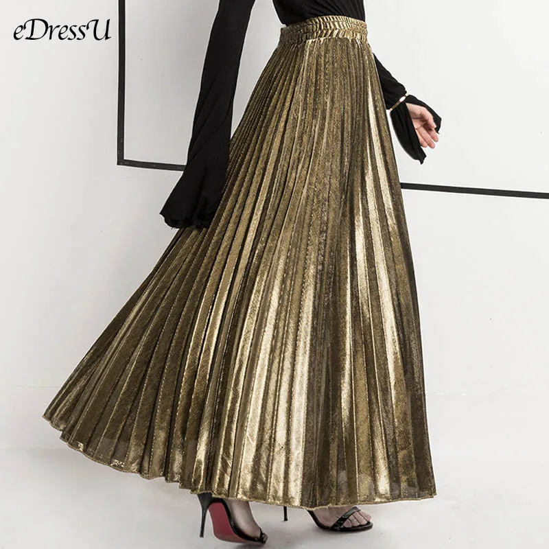 Женская плиссированная юбка макси с металлическим блеском, длинная ...