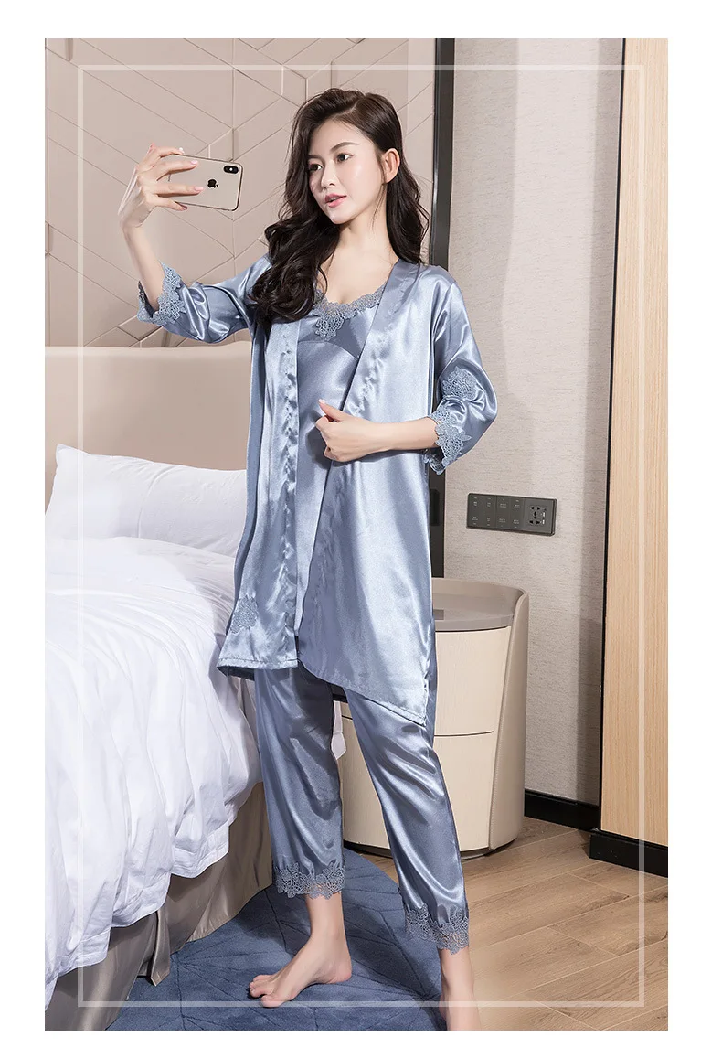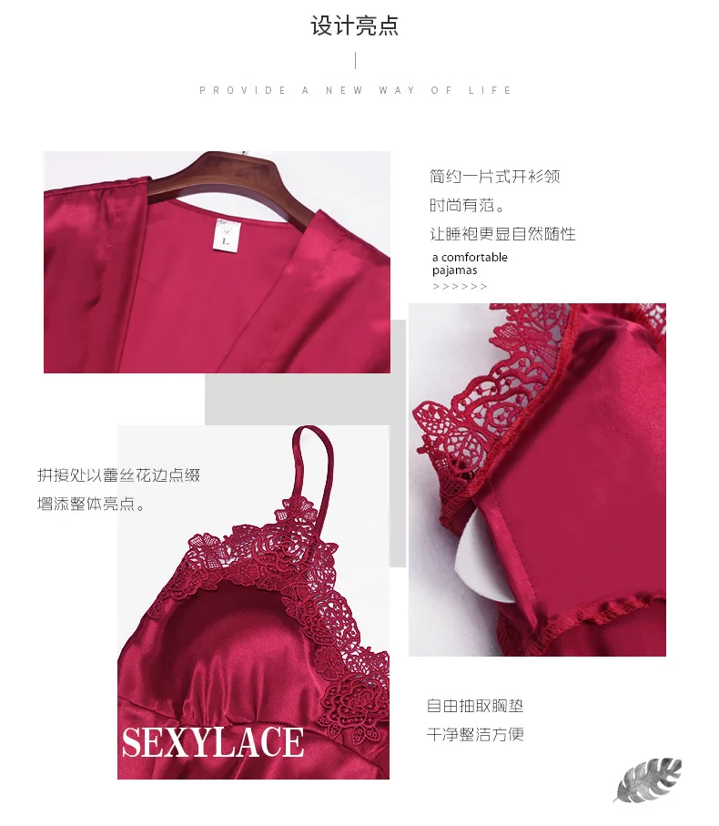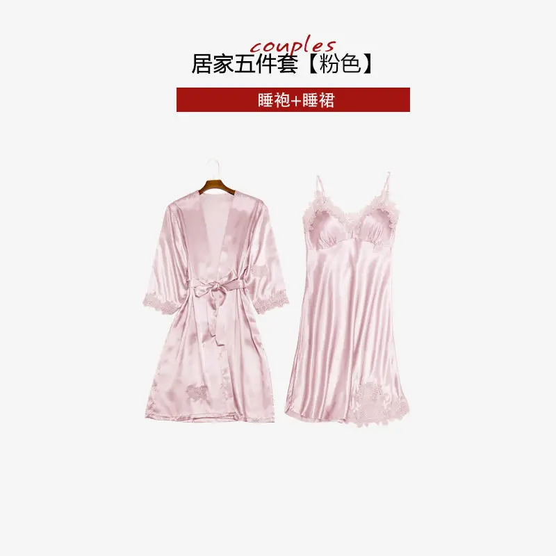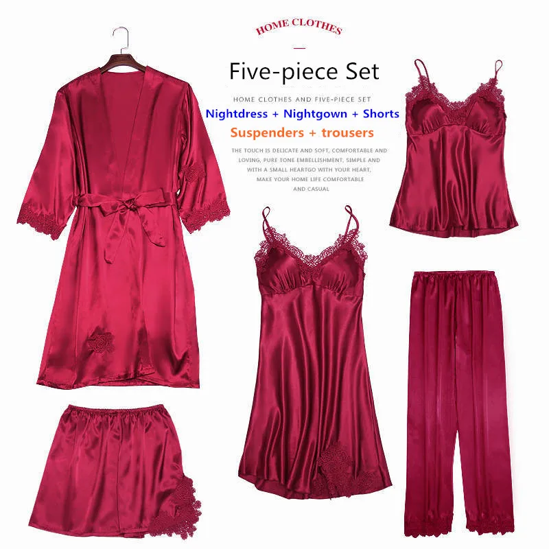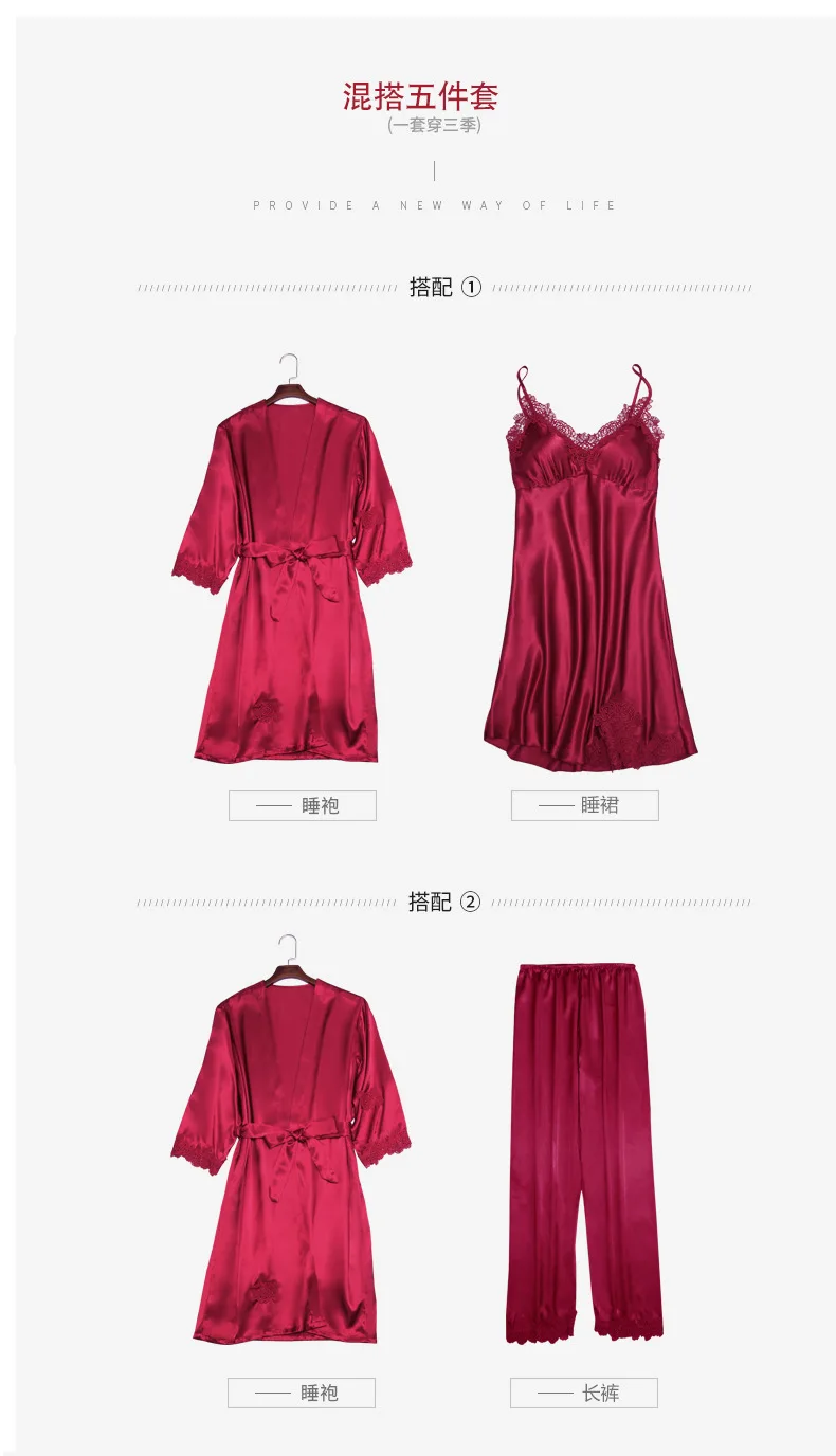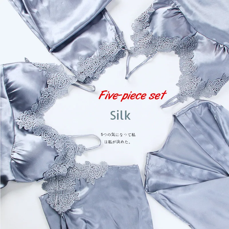 Комплект женского ночного белья из искусственного шелка, кружевной Халат + ночная сорочка, 5 предметов