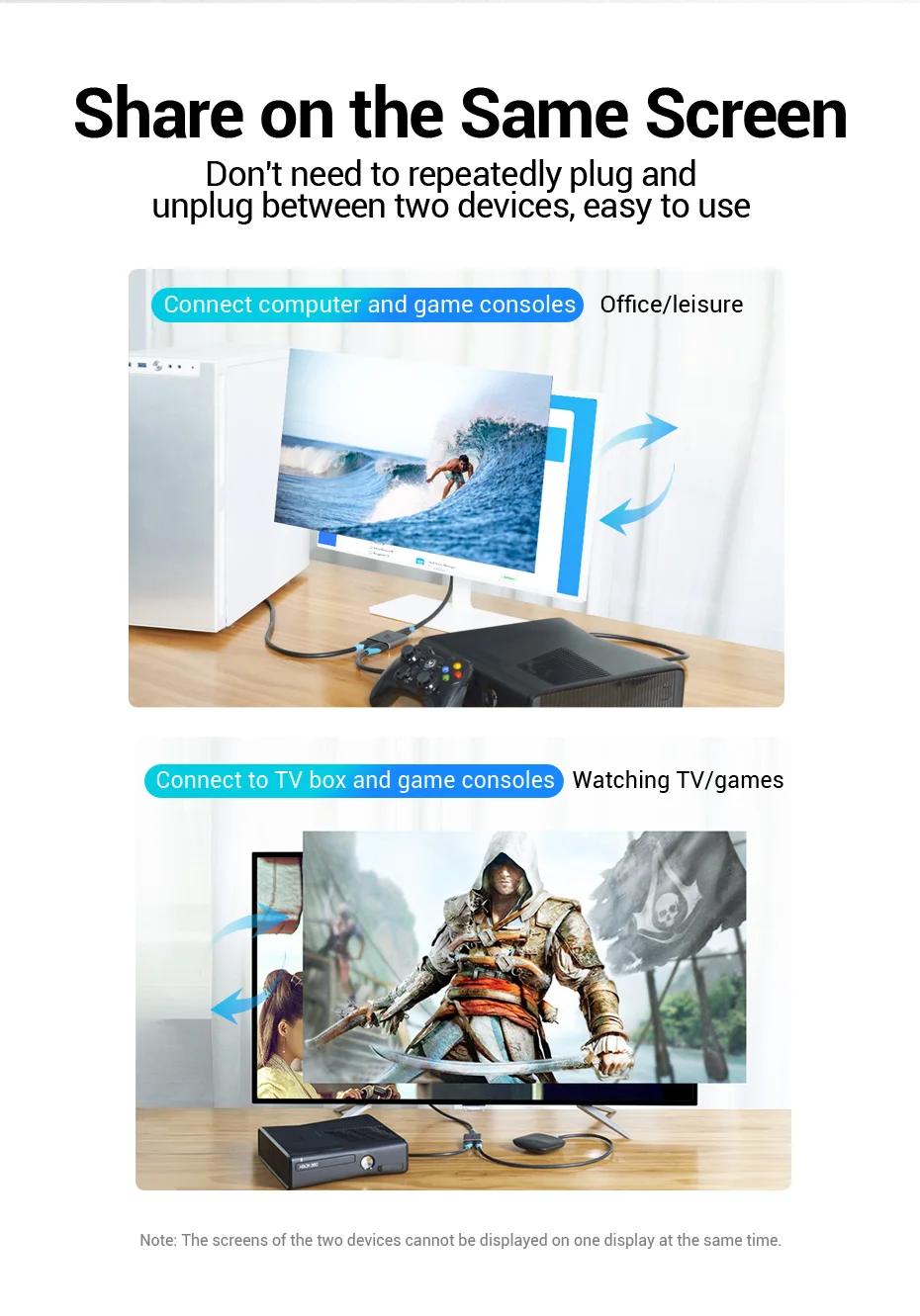 Имею два монитора (HDMI и DP) и телевизор, запаривался всегда с переключением hdmi между выводом на телек и на монитор, а с этим свичом все делается лёгким нажатием одной клавиши! Доволен покупкой! Кстати, учтите, что в комплектации только сам свитч, без дополнительного HDMI.