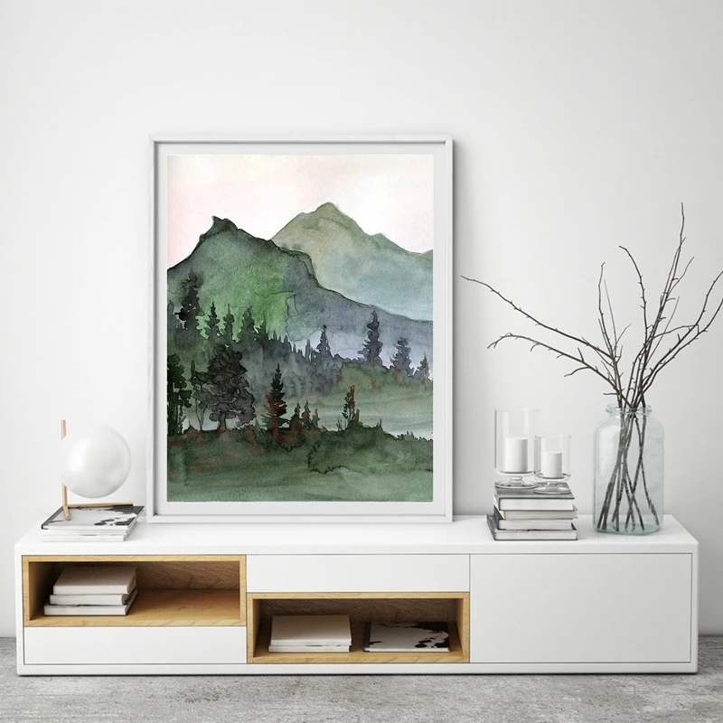 Природа горы акварельные стены Искусство Холст Картина эвергри деревья лес пейзаж плакаты и принты настенные картины для гостиной домашний декор