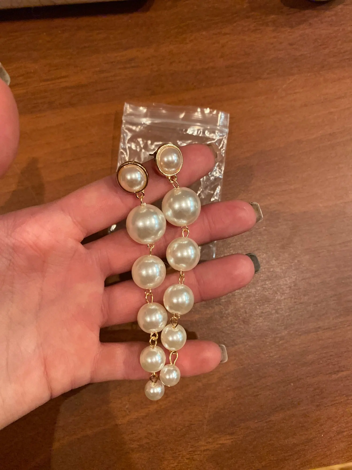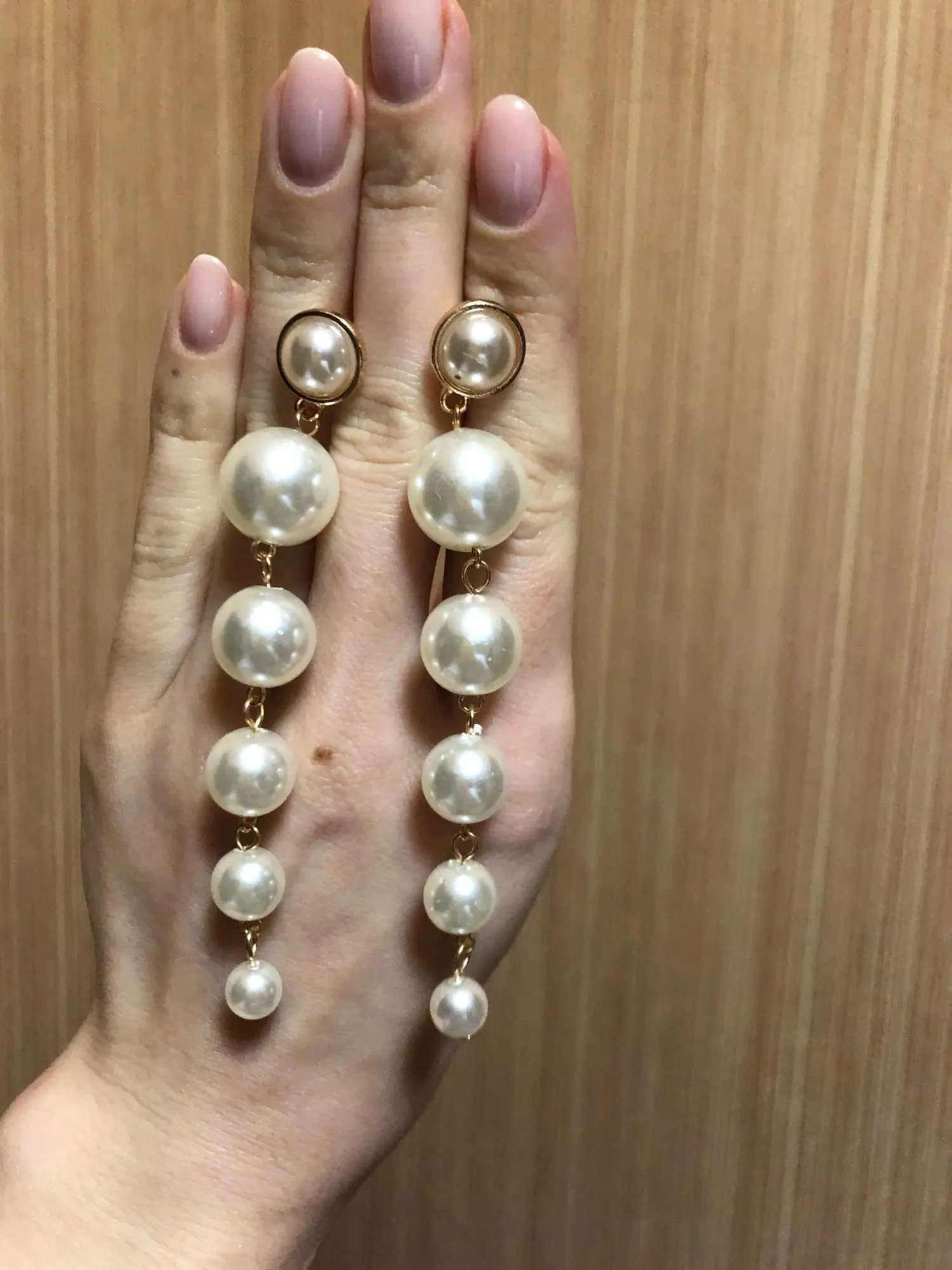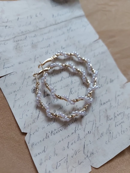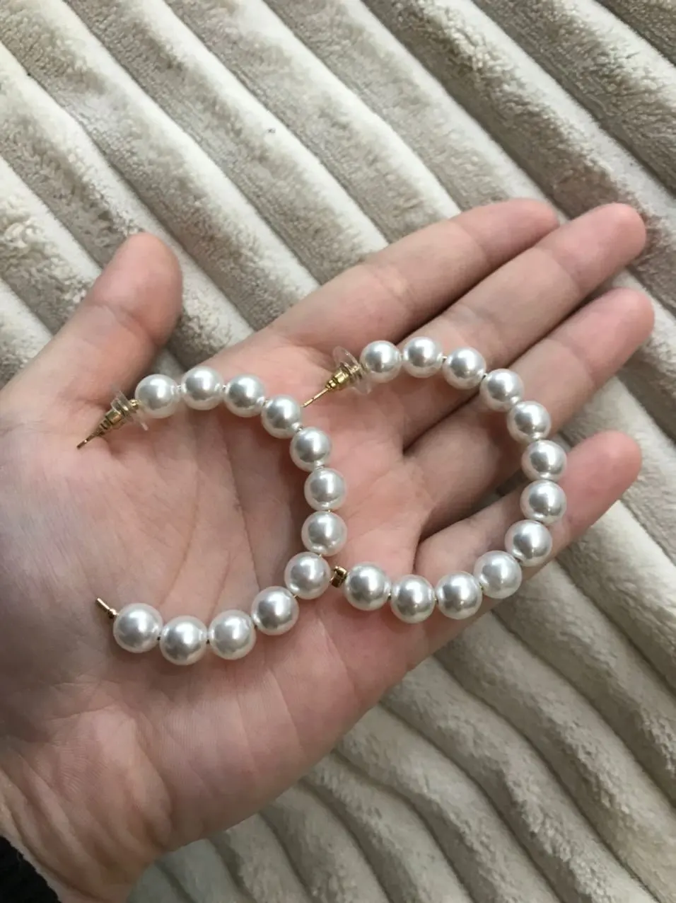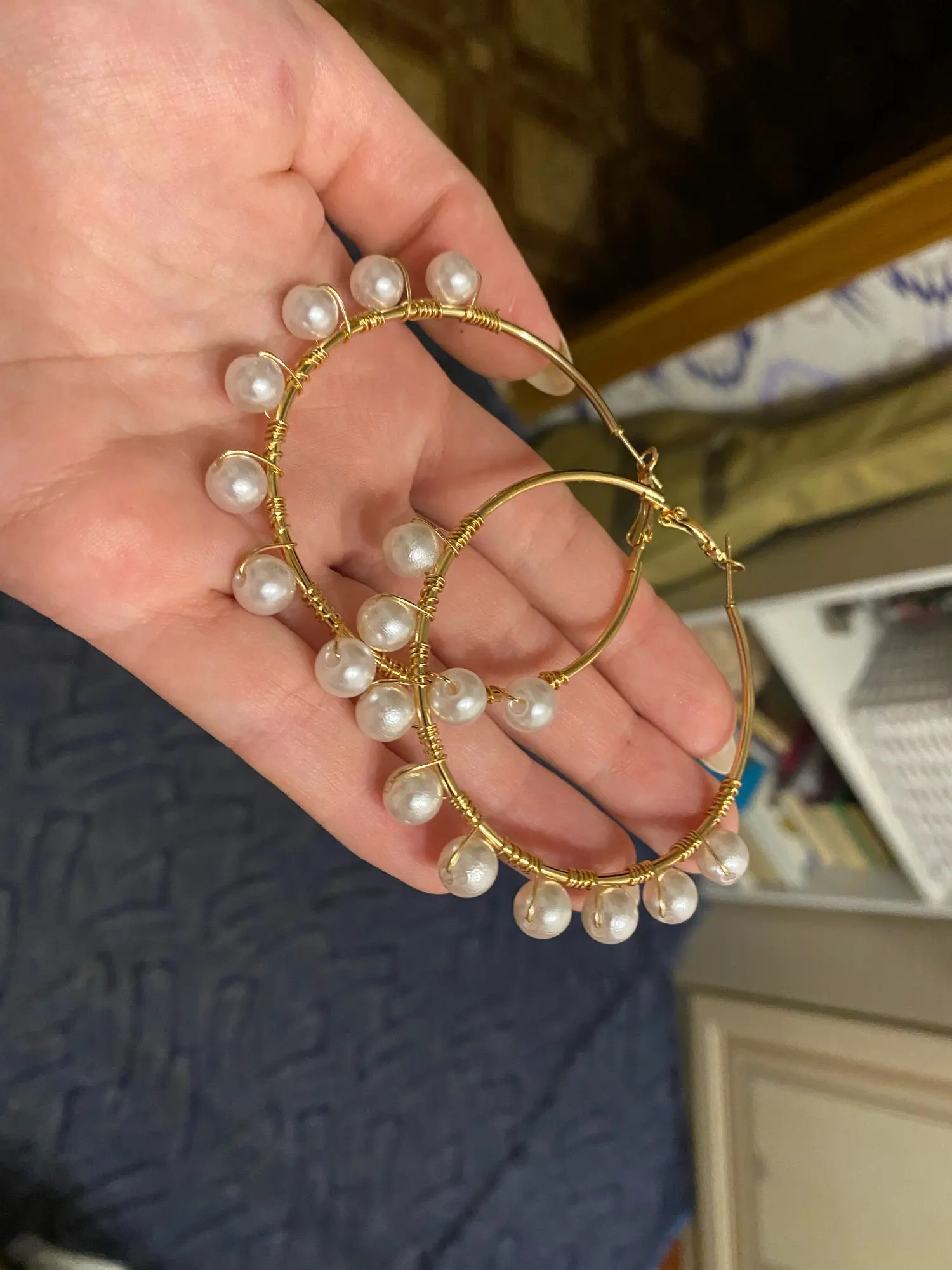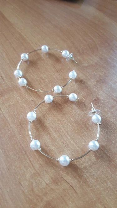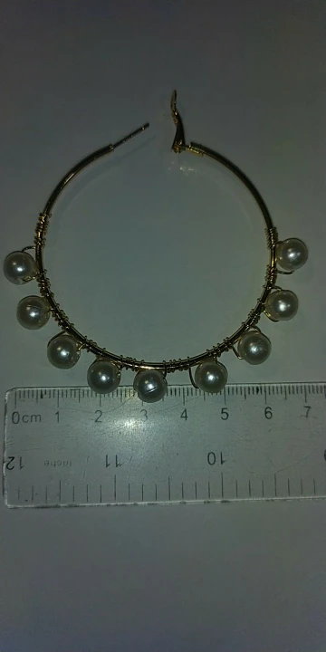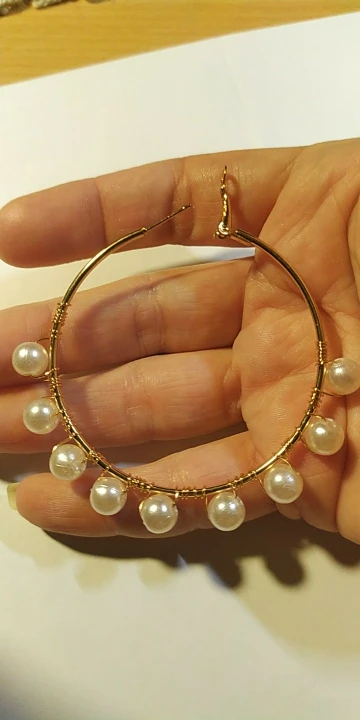 товар шел меньше месяца), получила на почте. жемчужинки немного покорябаны, но не критично, они плотно зафиксированы, не перемещаются по кольцу. Диаметр кольца серьги 5,5 см, если с бусинами то 7,3 см, большие, на ухе ощущаются и немного оттягивают прокол. Замочек очень плотный, пружинка сильно держит. Продавца советую, добросовестный!