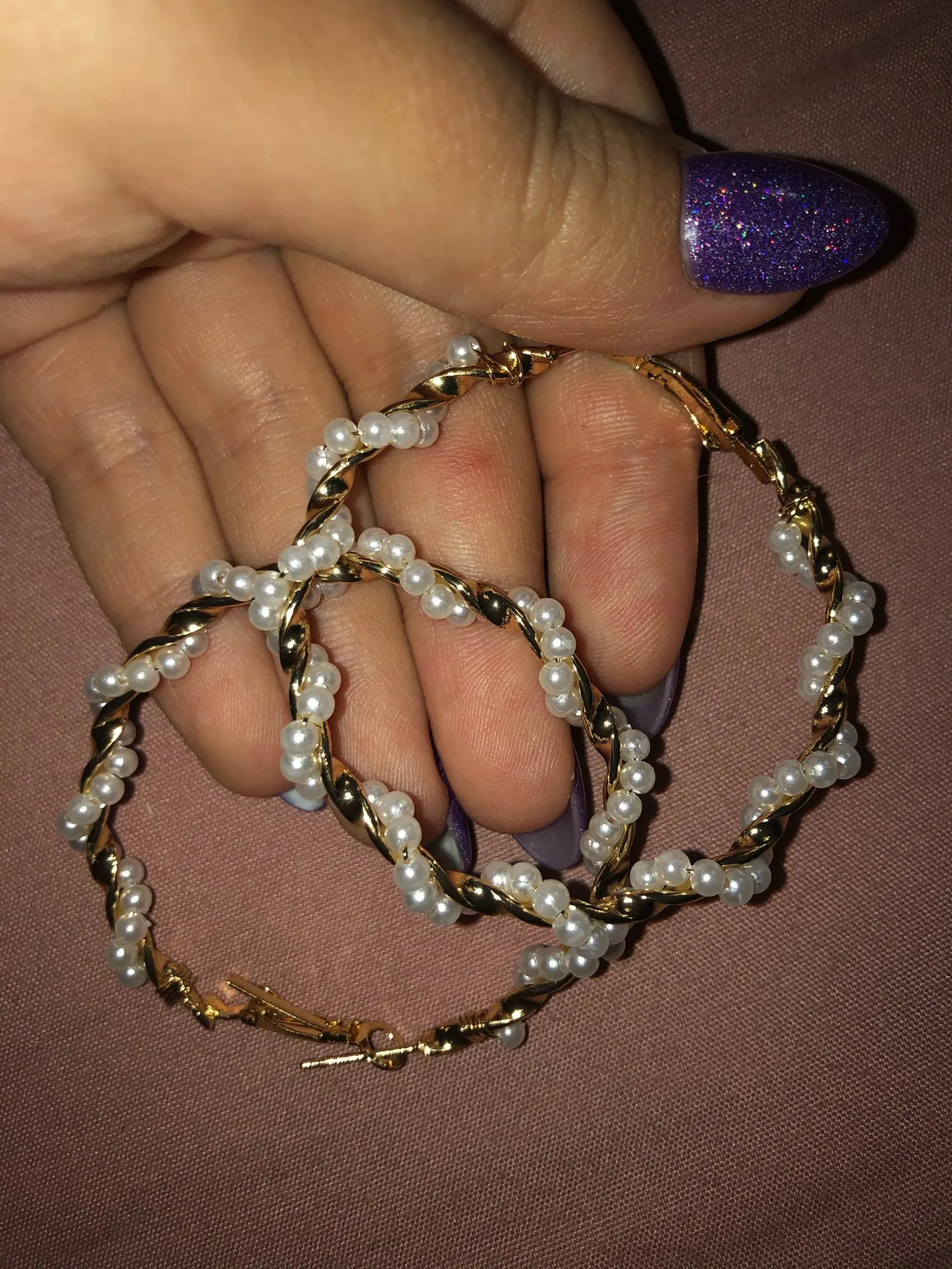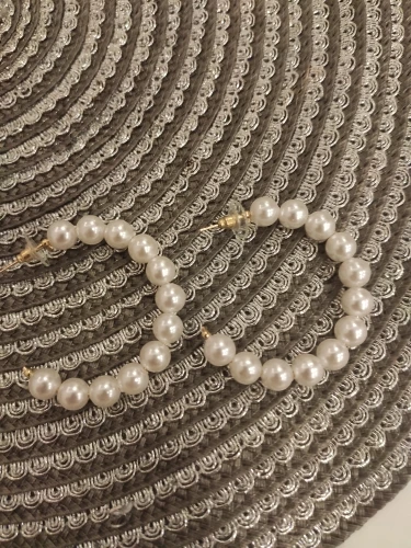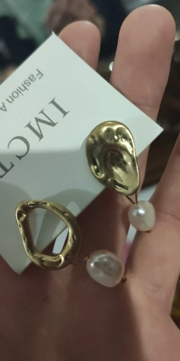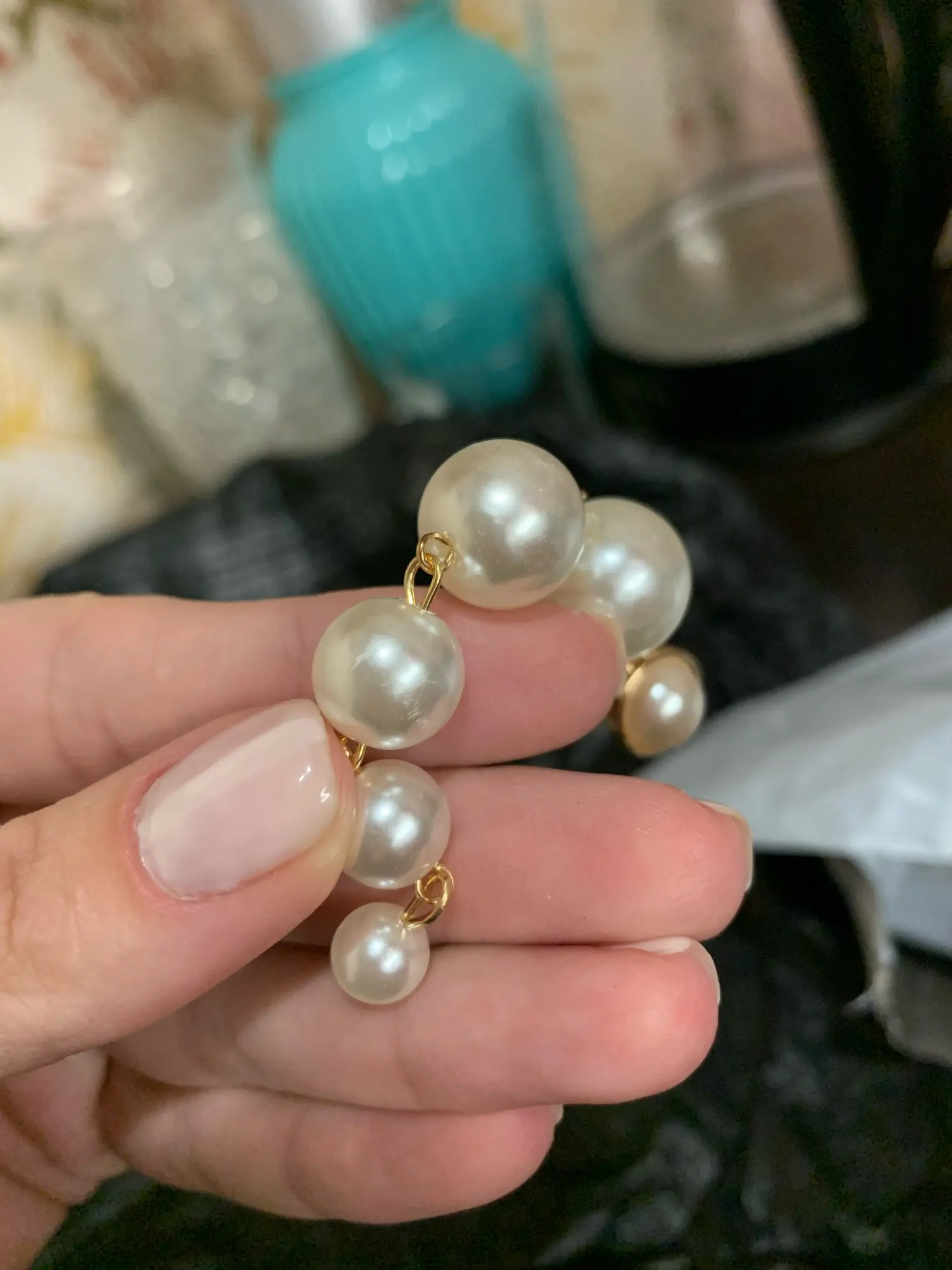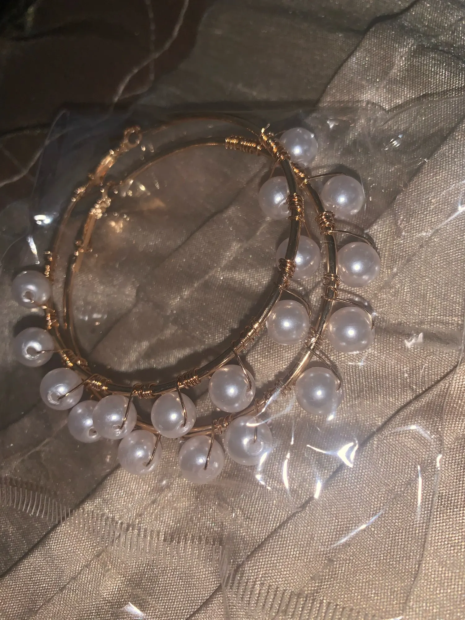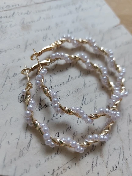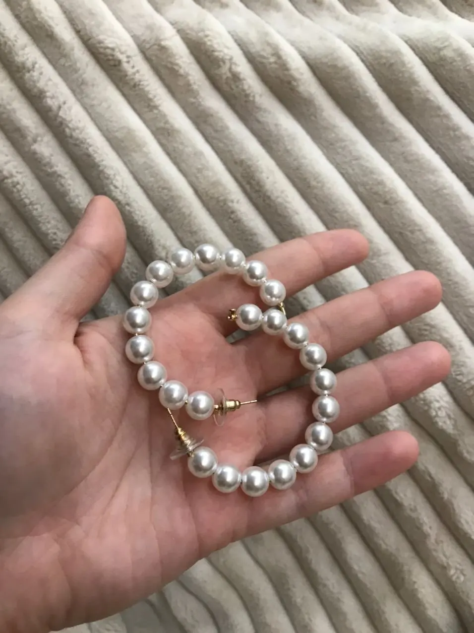 товар шел меньше месяца), получила на почте. жемчужинки немного покорябаны, но не критично, они плотно зафиксированы, не перемещаются по кольцу. Диаметр кольца серьги 5,5 см, если с бусинами то 7,3 см, большие, на ухе ощущаются и немного оттягивают прокол. Замочек очень плотный, пружинка сильно держит. Продавца советую, добросовестный!