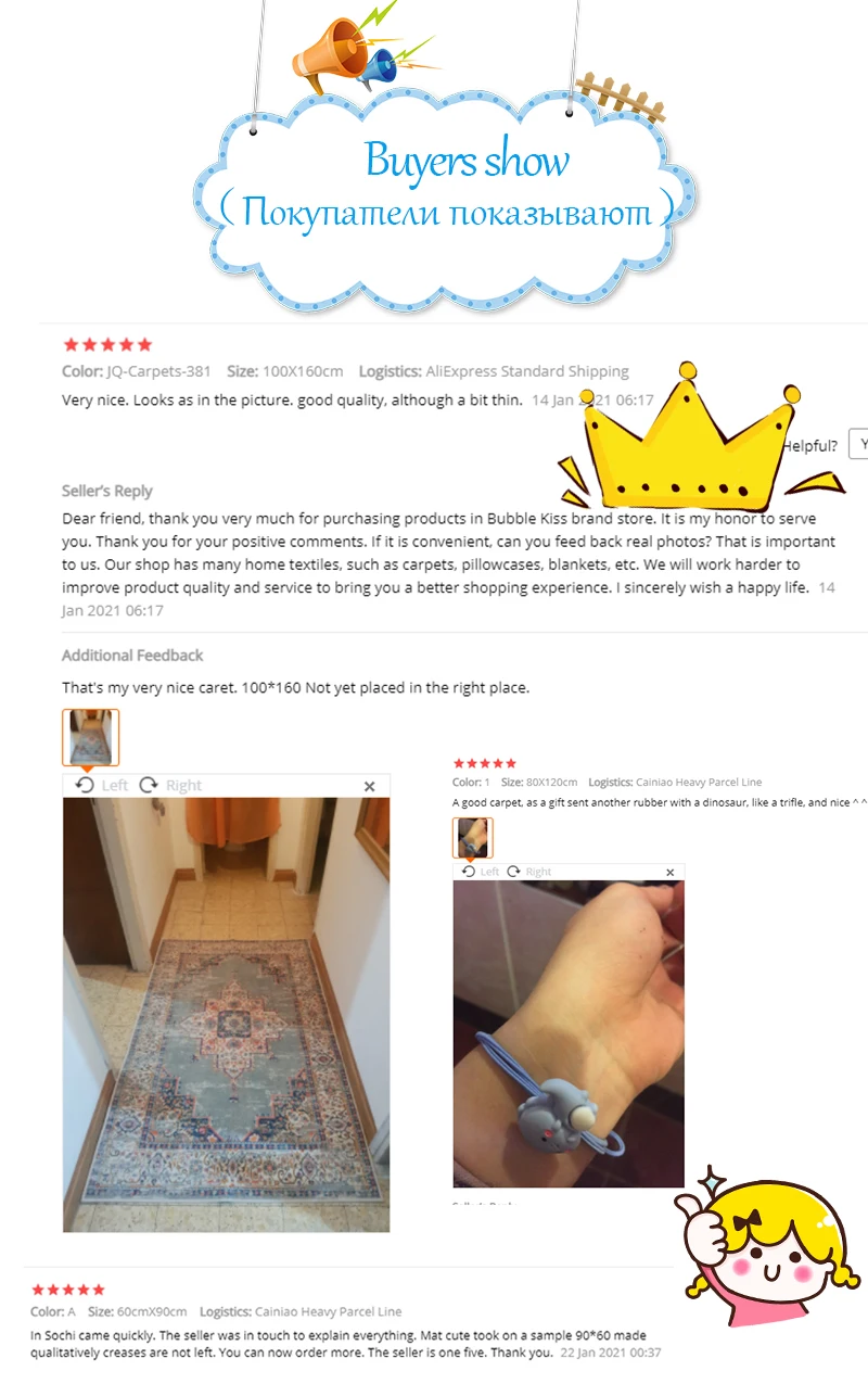 В: есть ли у вас действительно фото?О: Да, если вы хотите просмотреть реальные фотографии, пожалуйста, свяжитесь с нами! Мы предоставим вам позже.В: Можно ли сделать заказ?Ответ: Да, если вам нужна Настройка, пожалуйста, свяжитесь со службой поддержки клиентовВ: это не скользит?О: Да, нижняя часть ковра-Нескользящая пластиковая подошваВ: если вам это не нравится, как мне его вернуть?Ответ: если покупатель возвращает товар в течение 15 дней после получения товара по какой-либо причине, мы вернем покупателю деньги. Однако покупатель должен оплатить стоимость обратной доставки и убедиться, что возвращенный товар остается в первоначальном состоянии.В: какая логистика используется для доставки?О: товары отправляются по стандарту AliExpress, Почта Китая airmail, AliExpress экспресс-почтой, ePacket и прибывают в большинство стран в течение 15-35 рабочих дней. Время доставки зависит от пункта назначения и других факторов, это может занять до 60 рабочих дней.Если вы хотите получить продукцию быстрее, пожалуйста, свяжитесь с нами, чтобы оплатить дополнительную стоимость доставки, мы можем предоставить вам следующие более быстрые и дешевые способы доставки: UPS, DHL, Fedex, TNT, DEPX, EMS. Таким образом, вы можете получить товар в течение 5-7 рабочих дней.