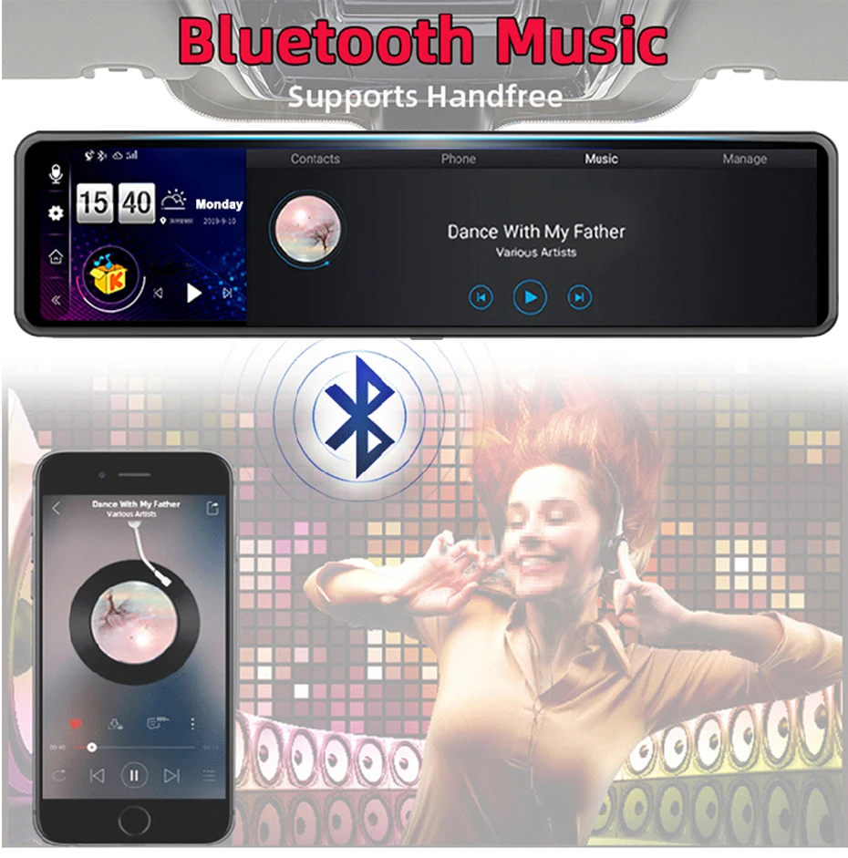 Поддерживает bluetooth громкой связи, После сопряжения bluetooth между dvr и смартфоном вы можете совершать и принимать звонки прямо с самого зеркала dvr со встроенным микрофоном и динамиком.