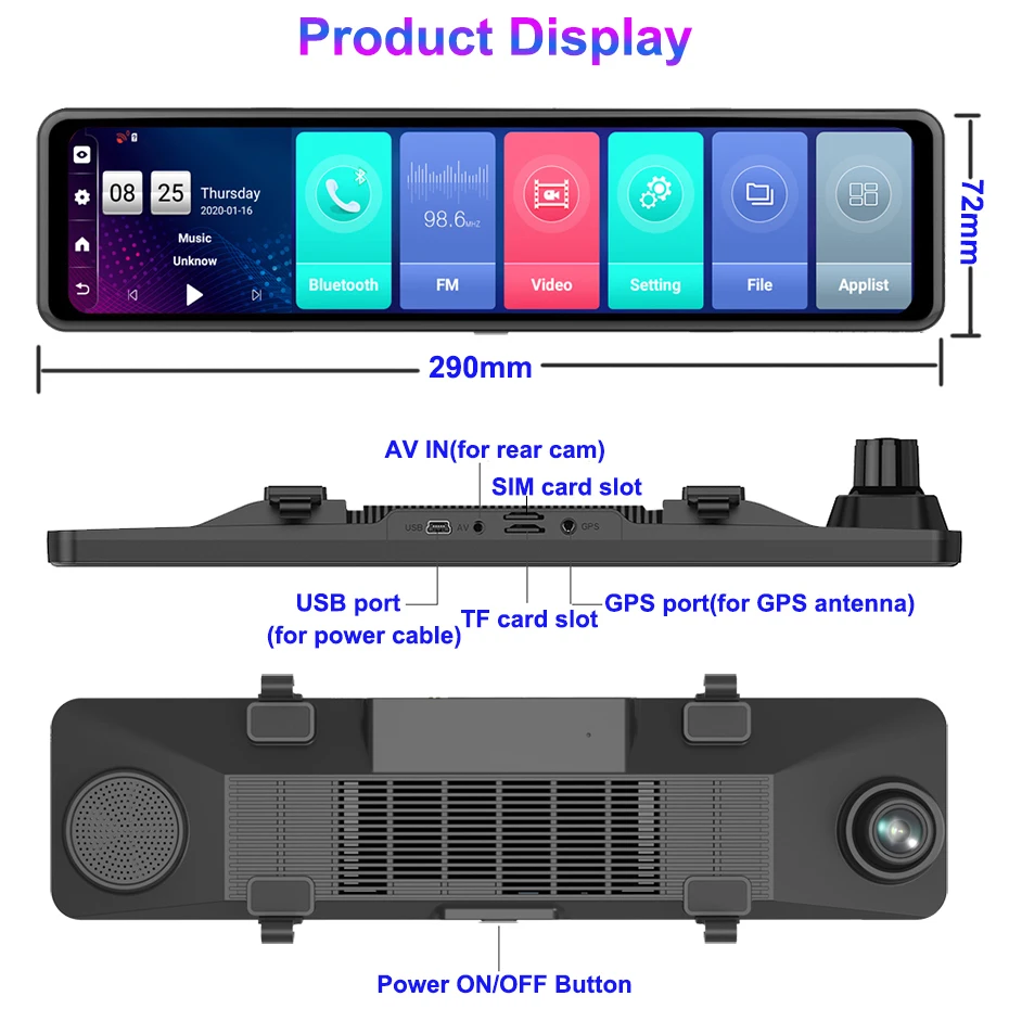 Зеркало заднего вида с камерой заднего вида, 12 дюймов, 4G, Wi-Fi