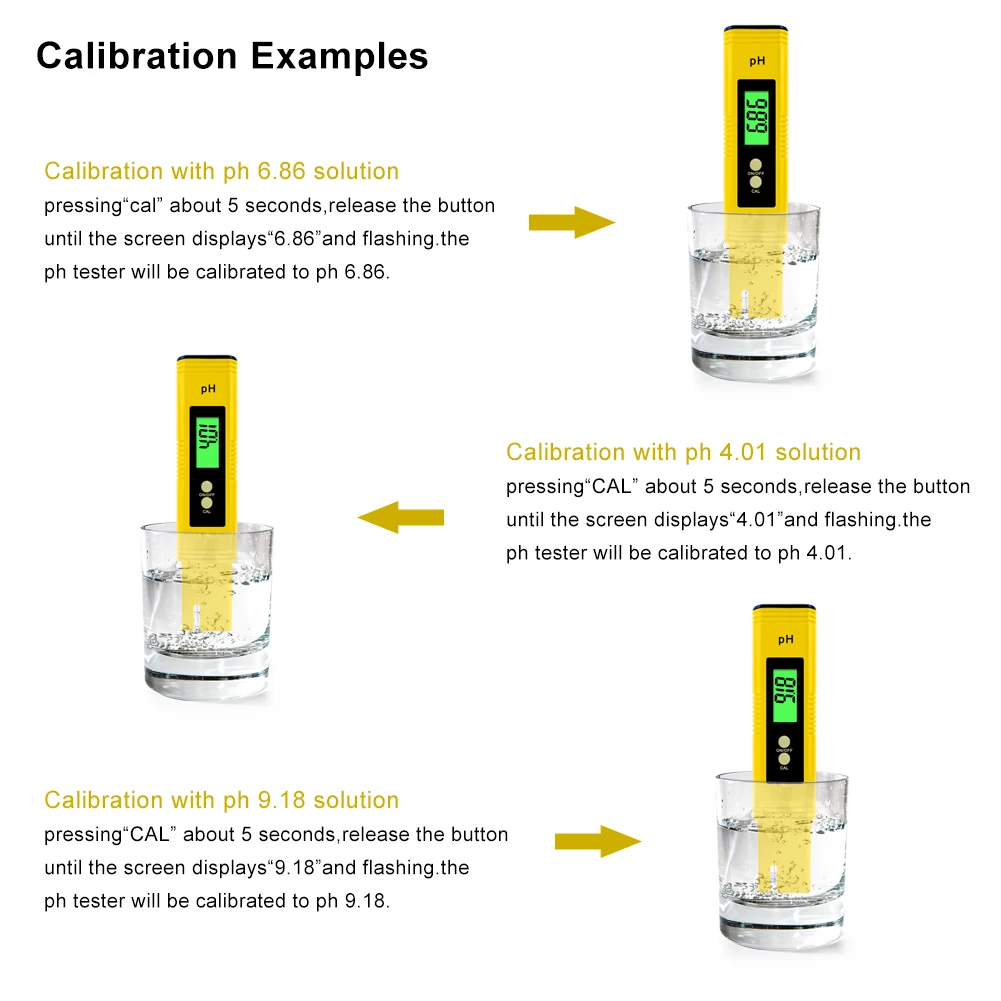 1. Снимите защитный колпачок. 2. Сначала краску электрода дистиллированной водой и сосите его фильтровальной бумагой. 3. Включите счетчик, нажав кнопку «Вкл/Выкл». 4. Погрузите ph-метр электрода в раствор, который будет протестирован (не должен быть над погружной линией). 5. Осторожно Перемешать и ждать около 30 секунд, пока чтение стабилизируется. 6. После завершения очистите электрод чистой водой, выключите счетчик, нажав кнопку «Вкл/Выкл». 7. Всегда заменяйте защитный колпачок после использования. 1. Включите ph-метр 2. Disolve каждый буферный раствор в 250 мл дистиллированной воды 3. Погрузите электрод в раствор PH 6,86 (при температуре 25) 4. Нажмите кнопку “CAL” (калибровка) в течение 5 секунд и отпустите -Дисплей начнет мигать 6,86 -Подождите, пока дисплей не перестанет мигать. Краску электрода дистиллированной водой и высушите его фильтровальной бумагой. 5. Погрузите электрод в раствор PH 4,00, -Нажмите кнопку «CAL» в течение 5 секунд, затем нажмите и отпустите сразу же во второй раз -Чтение начнет мигать 4,00 -Подождите, пока дисплей не перестанет мигать Высушите электрод в краску дистиллированной водой, как и прежде. 6. Поместите измерительный прибор обратно в буферное решение для проверки калибровки. В случае неправильной калибровки Повторите калибровку 7. Если приблизительный рН вашего тестового раствора выше 7,0, откалибруйте измеритель с помощью 6,86 и 9,18 раствора. Для этого, пожалуйста, следуйте таблице калибровки, Третий шаг-метод калибровки для 9,18 точки.