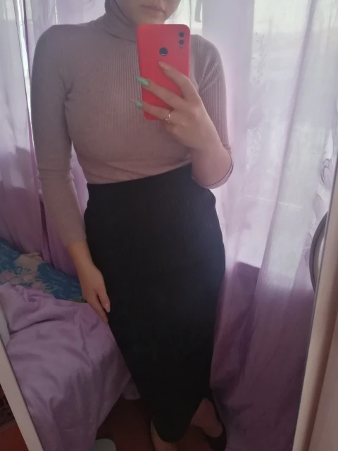 Посылка шла практически месяц в Кузбасс. Примерила оказалось маловата сильно обтянула. Очень тянется пока дефилировала вроде села)) швы аккуратные, нитки не висят, небольшой запах есть думаю до первой стирки , уйдёт. Форму держит т. к вязка лапша. Базовая вещь цвет однотонный нейтральный, карандаш. Не плотная)) вязка на просвет просвечивается. На ощупь приятная. Сзади есть разрез в носке будет раскрыт. У меня длинна по колено но наверное лучше бы смотрелся длиннее из-за разреза.
