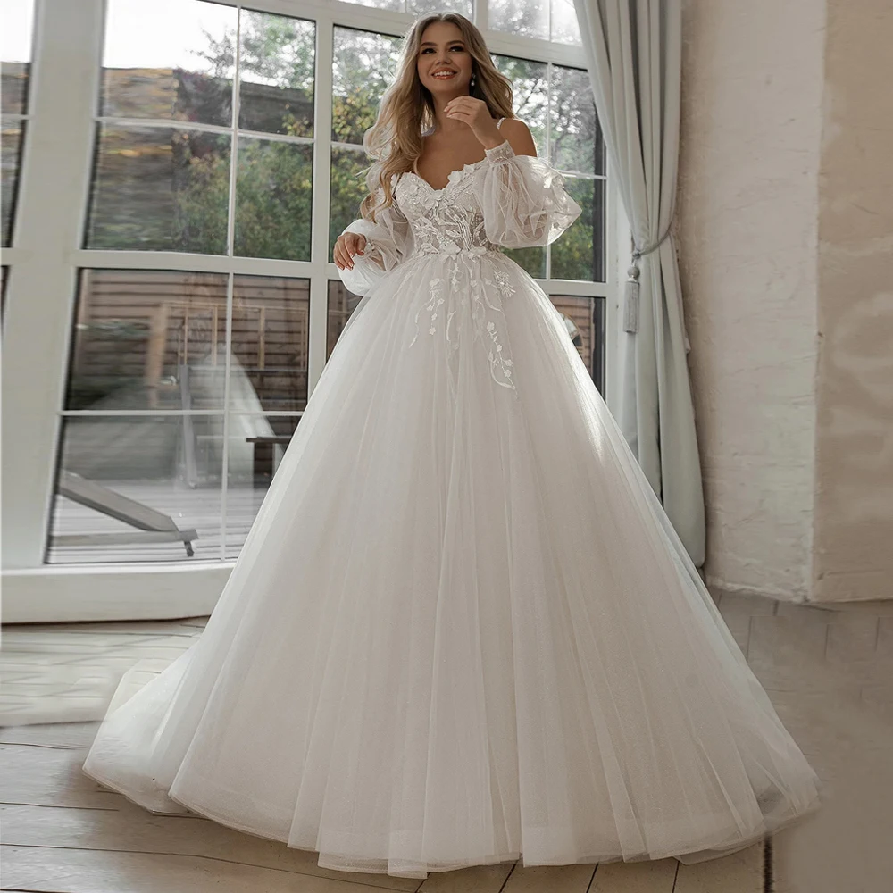 2022 Новое поступление бальное платье блестящие свадебные платья съемные пышные с длинным рукавом Аппликации Кружева Тюль богемные свадебные платья