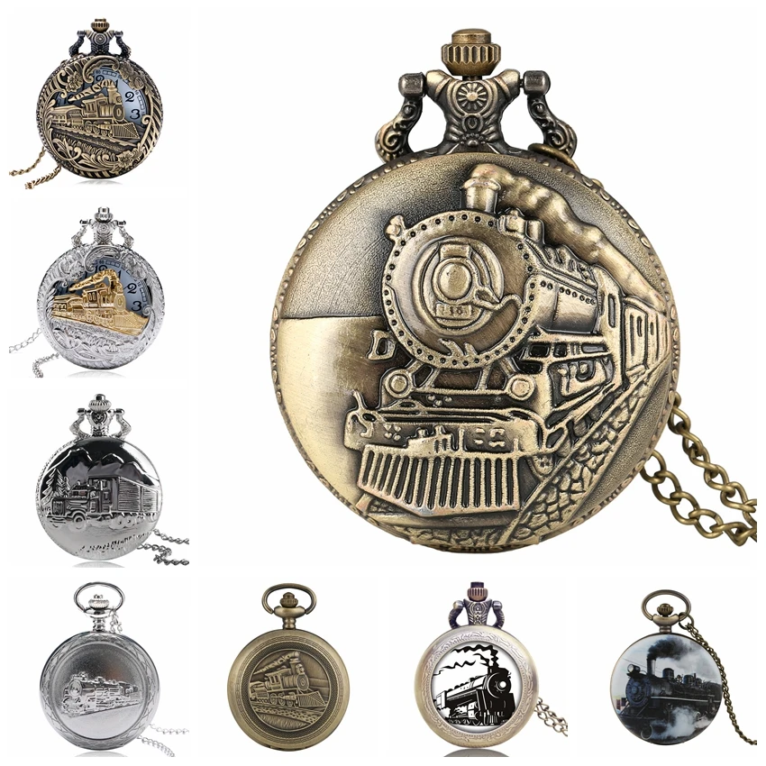 Часы наручные кварцевые в стиле ретро с изображением паровозика, паровозика, карманные бронзовые, в стиле стимпанк, цепочка с подвеской, коллекционный подарок для мужчин и женщин