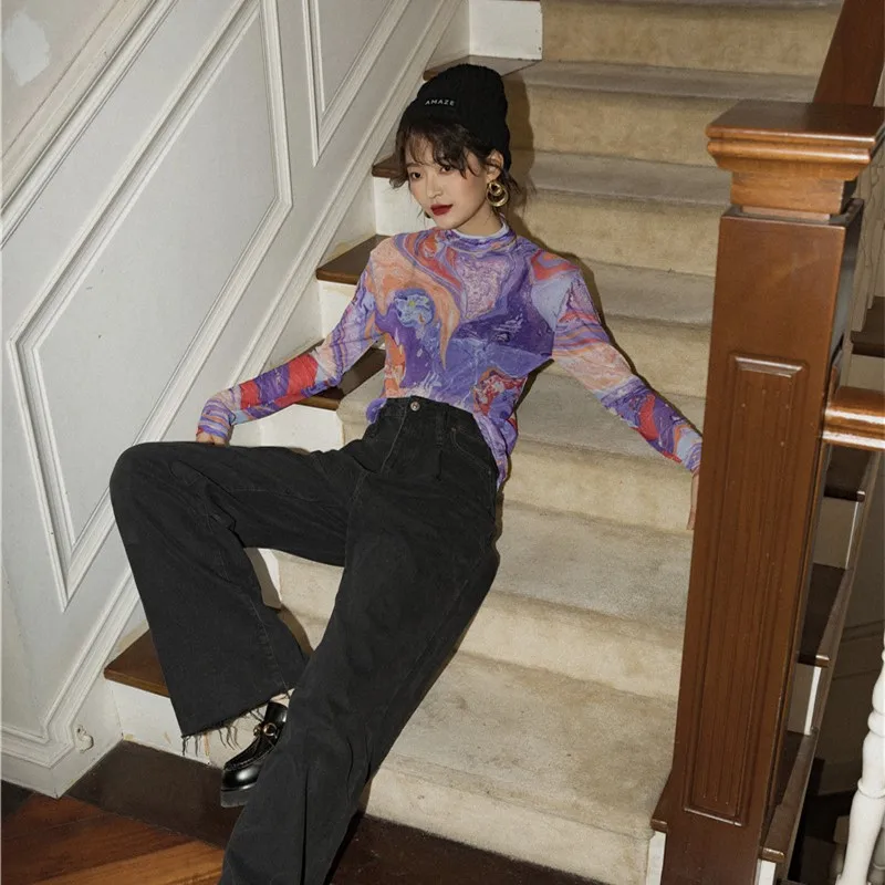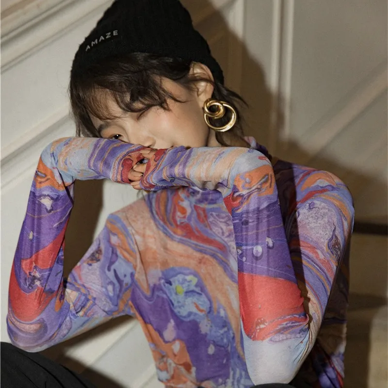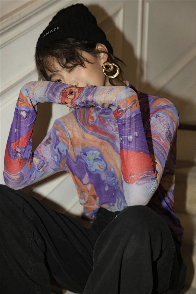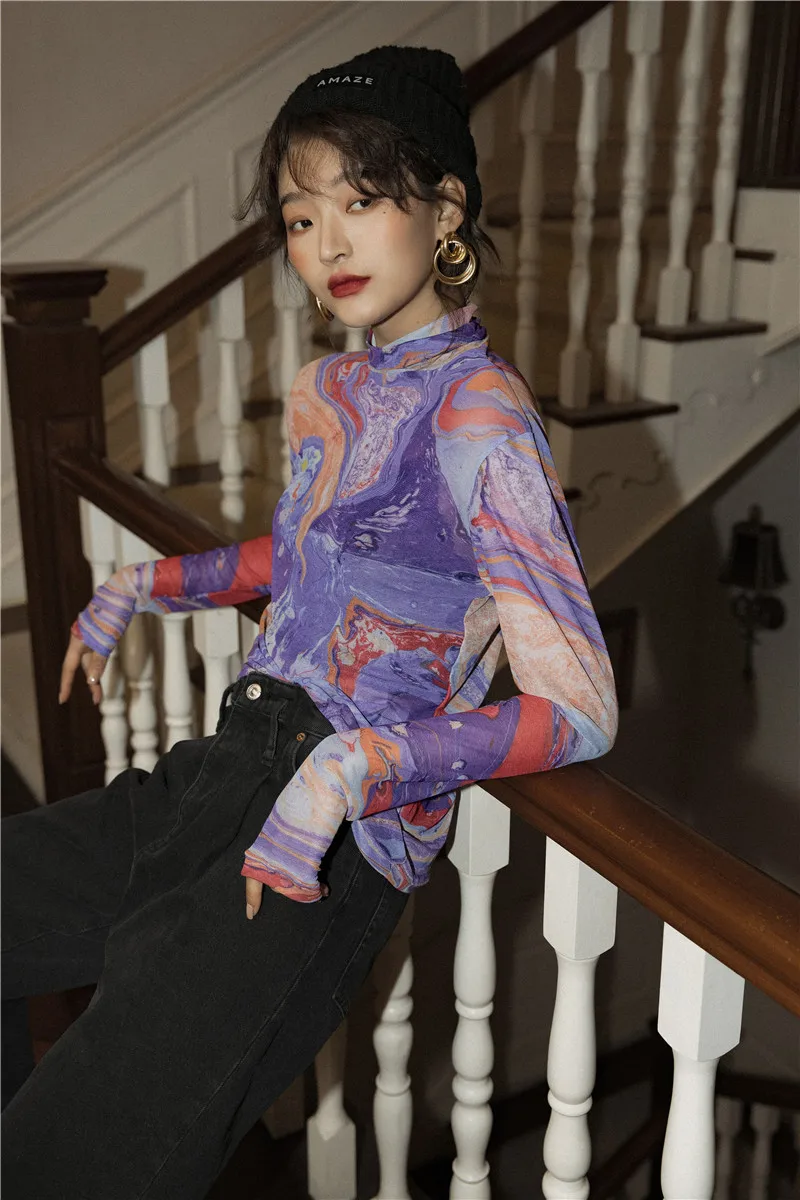 Женская Сетчатая футболка CHEERART, футболка с длинным рукавом фиолетовая футболка с принтом и высоким воротником, весна 2020