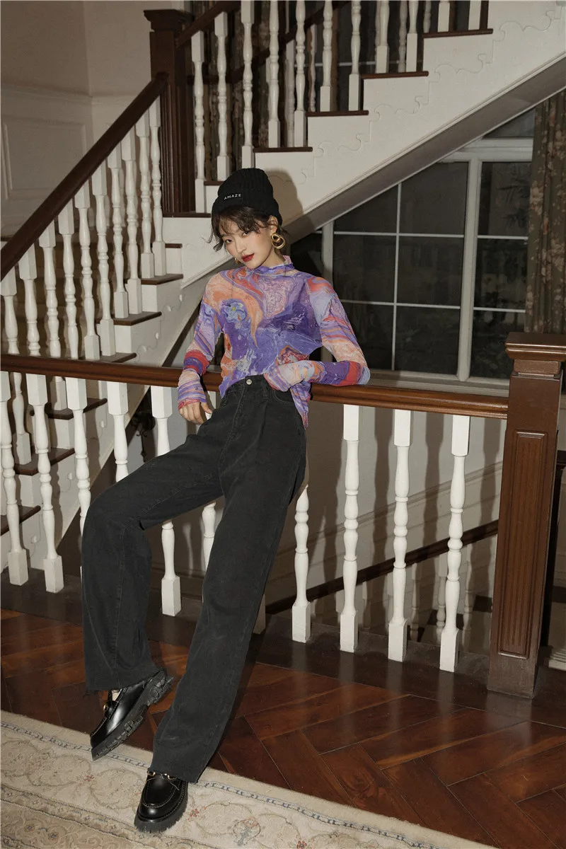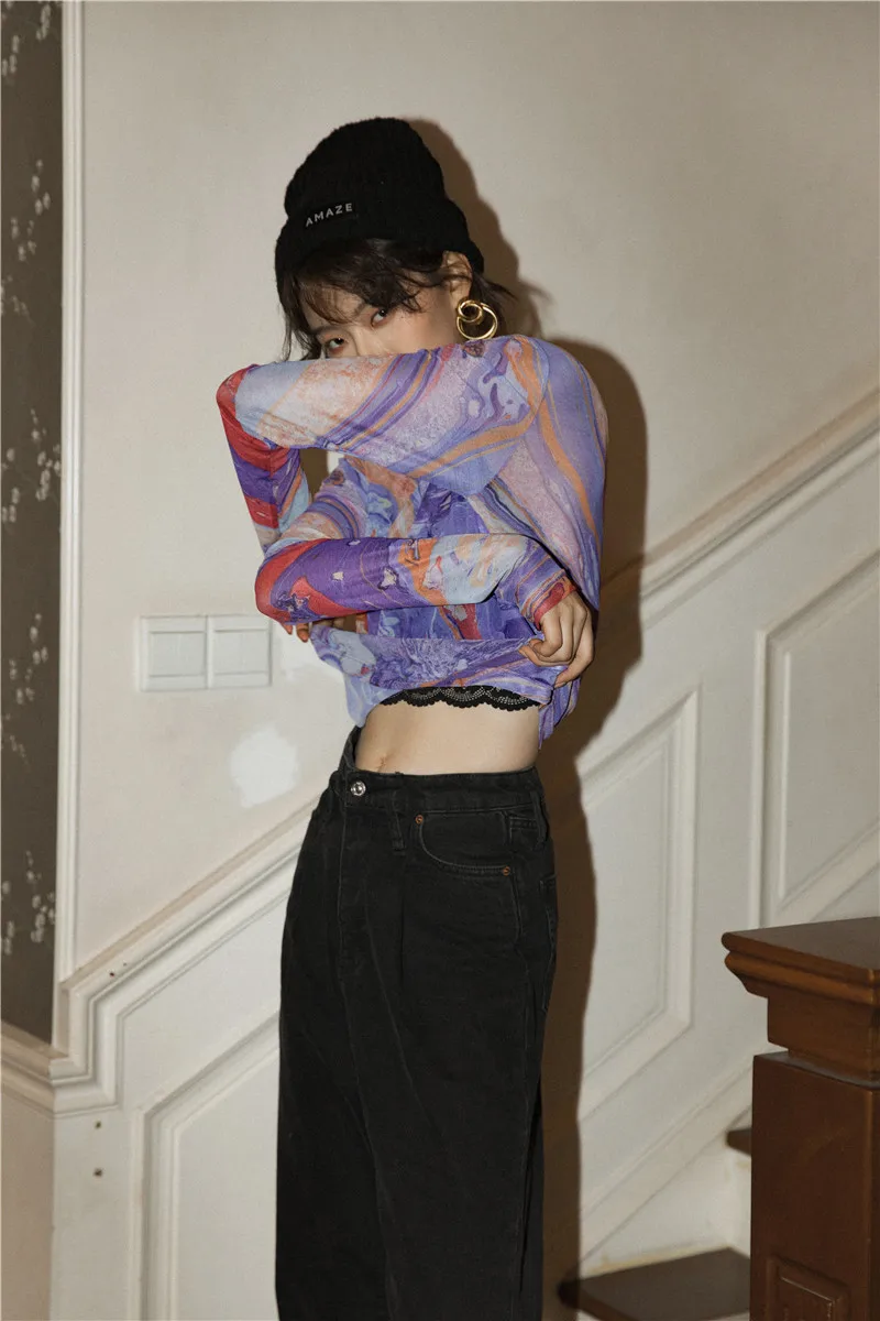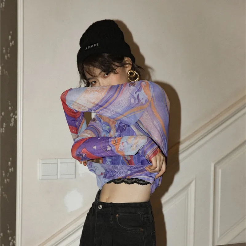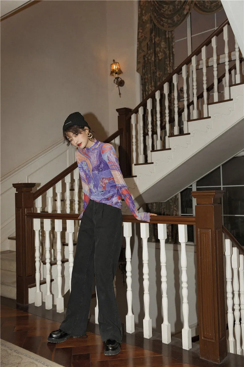 Женская Сетчатая футболка CHEERART, футболка с длинным рукавом фиолетовая футболка с принтом и высоким воротником, весна 2020
