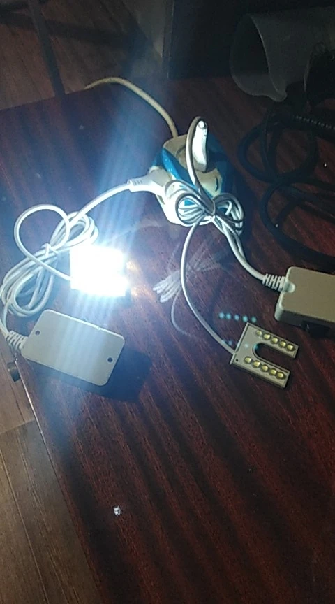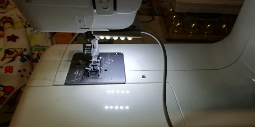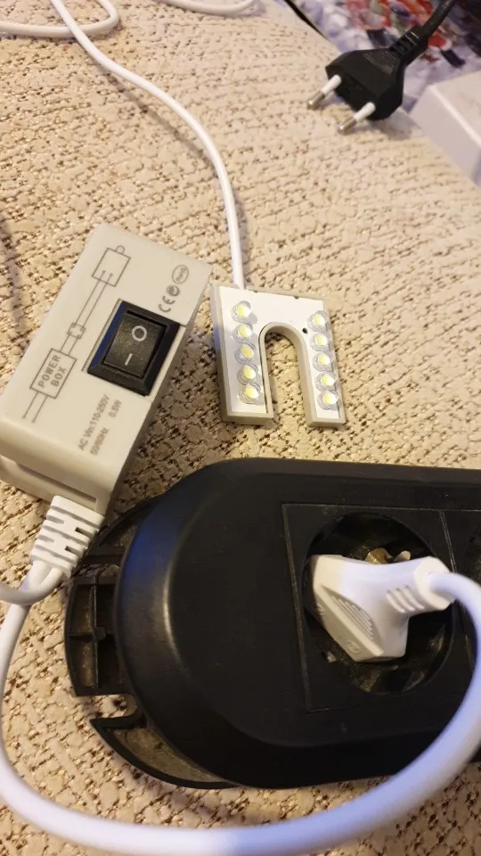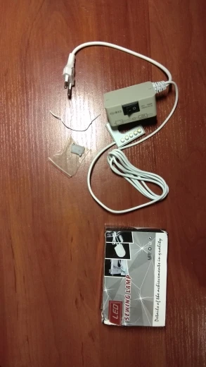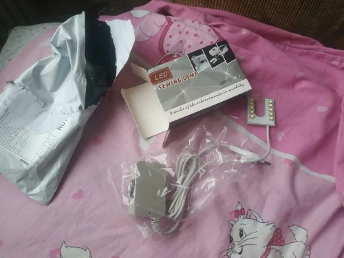 Коробка, в которой лежал светильник, была помята, просто развалилась у меня в руках как только я достала её из пакета. Светильник цел, светит ярко. Вот только при заказе я не подумала, как буду прикреплять этот светильник в пластмассовому корпусу бытовой швейной машинки. Этот светильник для металлических швейных машинок. Потом придумала как прикрепить: к рукаву машинки на двусторонний скотч прикрепить полоску магнита, а уже к нему - светильник