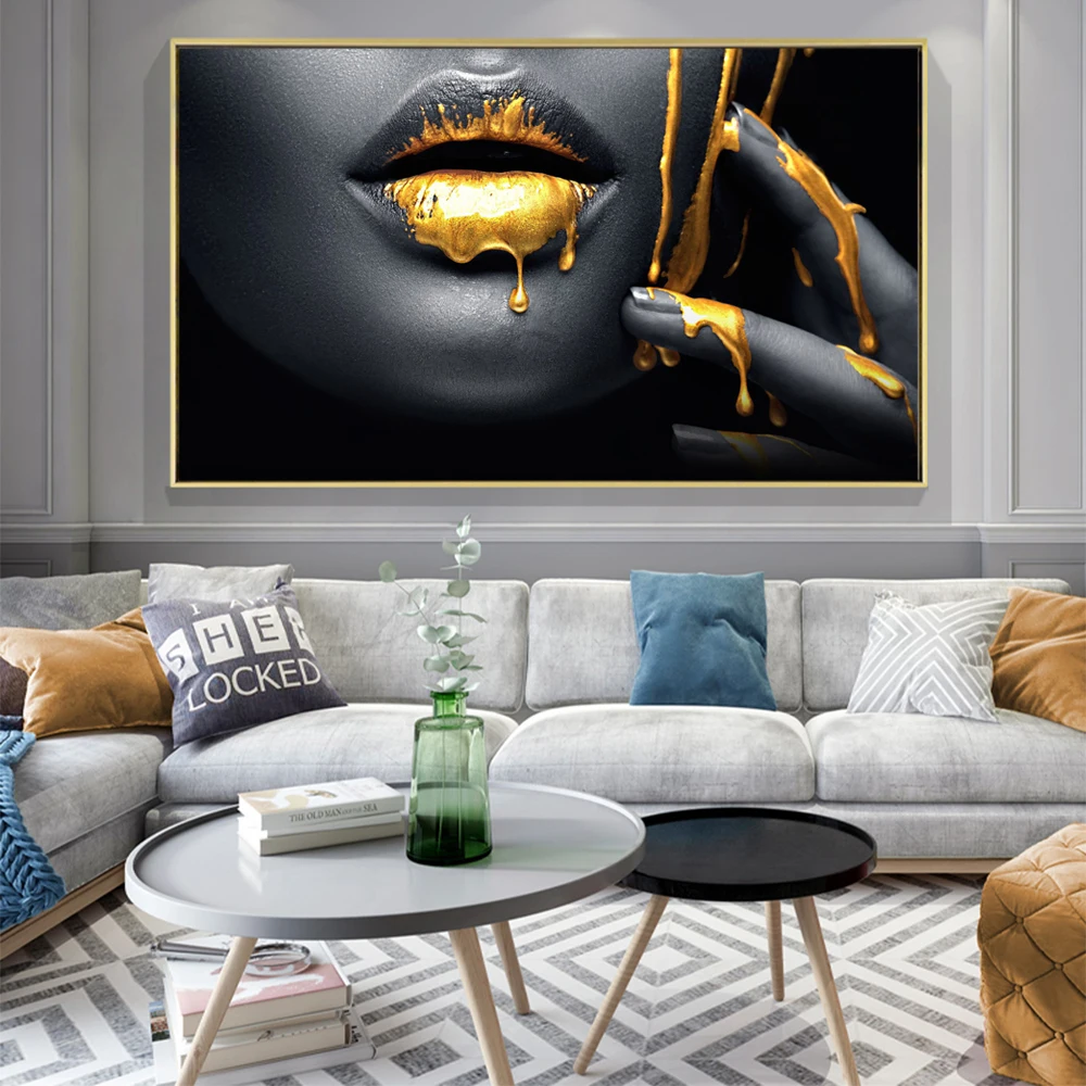 Черный Африканская женщина золотой губы портрет, холст, живопись Плакаты и принты настенные картины для Гостиная