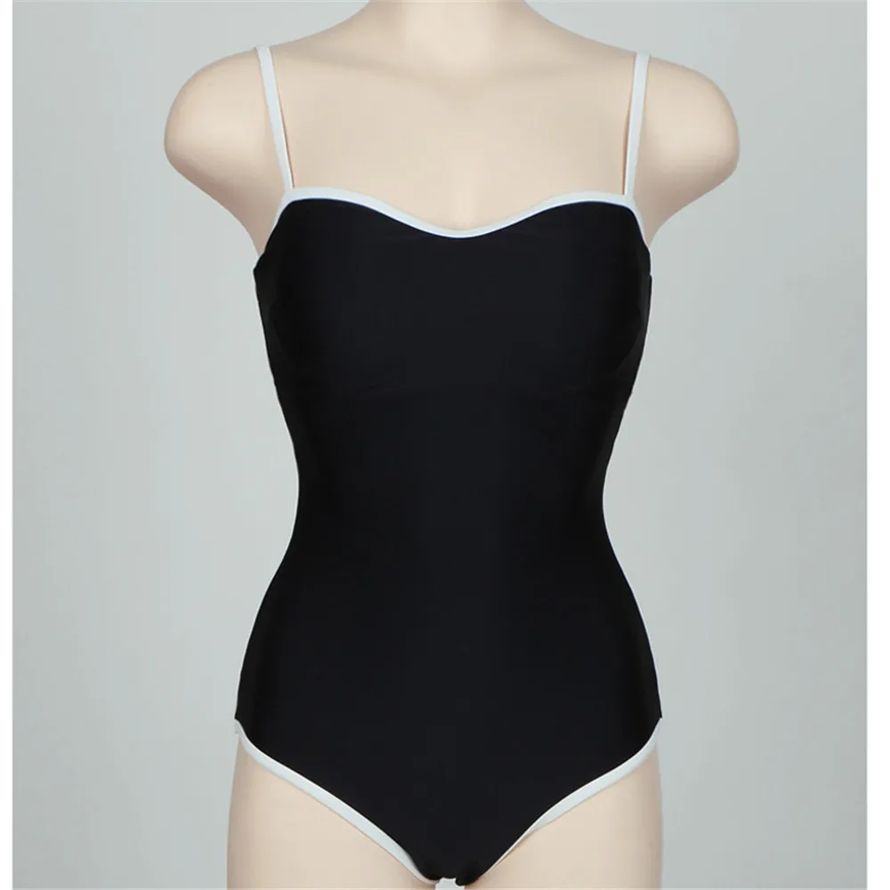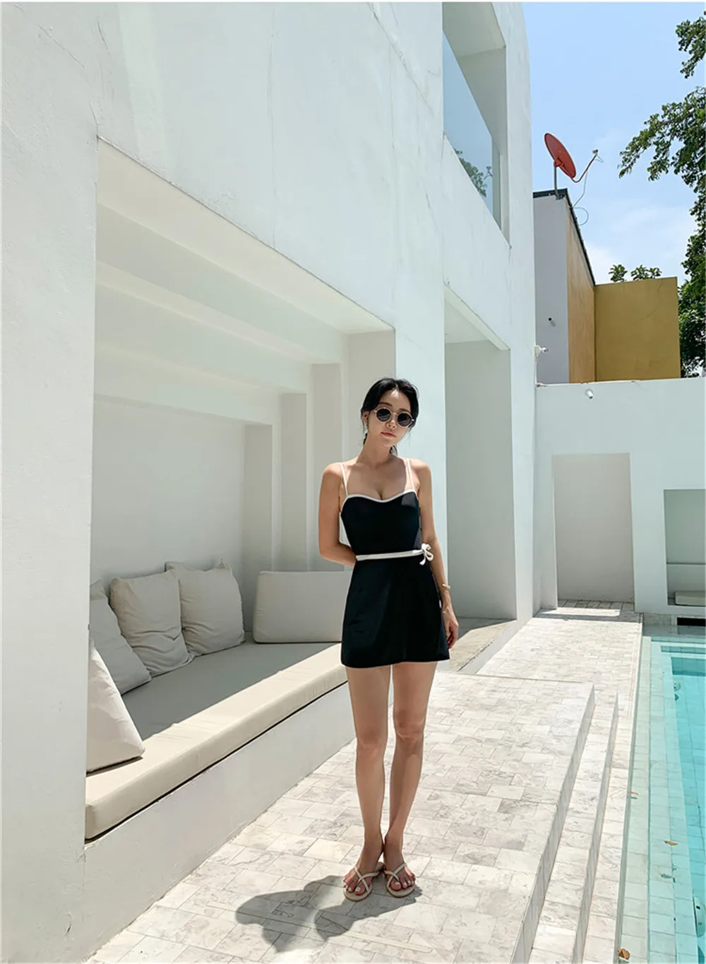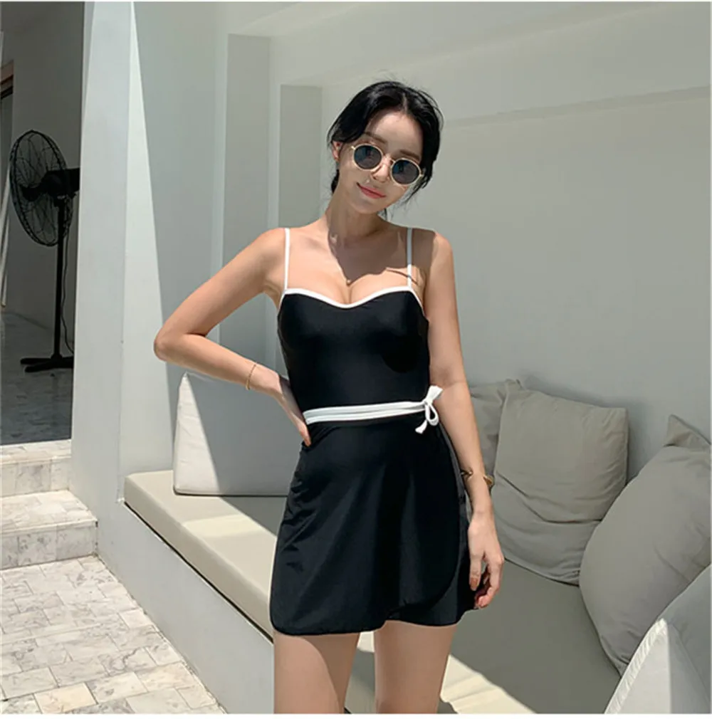 Слитный купальник в Корейском стиле, Женский однотонный купальник с пуш-апом, монокини бандо, купальный костюм с юбкой, трикини, подушечка, черный