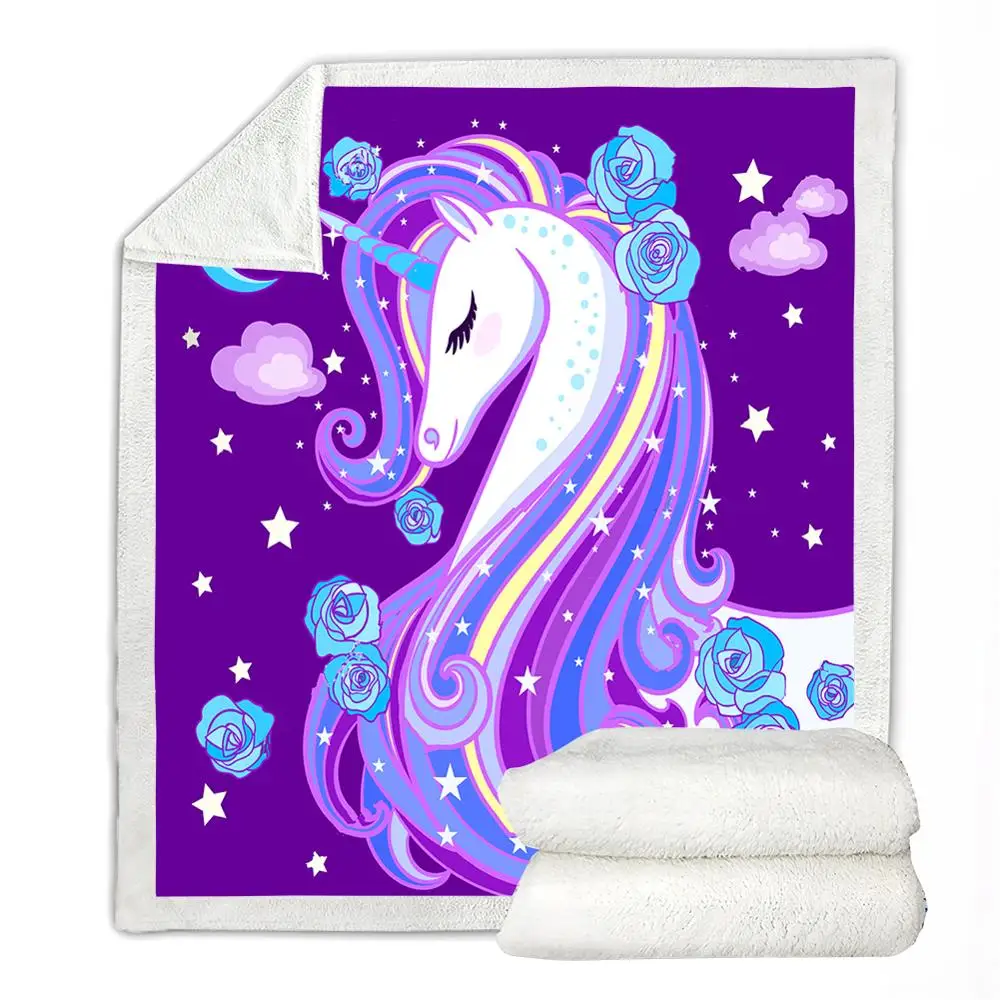 Одеяло с единорогом хлопковые голубые джинсы с цветочным принтом шерпа Флисовое одеяло для маленьких девочек Фиолетовый единорог тонкие Стёганое одеяло на кровать, очень мягкое одеяло