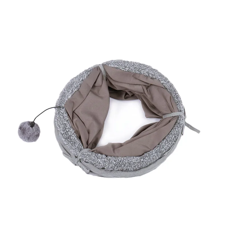 отличный туннель, плотная ткань, на краях завязки для складывания. два помпона в комплекса, кошка шерудит в нем активно) доставка 10 дней