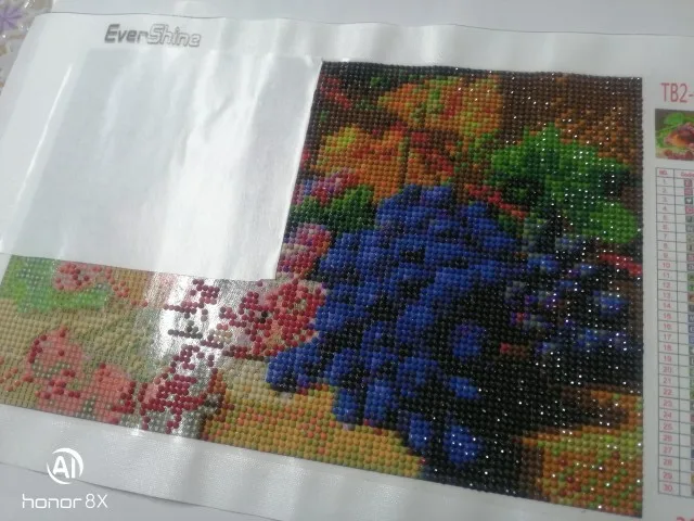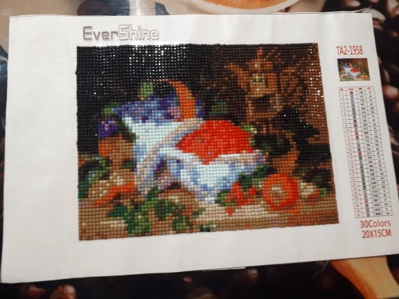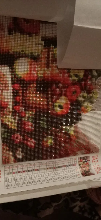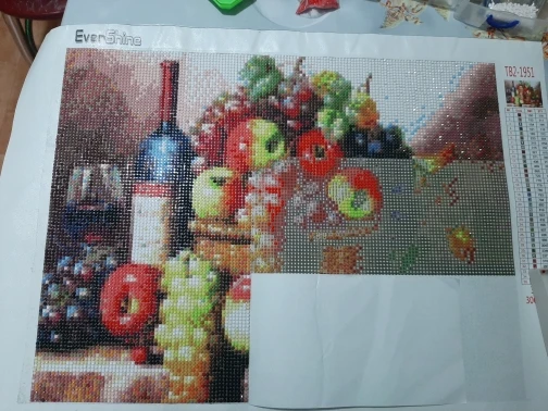 Очень классная алмазная мозаика! Клеевая основа просто супер, стразики держаться очень хорошо. Очень красочная) Думаю, что будет отлично смотреться на кухне.