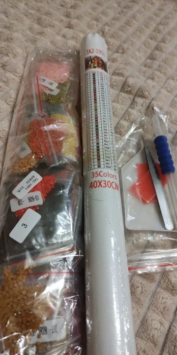 Заказ получила, очень довольна. Заказывала 03.02 получила 24.02 Полотно практически не помяло сь, все стразы в зип. пакетиках. Полотно на валике, потом ещё в воздушном пакете, и ещё в пакете. Также ванночка, ручка, клей, пинцет. Цвета все 45 шт. Ну, а хватит или нет, напишу после выкладки. И фото скину. Продавцу огромное спасибо, буду заказывать ещё. По отзывам, картина очень красивая. Если страз не хватит, напишу продавцу