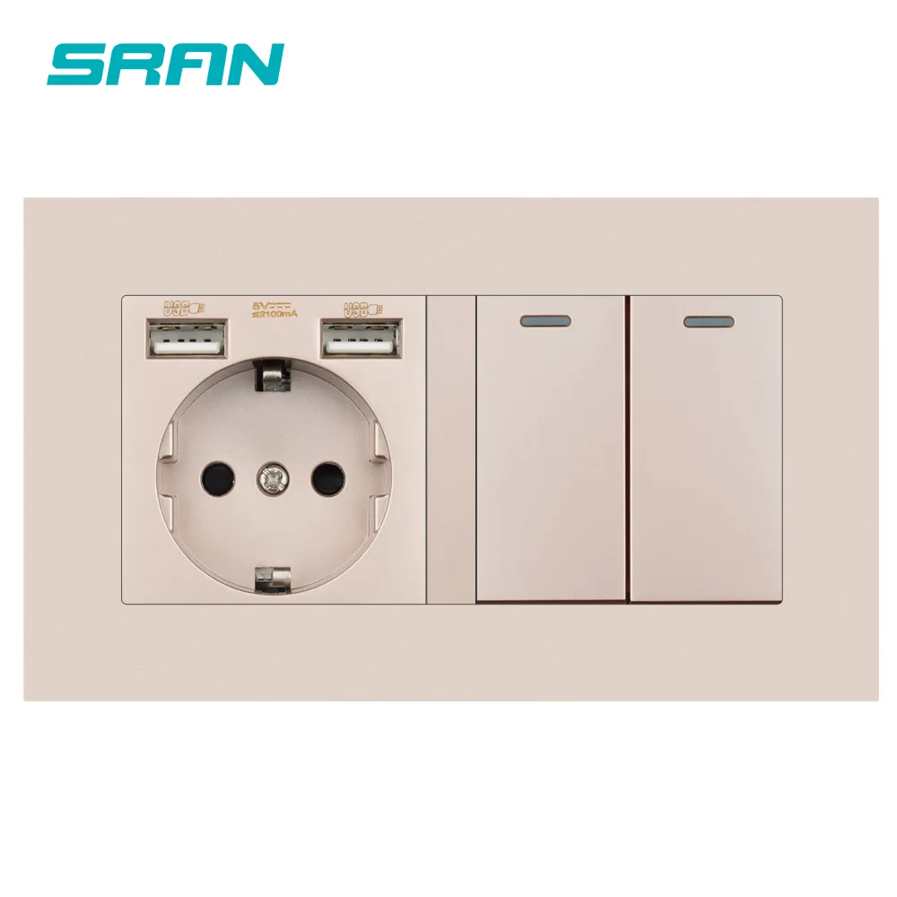 Европейская розетка SRAN с кулисным выключателем, настенная розетка с usb 220*86, 146 в, 16 А, панель из поликарбоната с выключателем, 2 клавиши, 12 канала