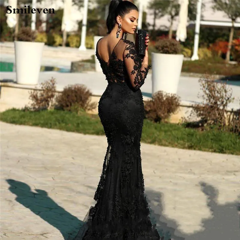 Женское вечернее платье-Русалка Smileven, черное кружевное платье с длинным рукавом и объемным рисунком, расшитое бисером, для вечеринки