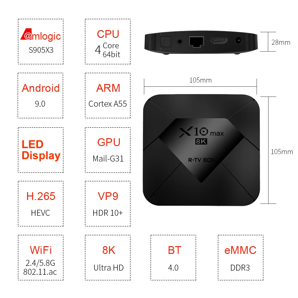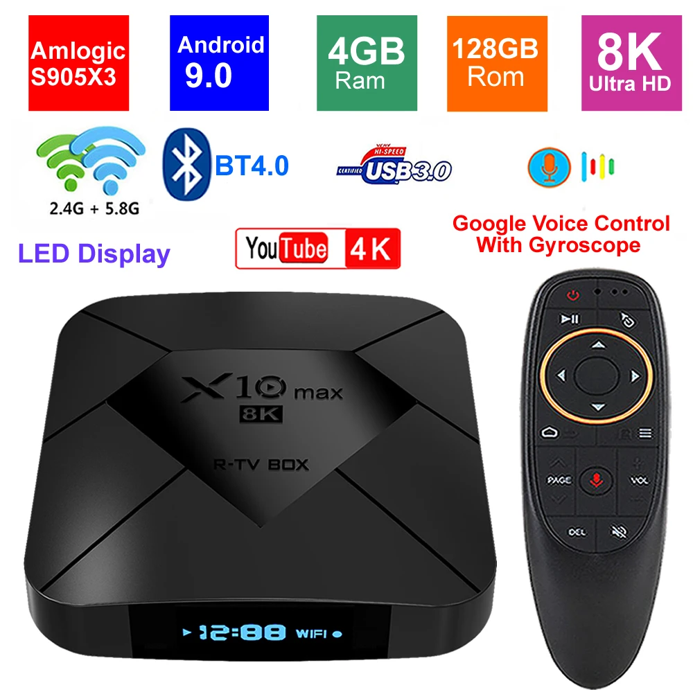 ТВ-приставка X10 MAX 8K, Amlogic S905X3, 4 Гб ОЗУ 128 Гб ПЗУ, Android 9,0, Двойной Wi-Fi, USB 3,0, BT4.0, светодиодный дисплей, HDR H.265, 8K, ТВ-приставка