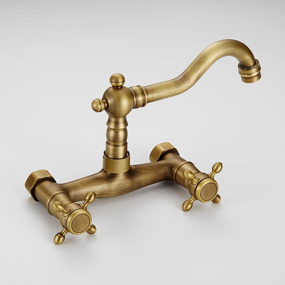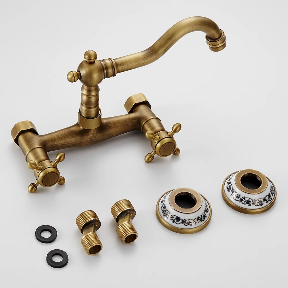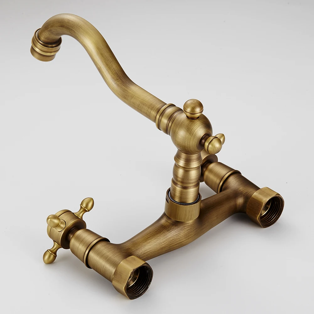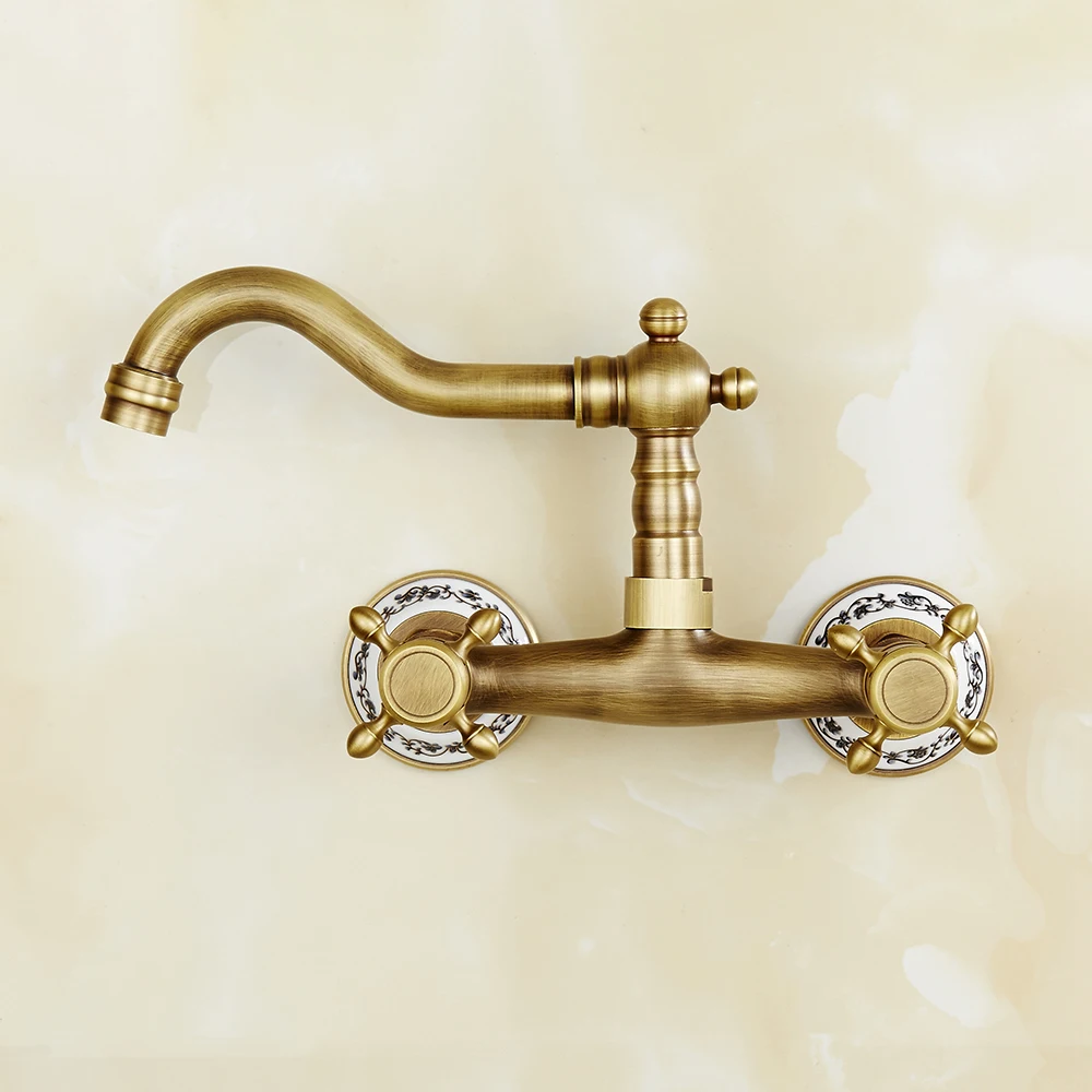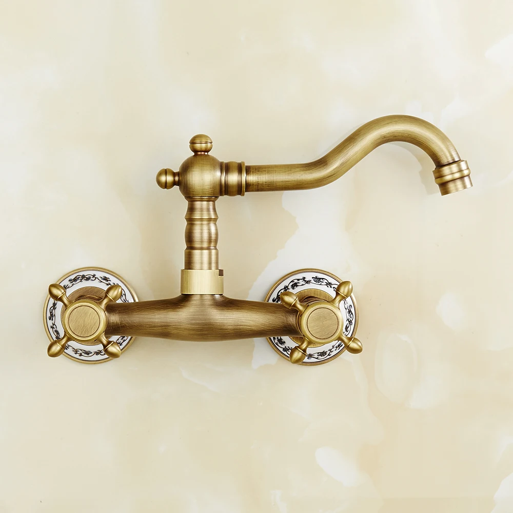 Античный латунный кухонный смеситель, настенный кран для горячей и холодной воды, вращающийся на раковину с двумя отверстиями