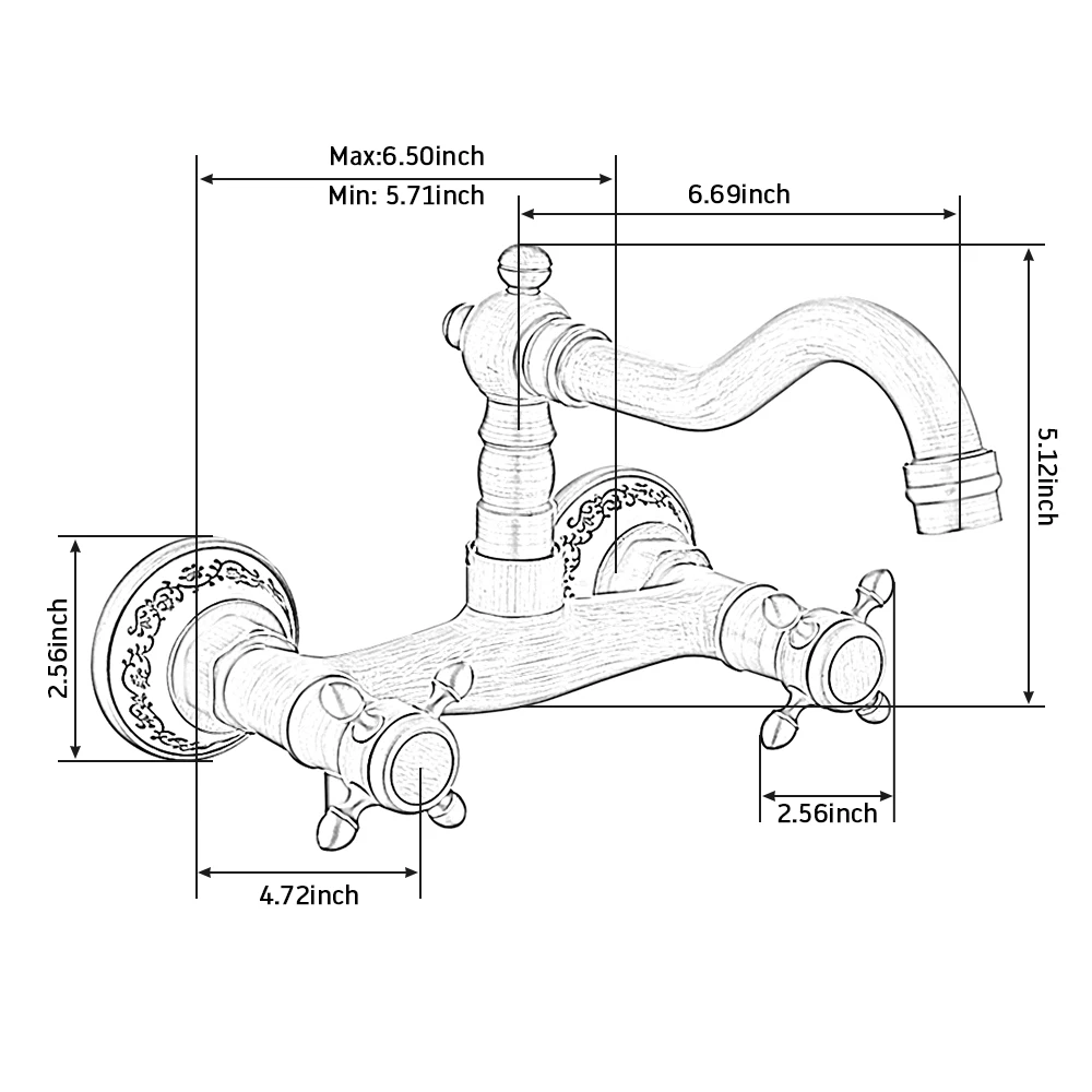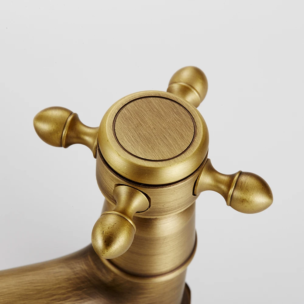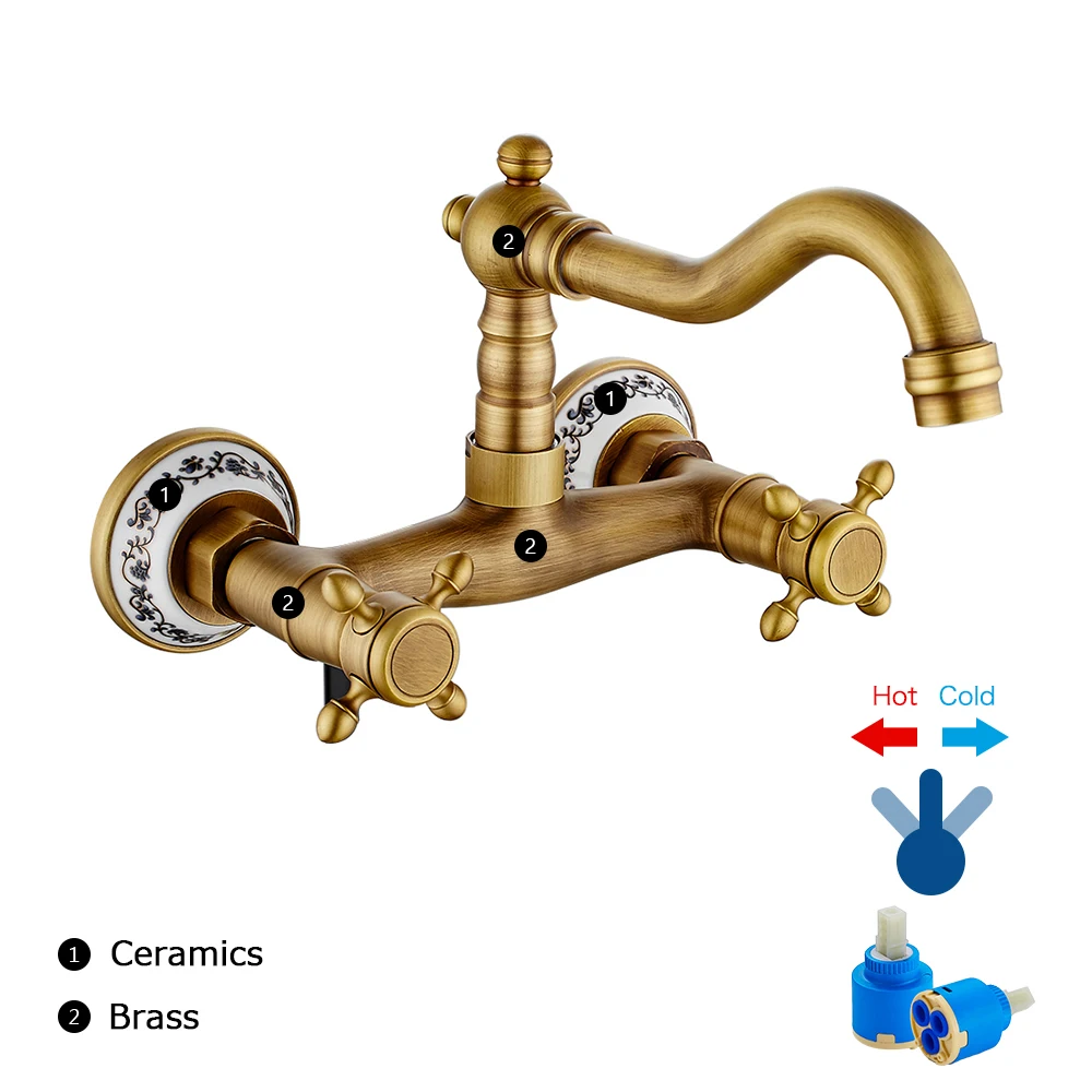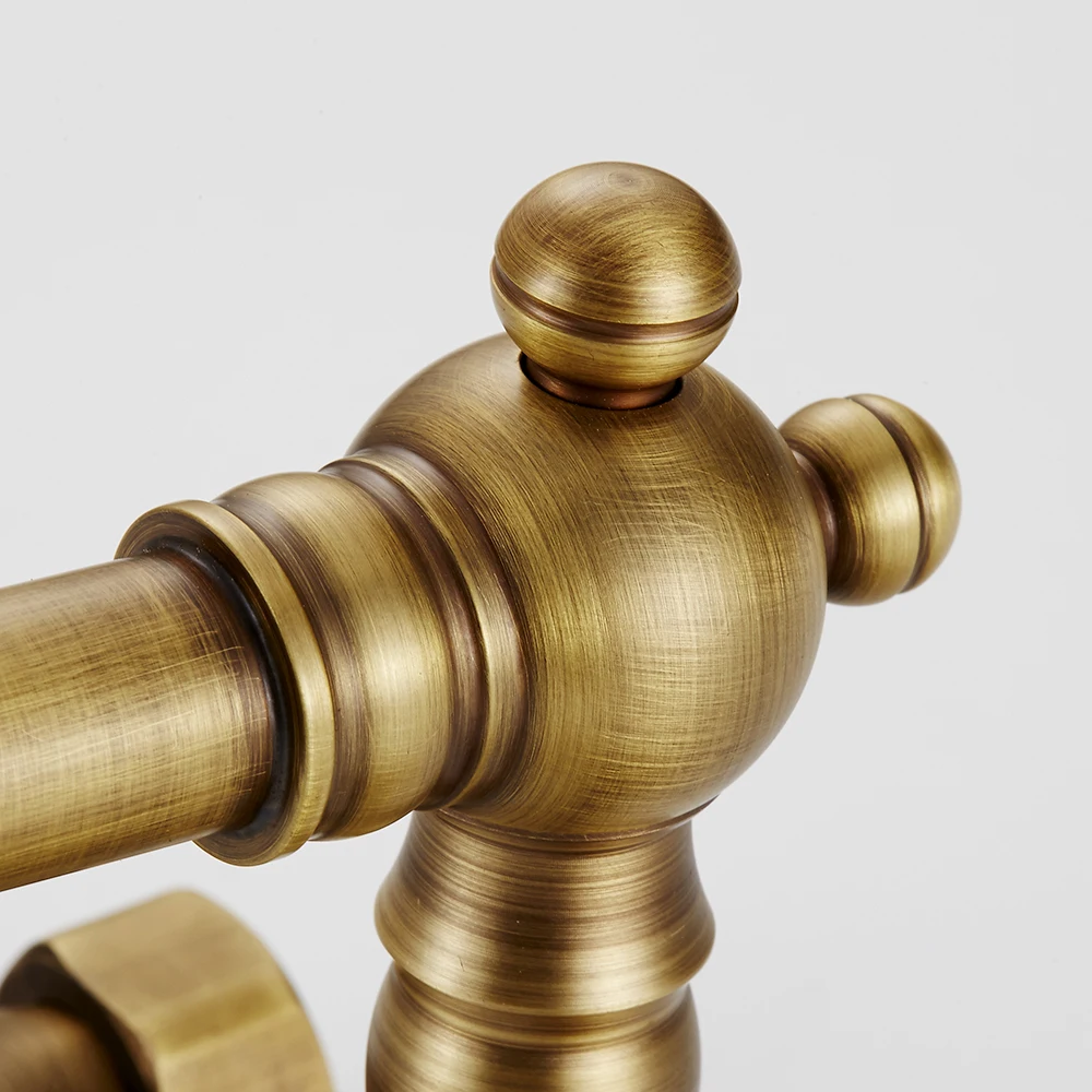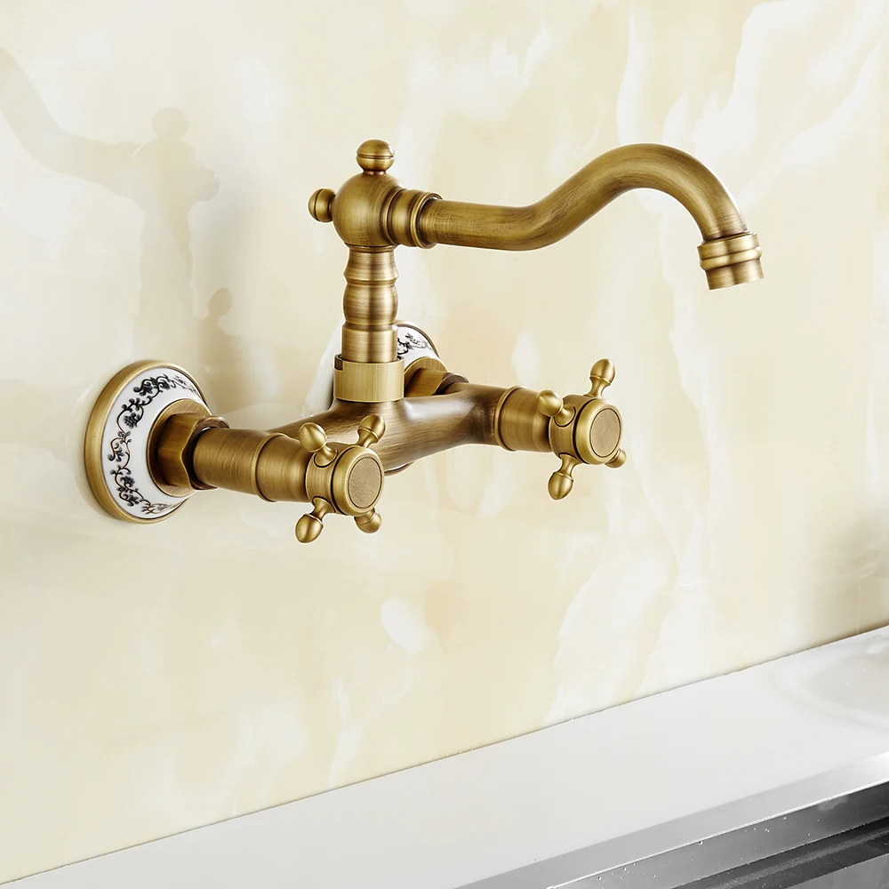 Античный латунный кухонный смеситель, настенный кран для горячей и холодной воды, вращающийся на раковину с двумя отверстиями
