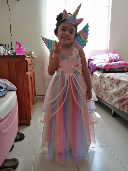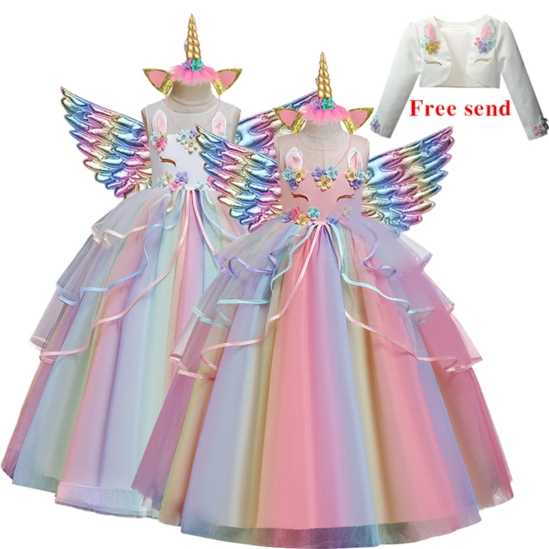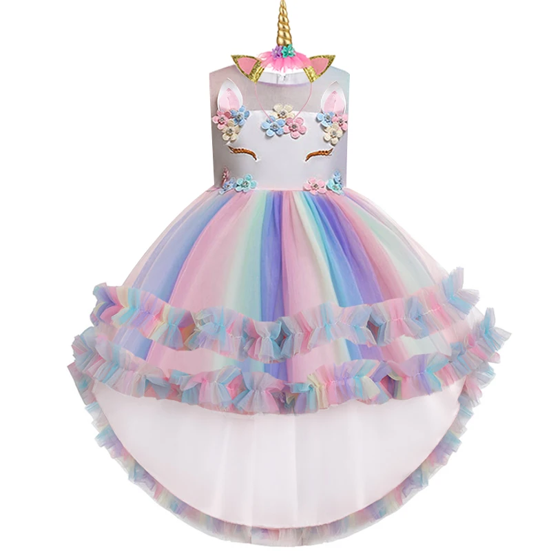 Длинное платье с единорогом для девочек, платье принцессы на день рождения, многослойное Сетчатое платье с подолом, праздничное платье с единорогом, свадебное платье с цветами для девочек