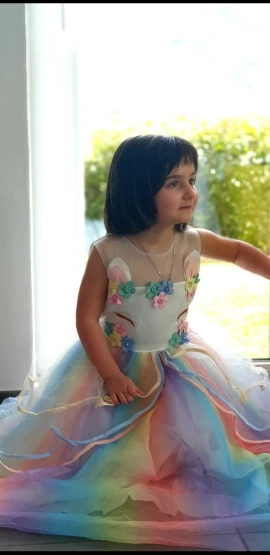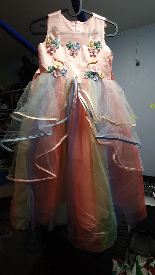 Платье не совсем соответствует тому, которое представлено на видео и фото.Платье смотрится красиво.Цвета, модель, длина, количество юбок, цветочки на лифе, всё точно так, как на фото.Но пышность не такая, это точно, юбка не настолько пышная, фалд мало, и смотрится довольно прямой.Так же качество материала желает лучшего.Ткани все дешёвые, особенно материал лифа смотрится очень дёшево.Качество пошива тоже низкое, везде торчат нитки, оверложено с изнанки кусками.Это всё испортило мнение о платье.Но в целом платье смотрится интересно, мультяшно, и впечатление у детей вызывает потрясающие, состояние настоящей принцессы.На фото еще не отглаженное, мятое, только получила.Отглажу, оденем подъюбник, тогда дополню отзыв.С продавцом не общалась, доставка в срок, как было указано.