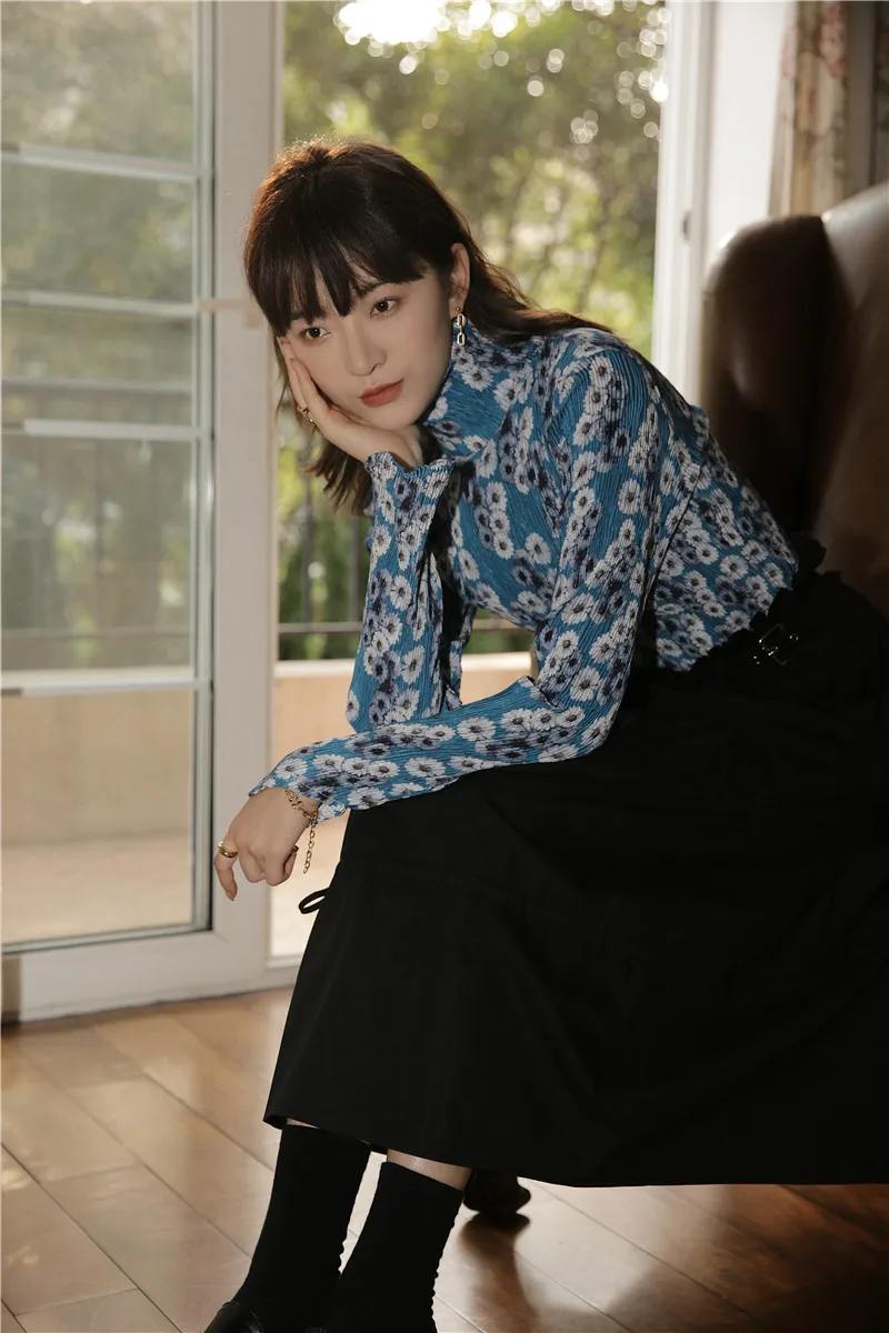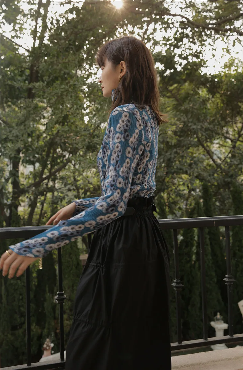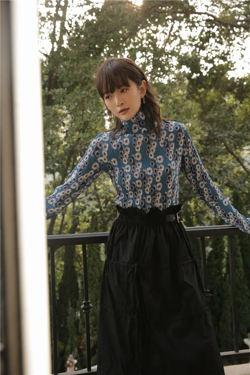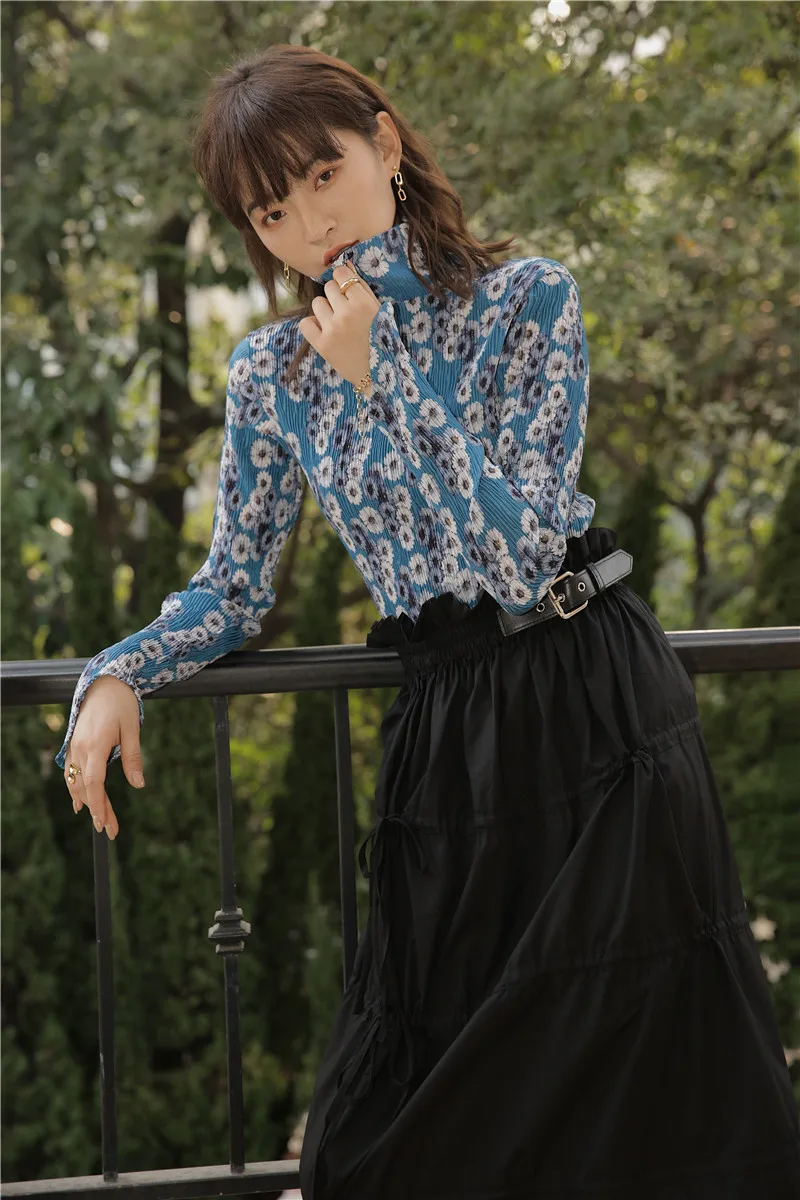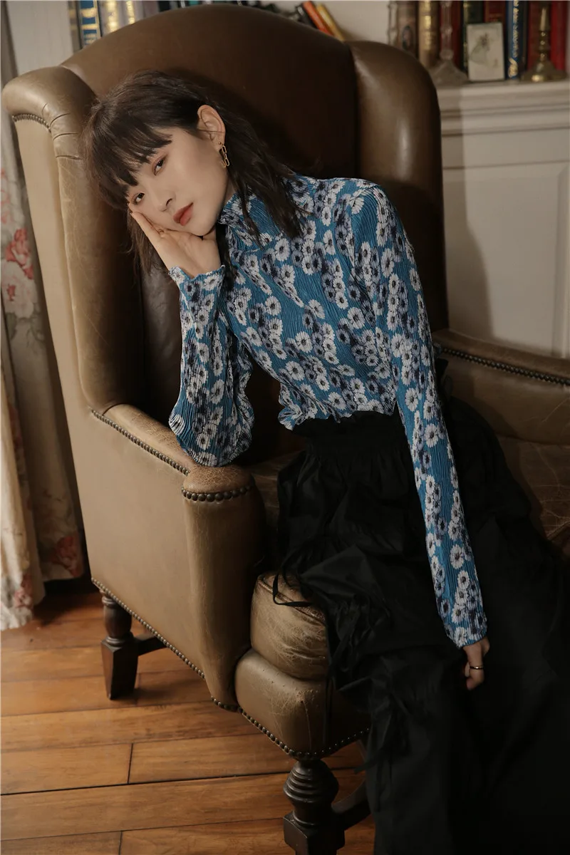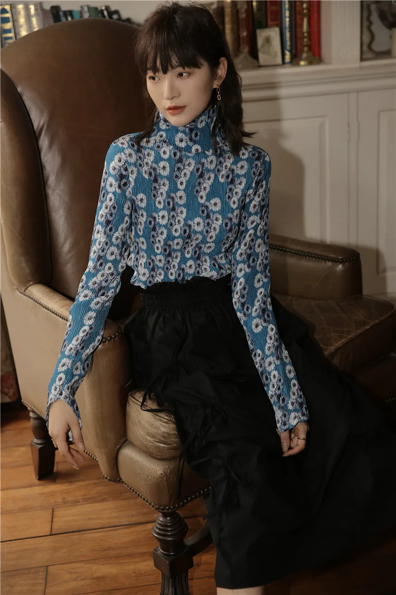Женская блузка с длинным рукавом CHEERART, синяя драпированная водолазка с цветочным принтом маргариток, повседневные топы, одежда