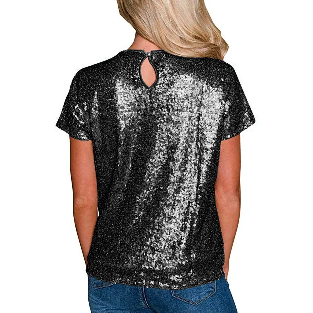 Женская туника с блестками # Z25, повседневные элегантные топы с круглым вырезом и коротким рукавом, Клубные футболки для девочек