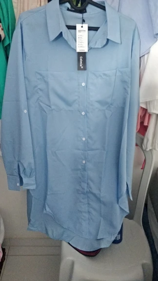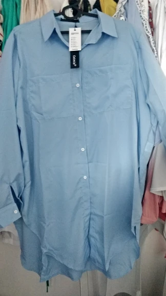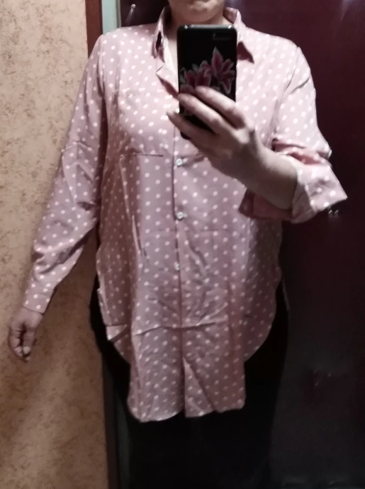Размер 5XL на наш 54 нормально, свободно. На 52 большевата. Рукав на рост 163 длинный, можно убрать на ширину манжета. Разрезы сбоку чуть ниже талии начинаются. Прошита аккуратно. Ткань тонкая, просвечивает, синтетика. Продавец ответственный.