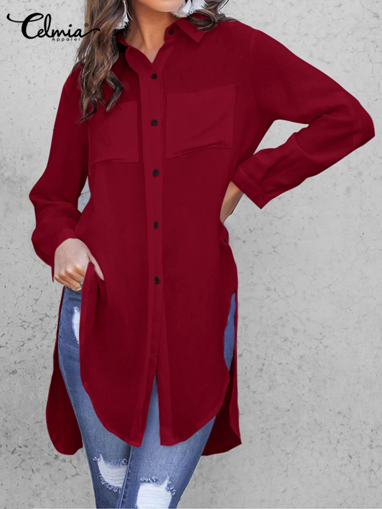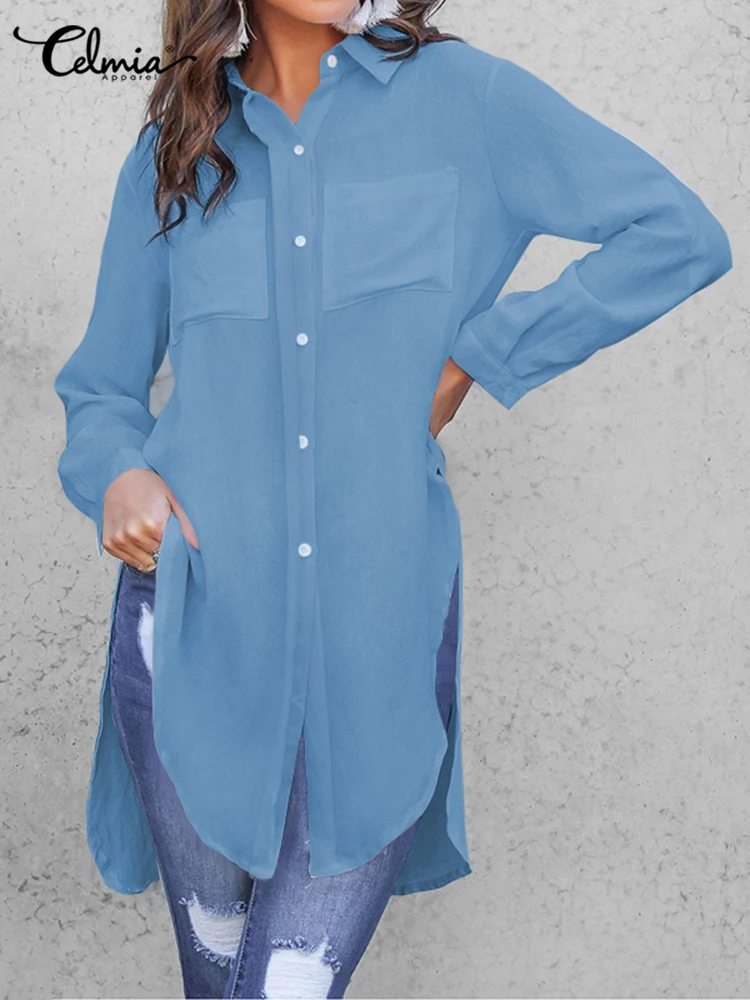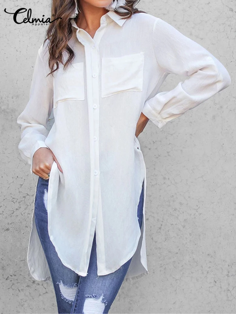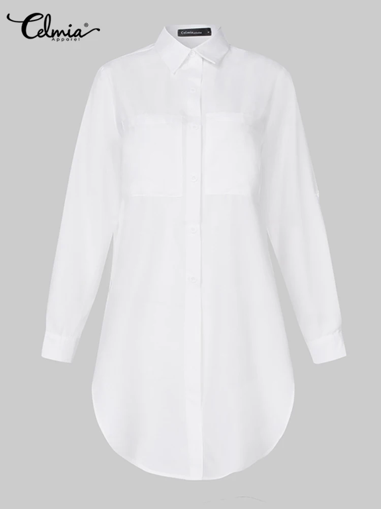 Элегантные летние белые рубашки Celmia 2022, женские блузки с длинным рукавом, отложным воротником, туника, топы, повседневные свободные однотонные праздничные Блузы