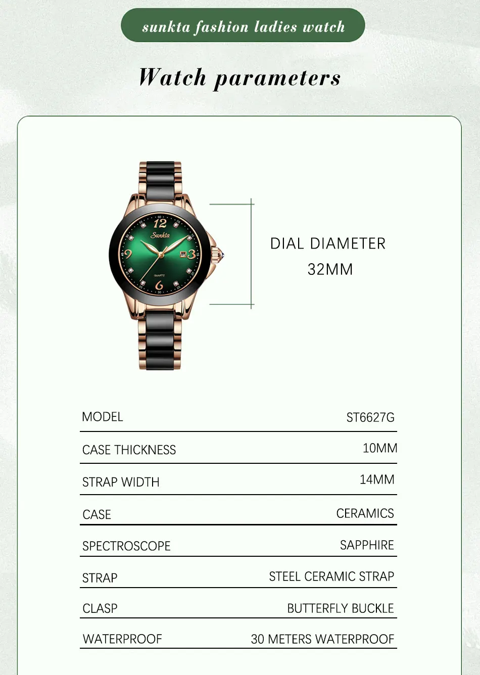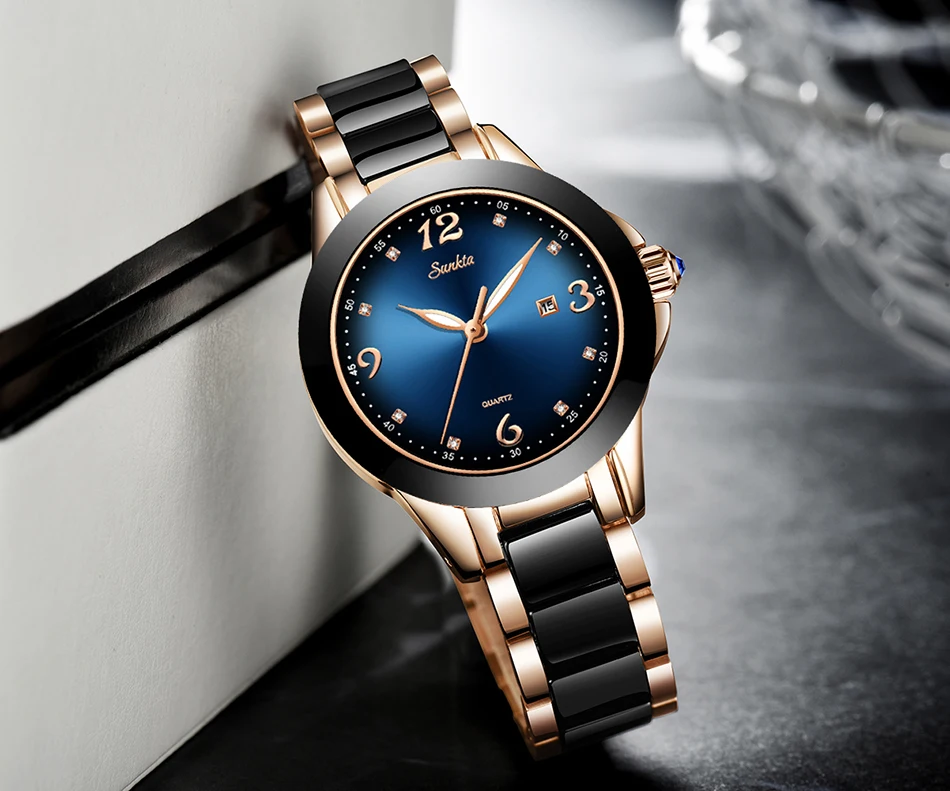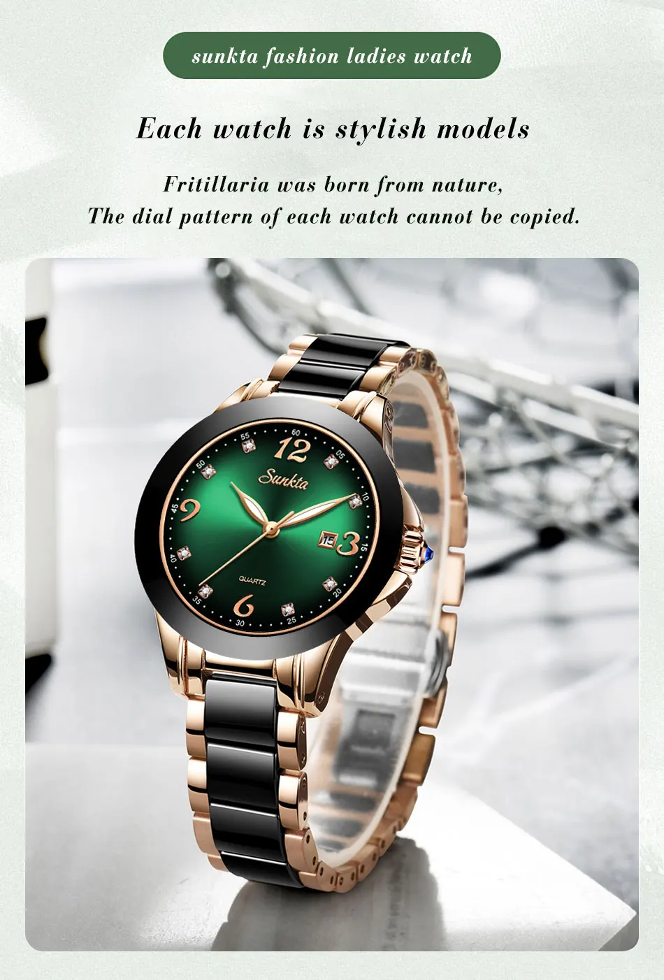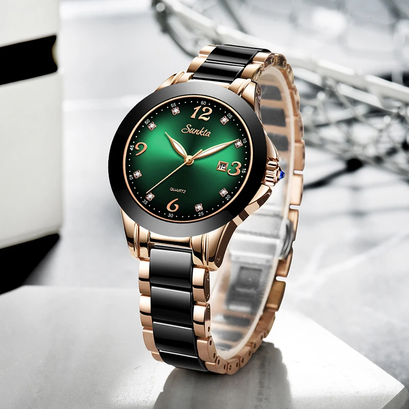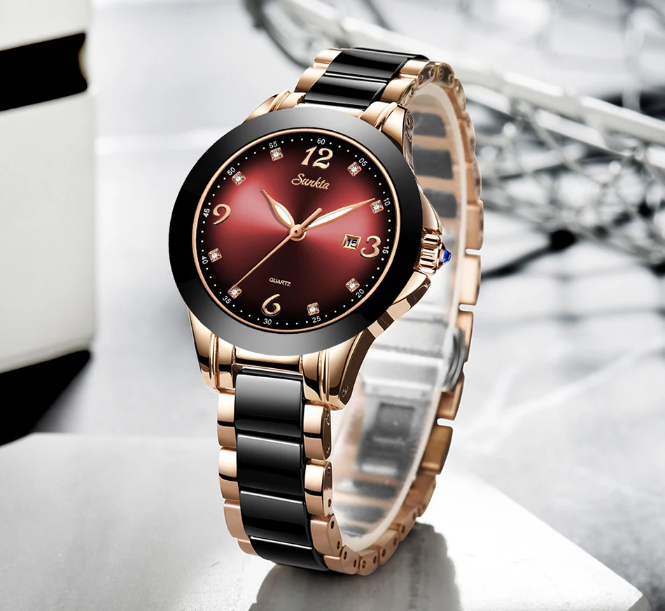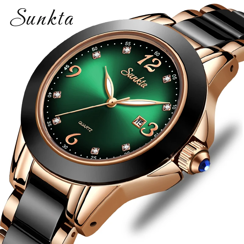 SUNKTA 2022 Модные женские наручные часы Роскошный бренд кристалл платье женские часы Стразы керамические наручные часы кварцевые часы + коробка