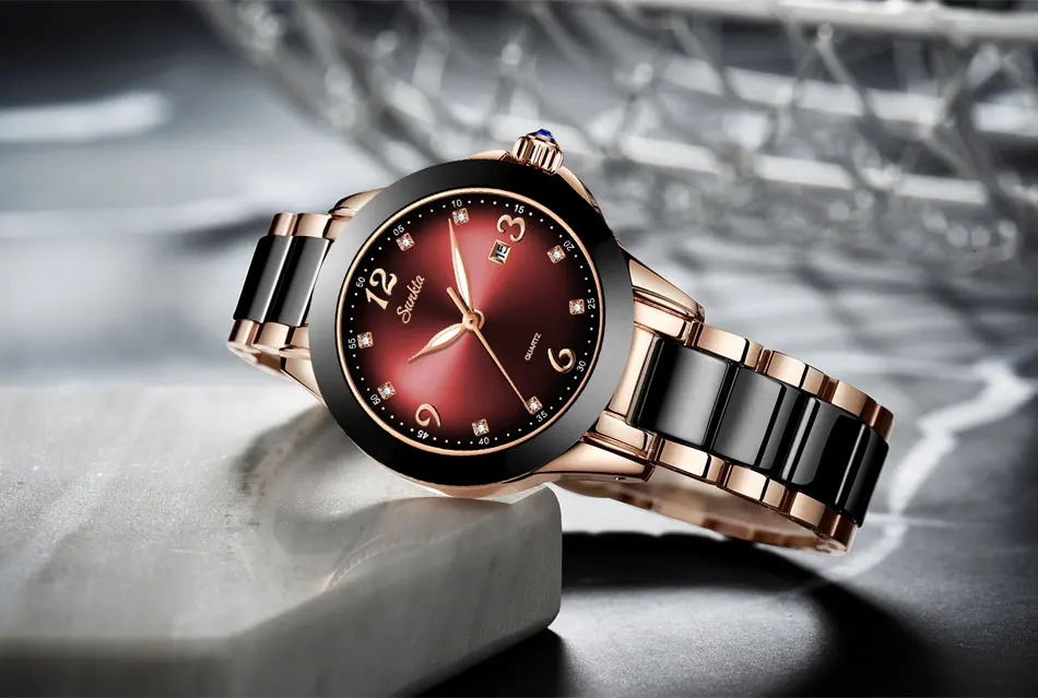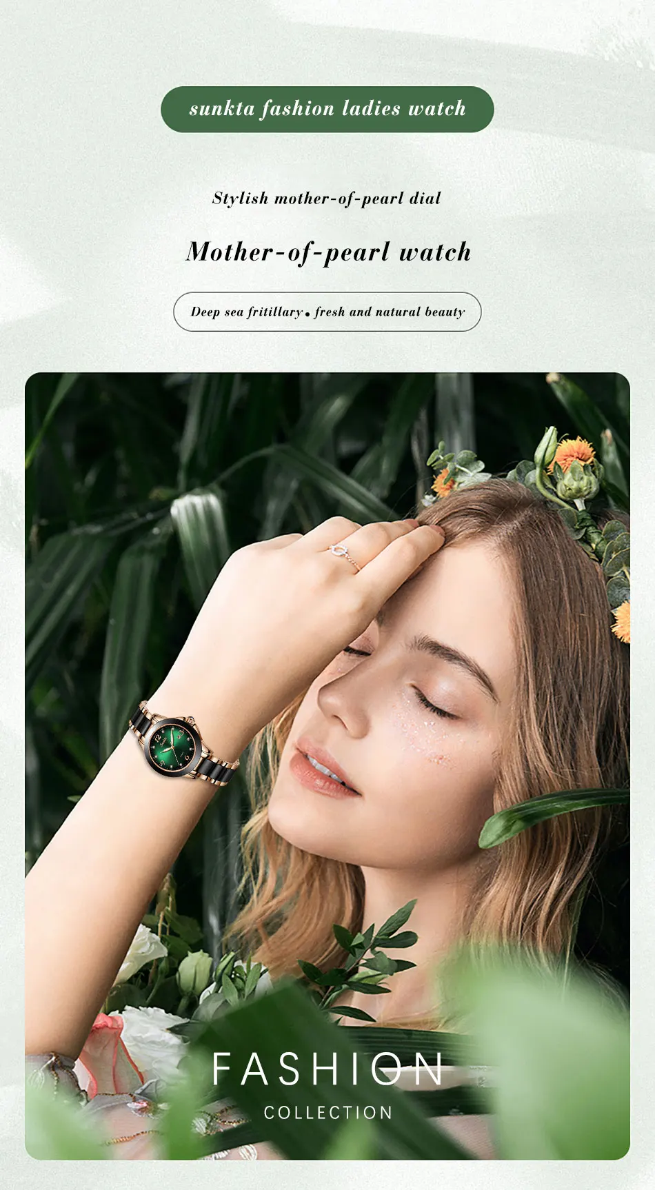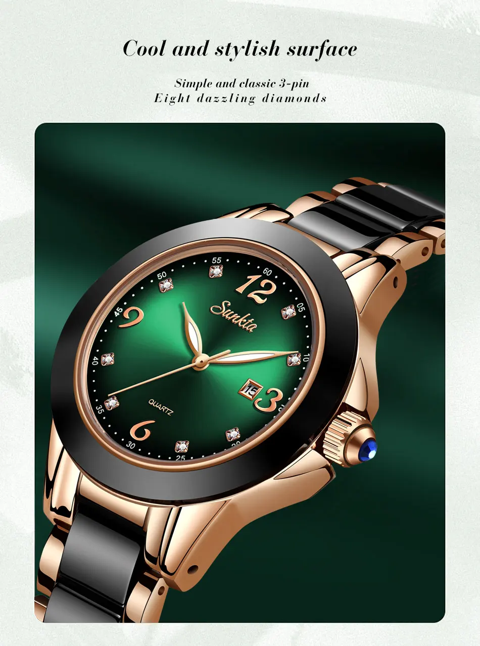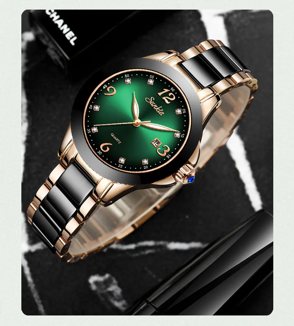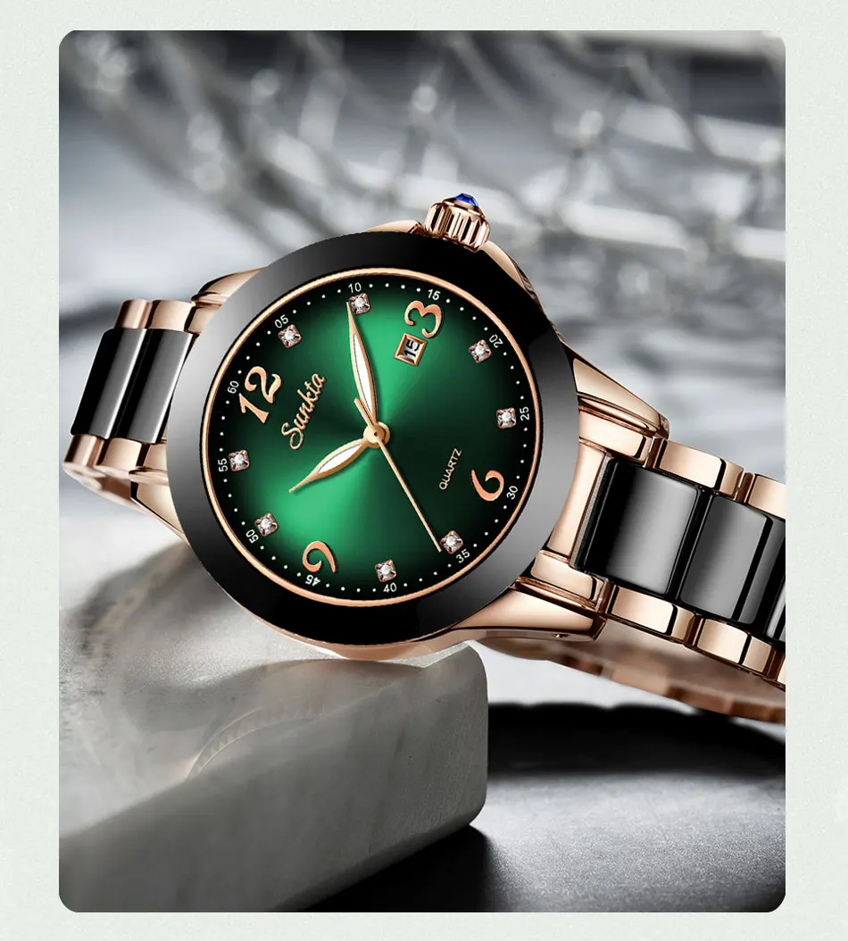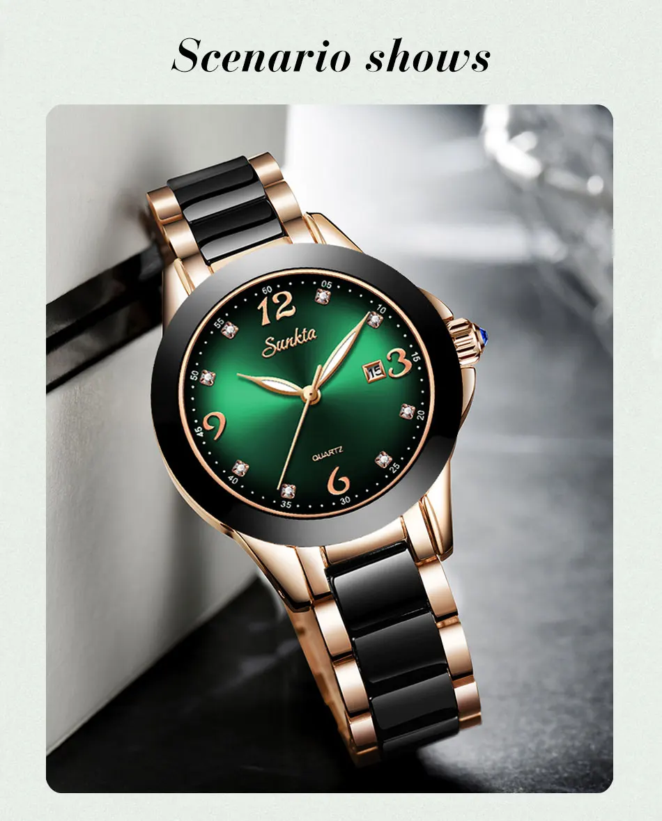 SUNKTA 2022 Модные женские наручные часы Роскошный бренд кристалл платье женские часы Стразы керамические наручные часы кварцевые часы + коробка