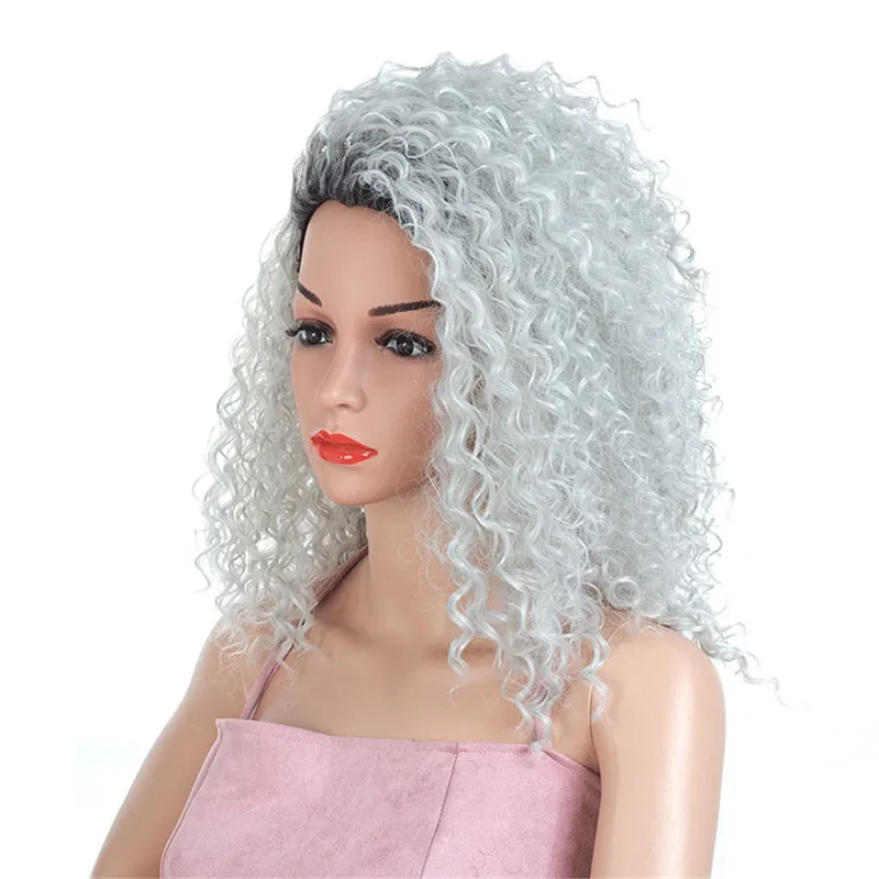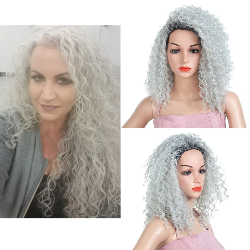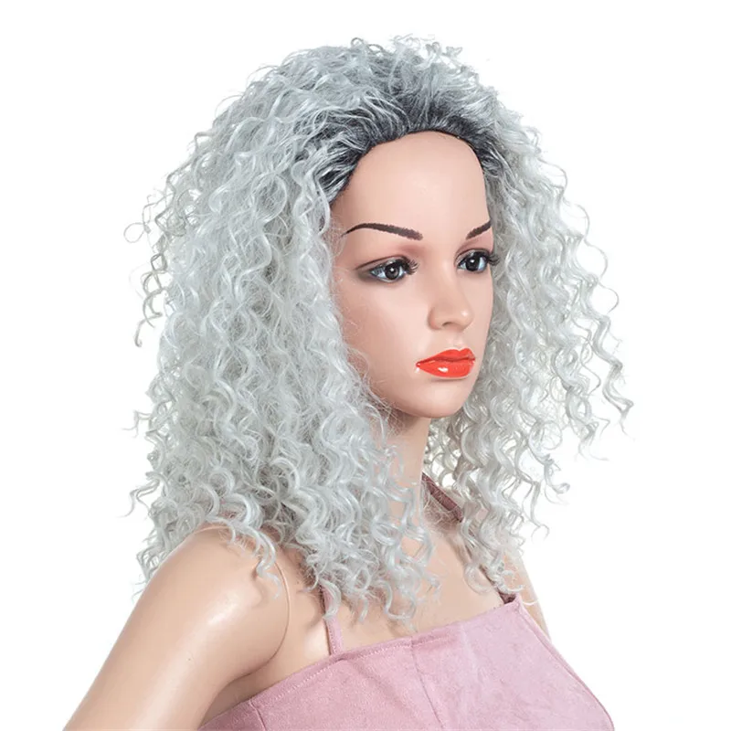 Парик Hywamply из синтетических волос, 16 дюймов, средней длины, кудрявый, кудрявый, серебристый, серый, черный, корень, Омбре, парики для косплея, бесплатная часть