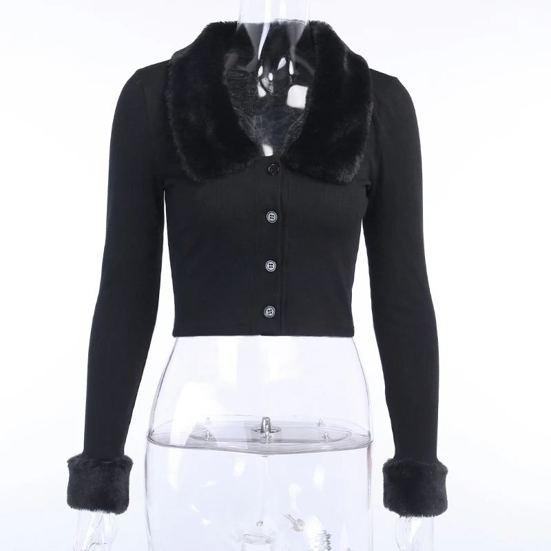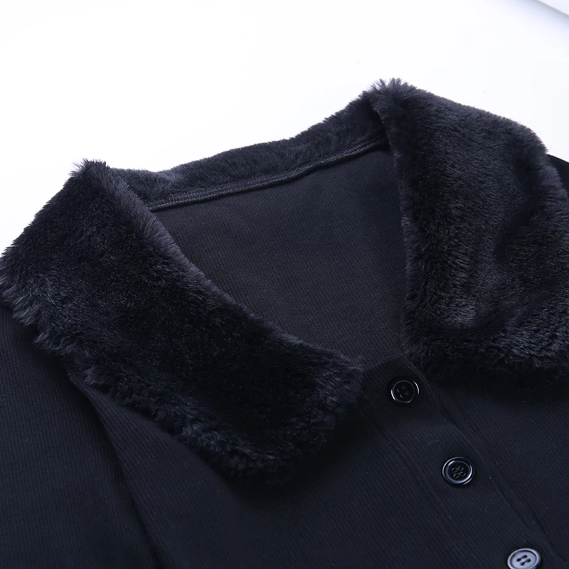 WannaThisЧерная Женская пушистая рубашка с длинным рукавом и отложным воротником на пуговицах, осенняя женская рубашка, теплый укороченный топ, тонкие эластичные повседневные топы