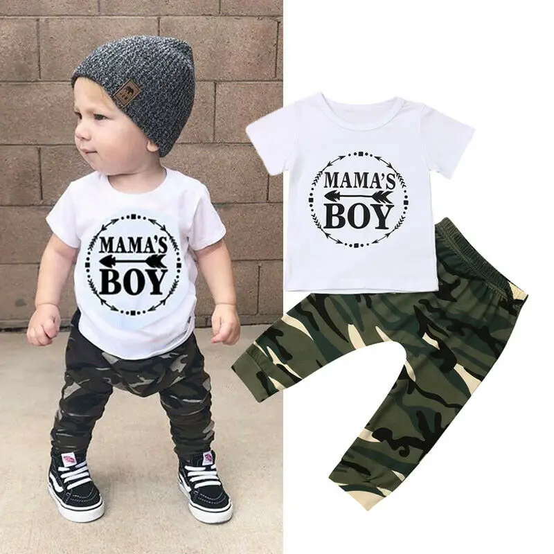 Летние Новые Модные Одежда для новорожденных малышей хлопковые футболки с надписью топы, футболка и камуфляжные штаны, комплект из 2 предметов, летняя одежда для детей