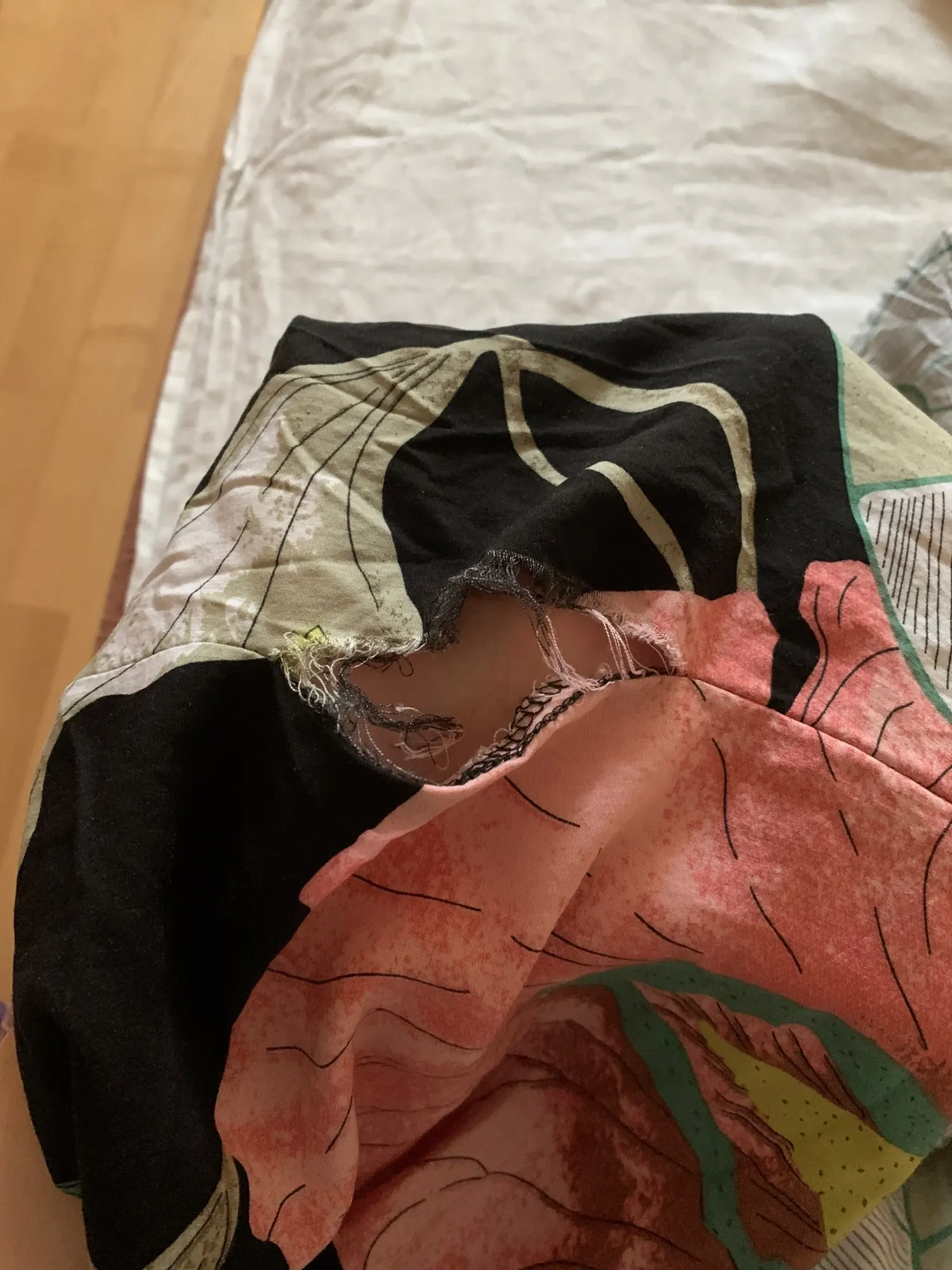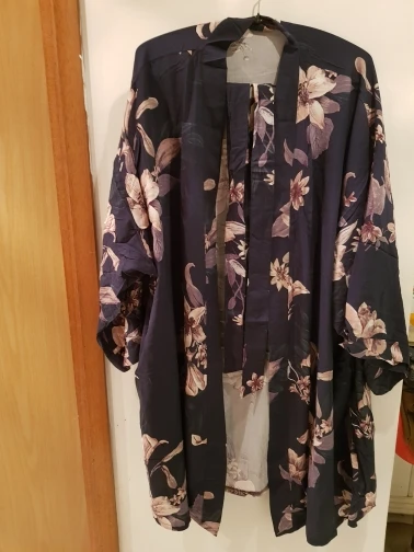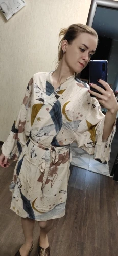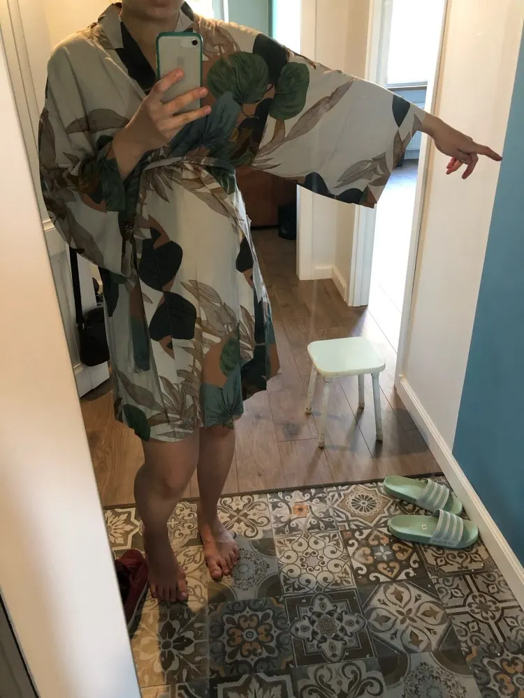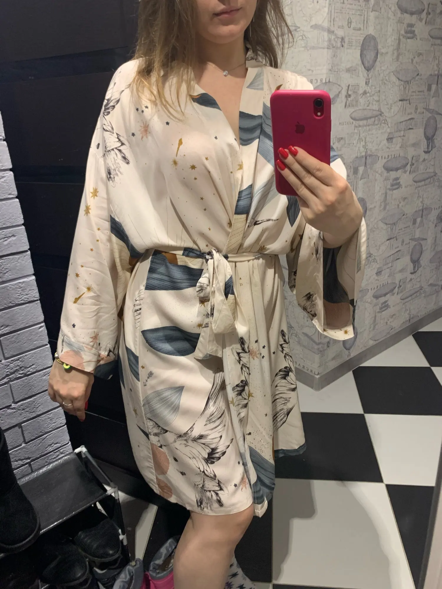 Халат объемный, подойдёт на любой размер, хотела чтобы он был более изящным. В жизни цвет не такой, тусклее и вместо светлого фона принта - серый. В целом нормально, но могло бы быть и лучше