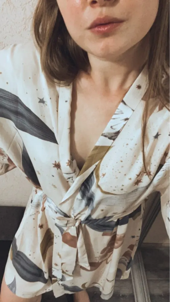 Szlafroczek jest dokładnie taki sam jak na zdjęciu! Piękny, materiał miły, lejący i naturalny, coś jak wiskoza lub cieniutka bawełna. Przy wzroście 160 cm i 57 kg wagi rozmiar S jest w sam raz, lekko luźny, ale taki powinien być szlafrok! Wyglada jak z oysho. POLECAM Z CAŁEGO SERCA! Dostawa do Polski 2 tygodnie.
