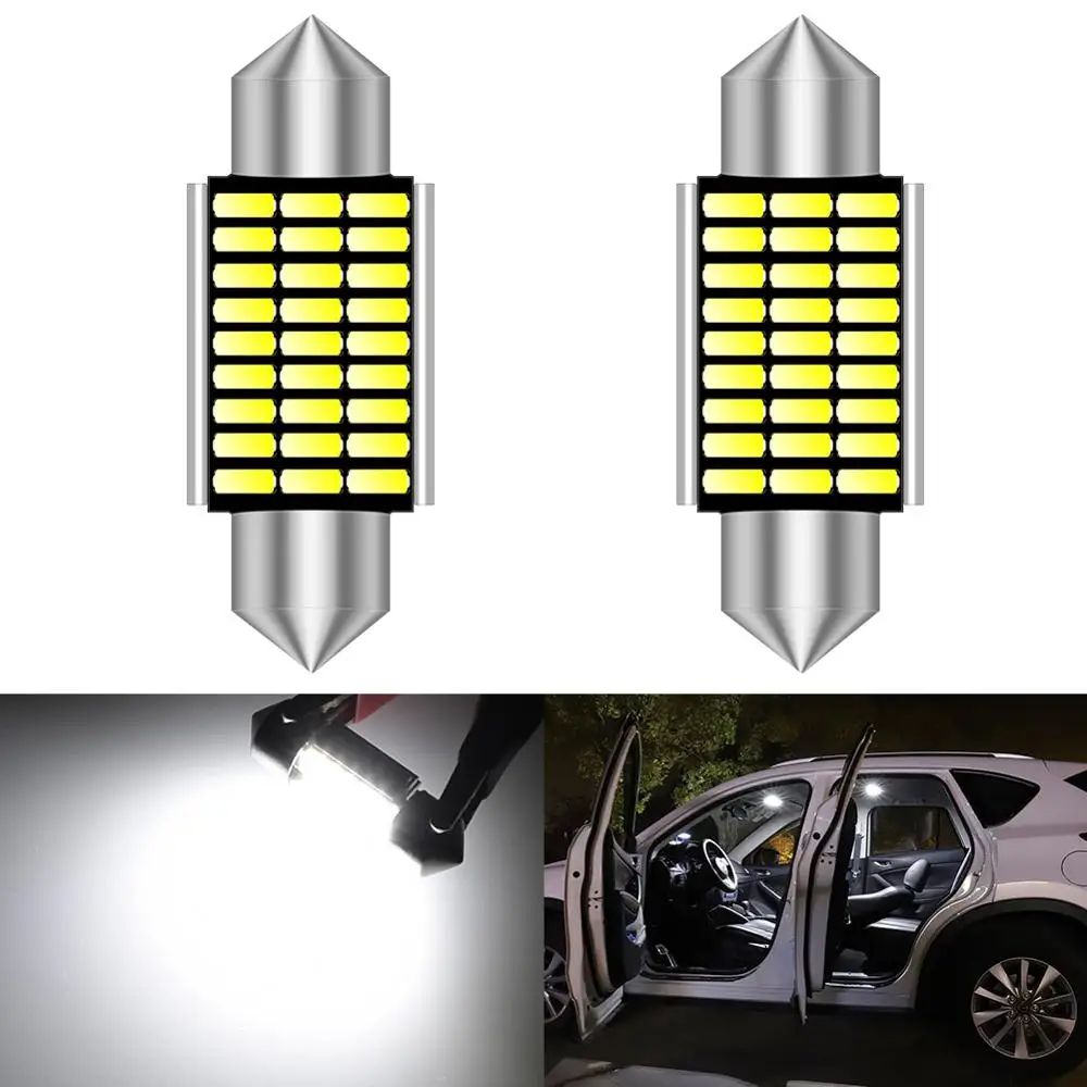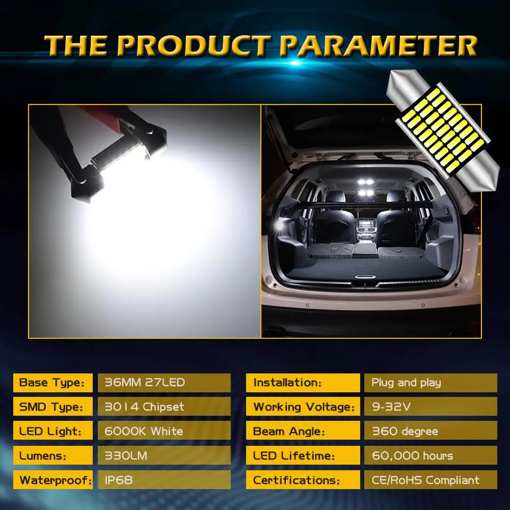 Гнездо товара: C5W Festoon-31mm/36 мм/39 мм/41 мм Светодиодный Тип: 3014SMD светодиодный чип Рабочее напряжение: DC12V Светодиодный Цвет: белый Цветовая температура: 6000K