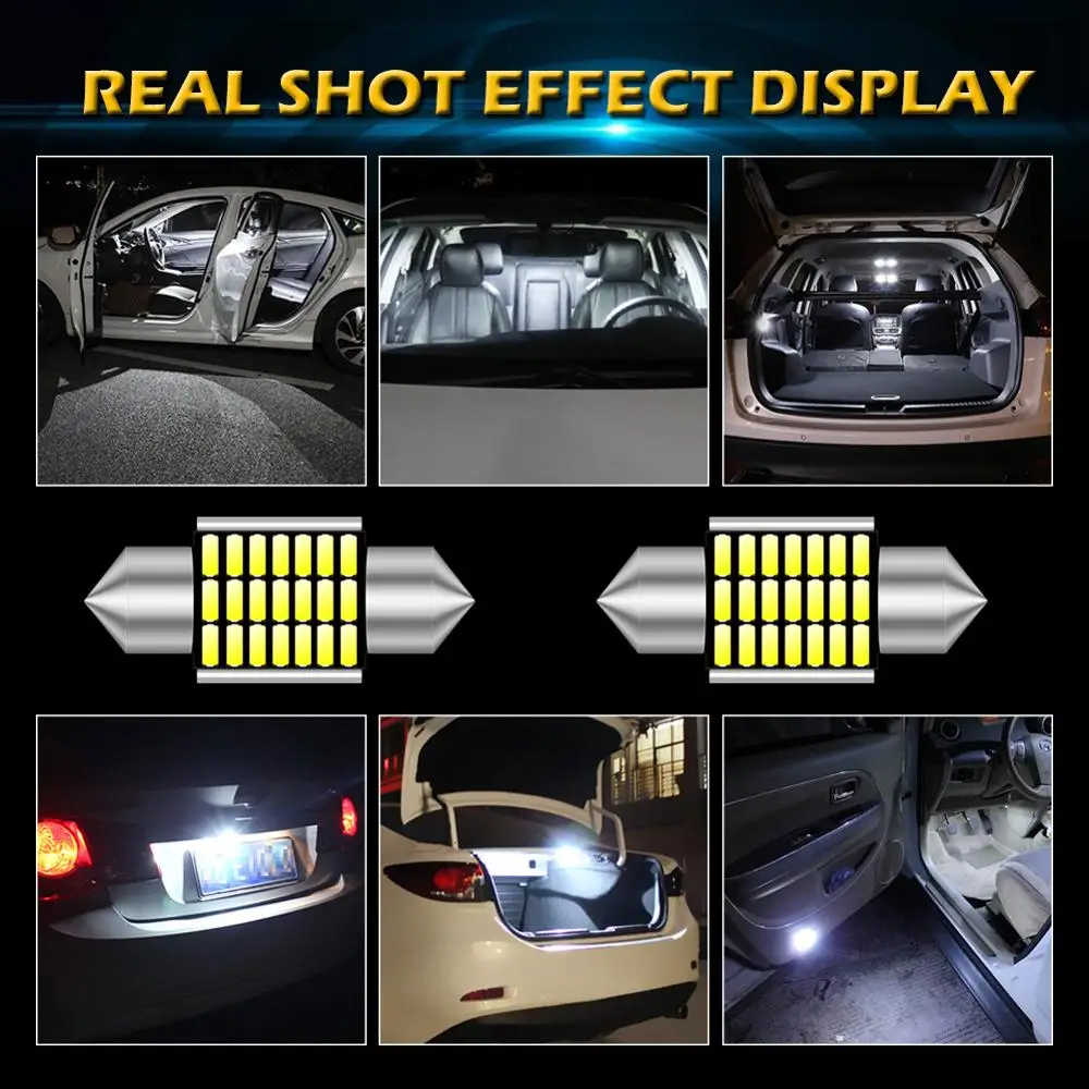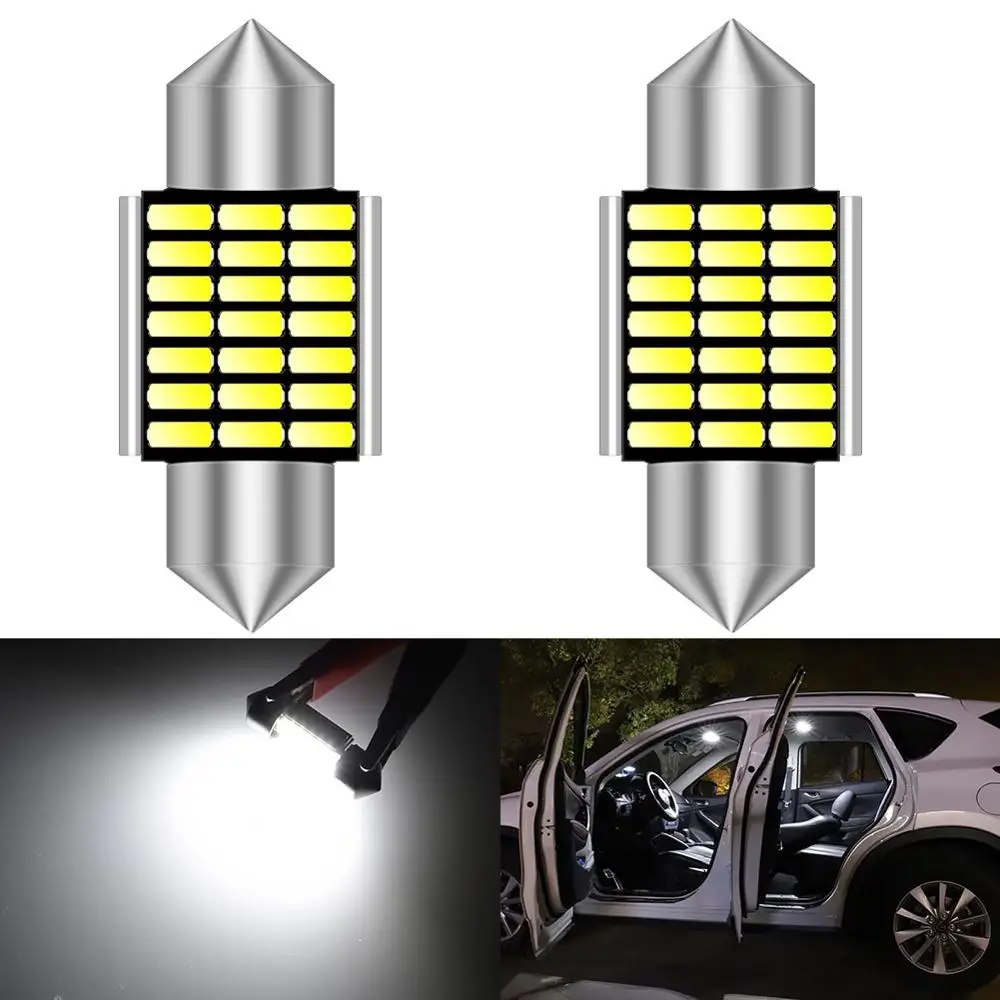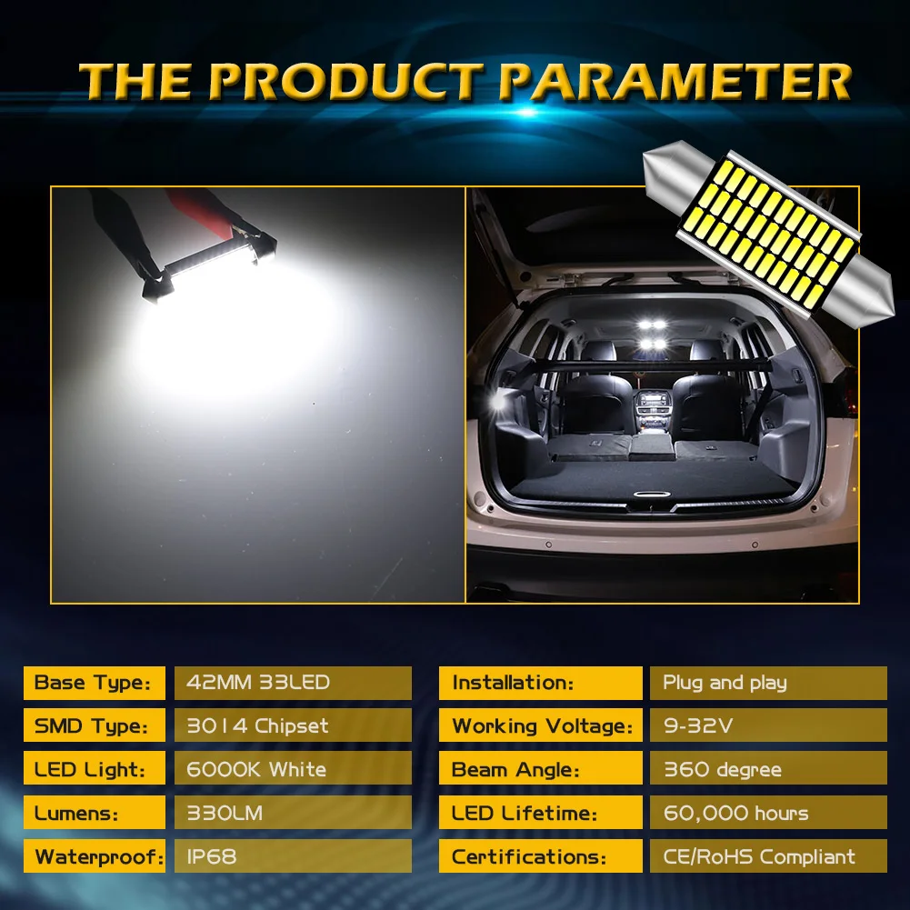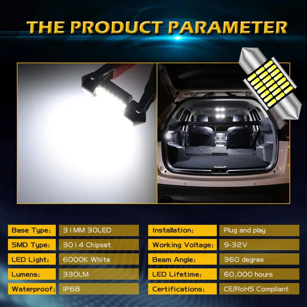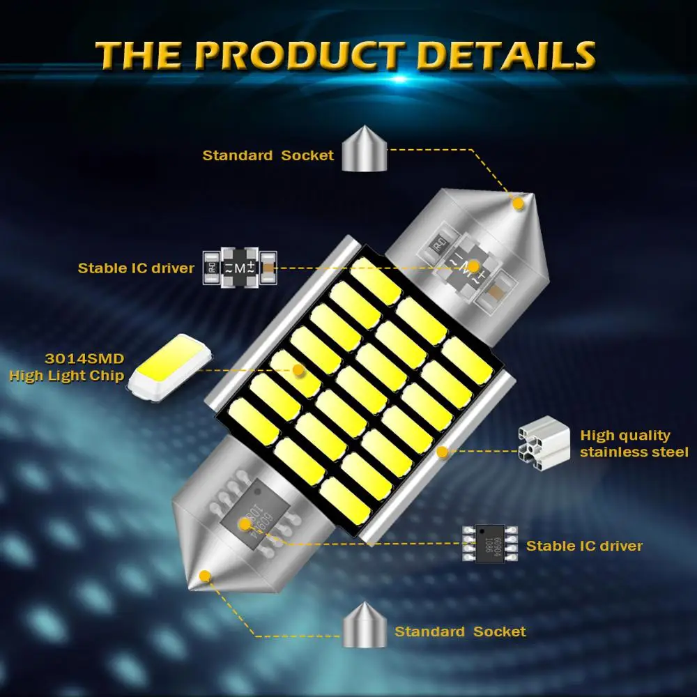 Гнездо товара: C5W Festoon-31mm/36 мм/39 мм/41 мм Светодиодный Тип: 3014SMD светодиодный чип Рабочее напряжение: DC12V Светодиодный Цвет: белый Цветовая температура: 6000K