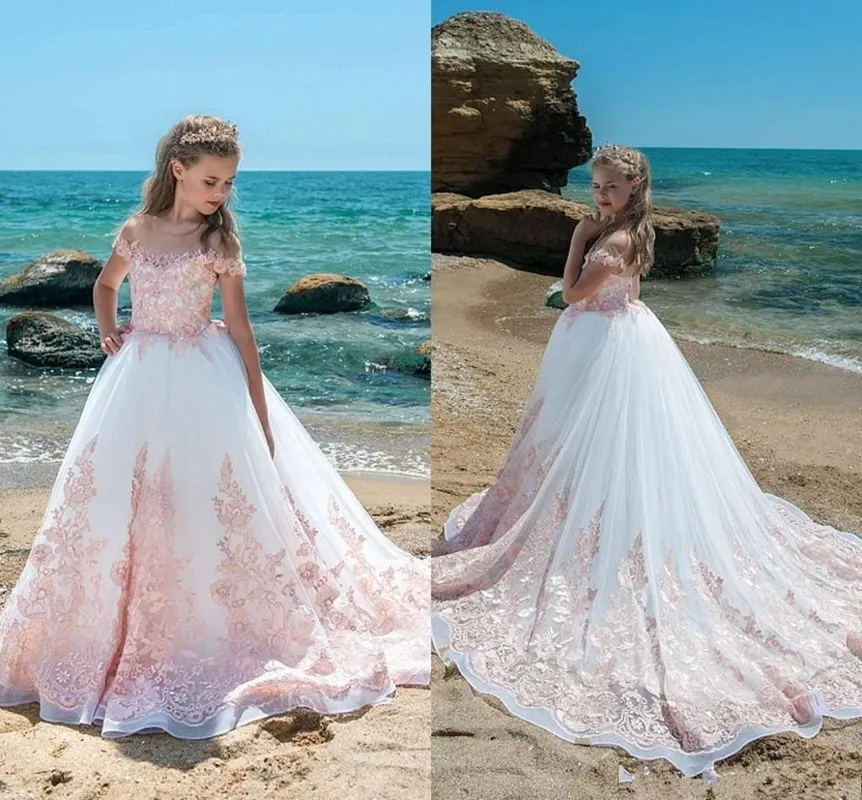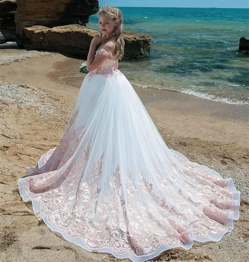 Новые кружевные платья с цветочным рисунком для девочек, пышные розовые платья трапециевидной формы с аппликацией на шею и шлейфом для дня рождения и причастия
