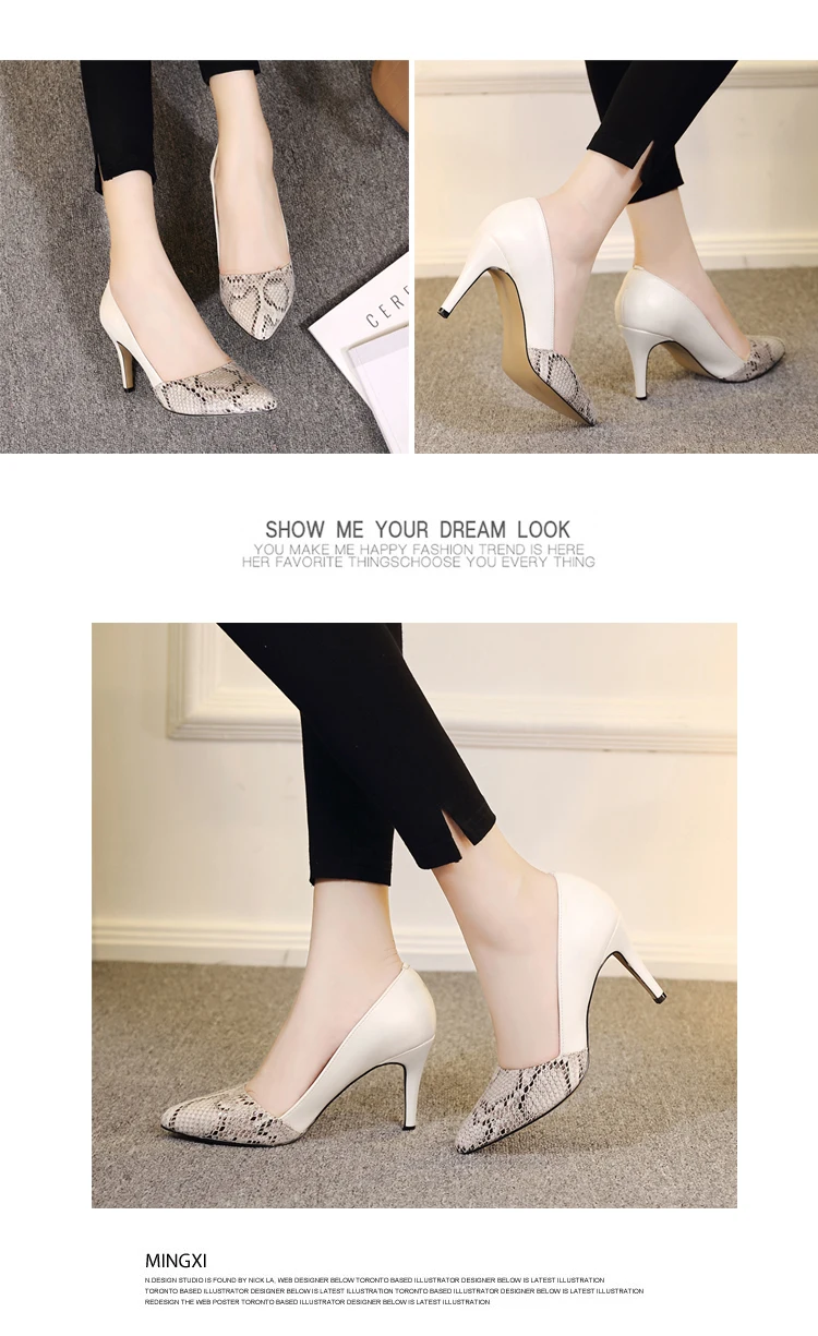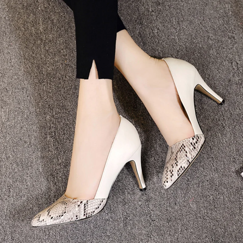 Модельные туфли на высоком каблуке 5 см и 8 см; Женские туфли-лодочки со змеиным узором; Офисные туфли с острым носком; zapatos mujer; 7933C