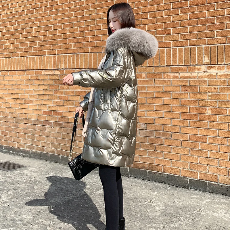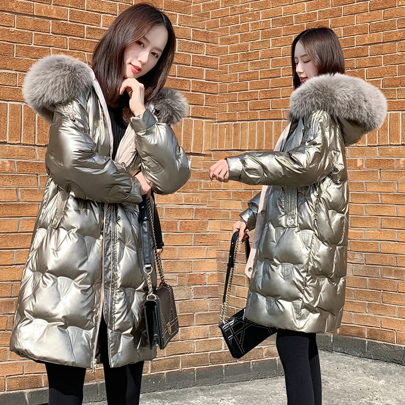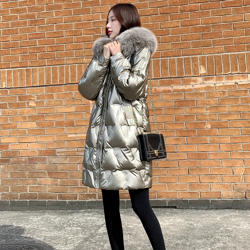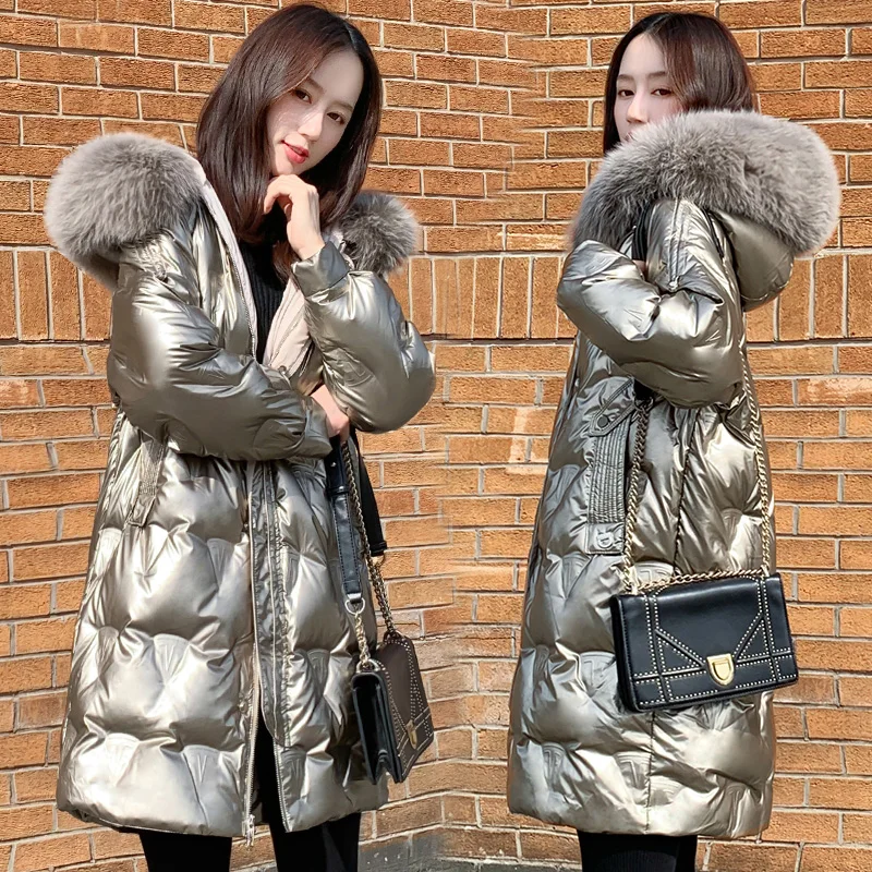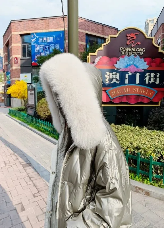 Парка женская зимняя, с меховым воротником, золотистого цвета, F857